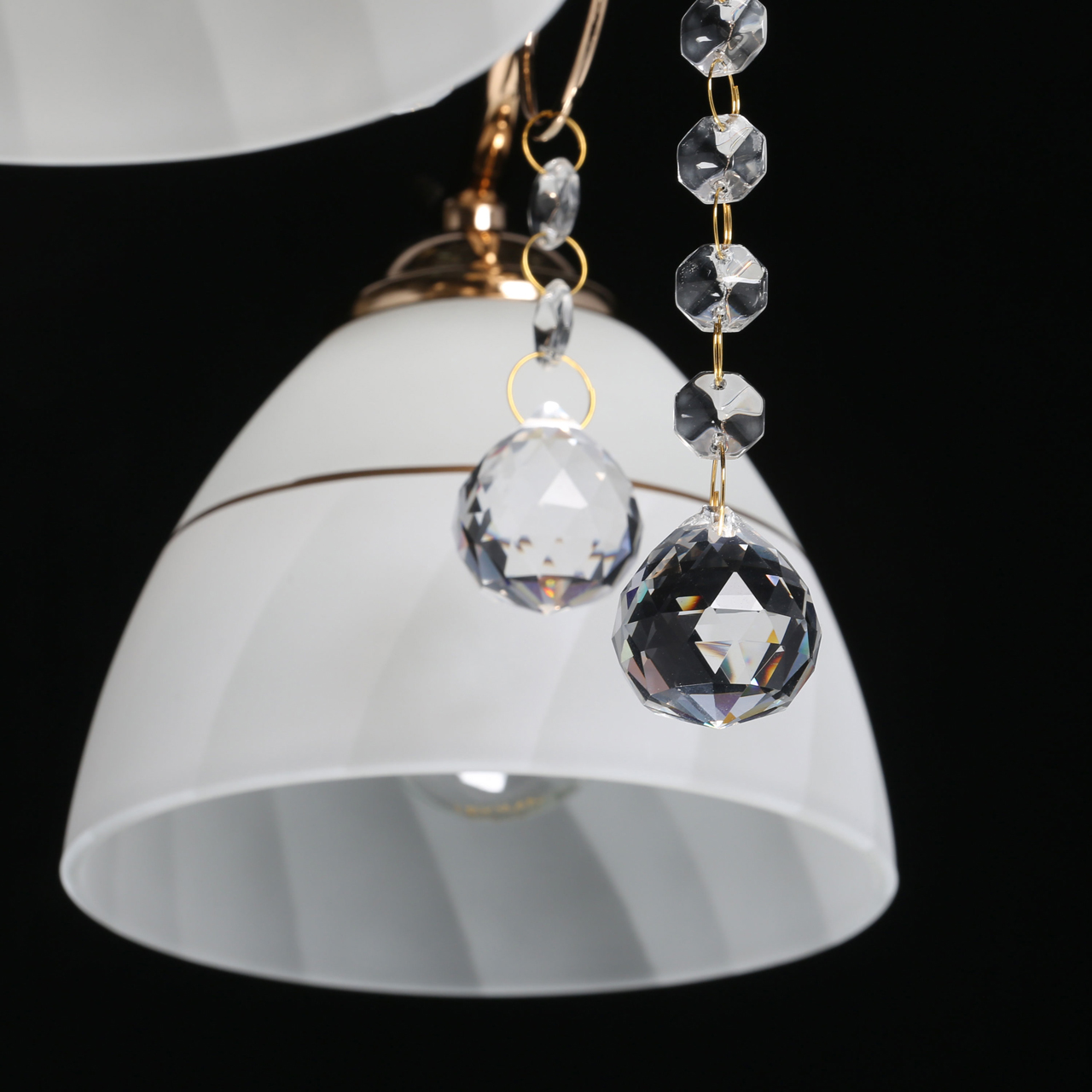 Основание светильника выполнено из сплава металла и гальванизировано в цвет французского золота. Стеклянные плафоны матированы и окрашены вручную в белый цвет. Полоска золотого цвета отделяет окрашенную часть от матированной.Тип помещения
