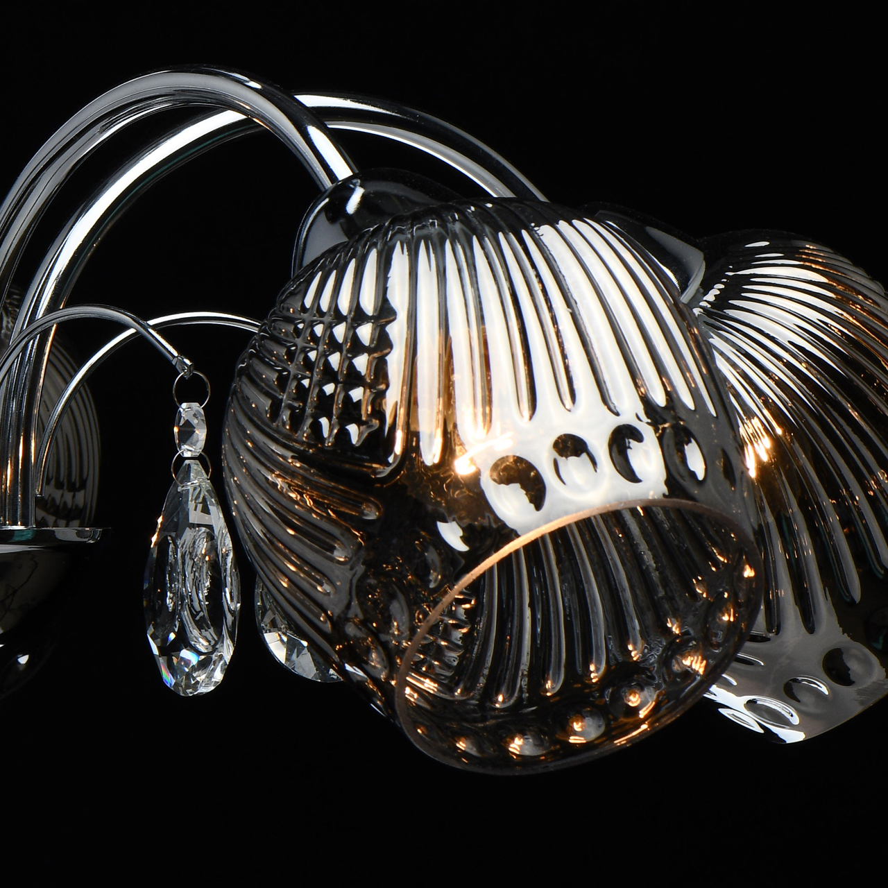 Металлическое основание светильника гальванизировано в цвет хрома. Рельефные стеклянные плафоны отлиты в сложную форму и гальванизированы в дымчатый цвет. Светильник декорирован прозрачным хрусталем миндалевидной формы.Тип помещения