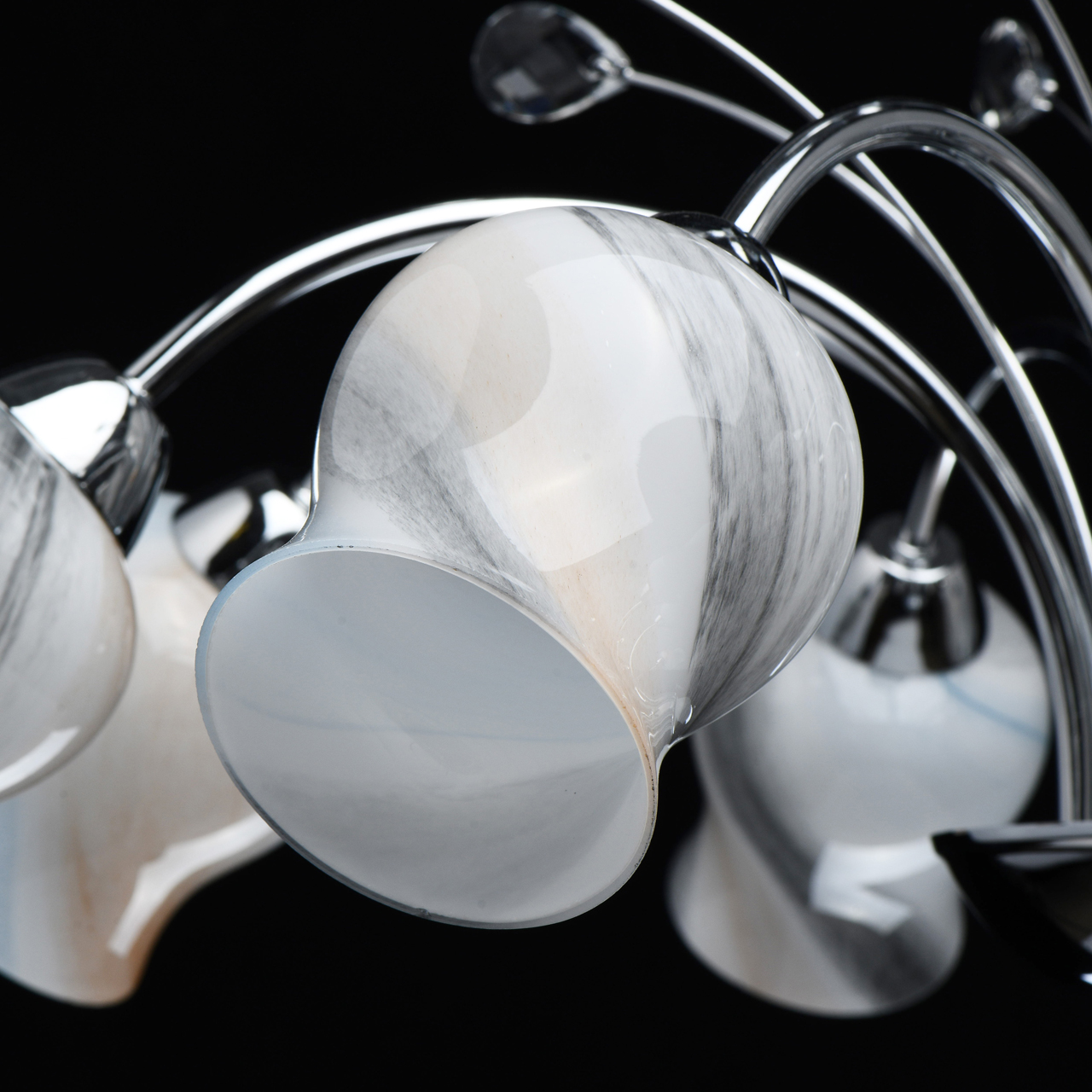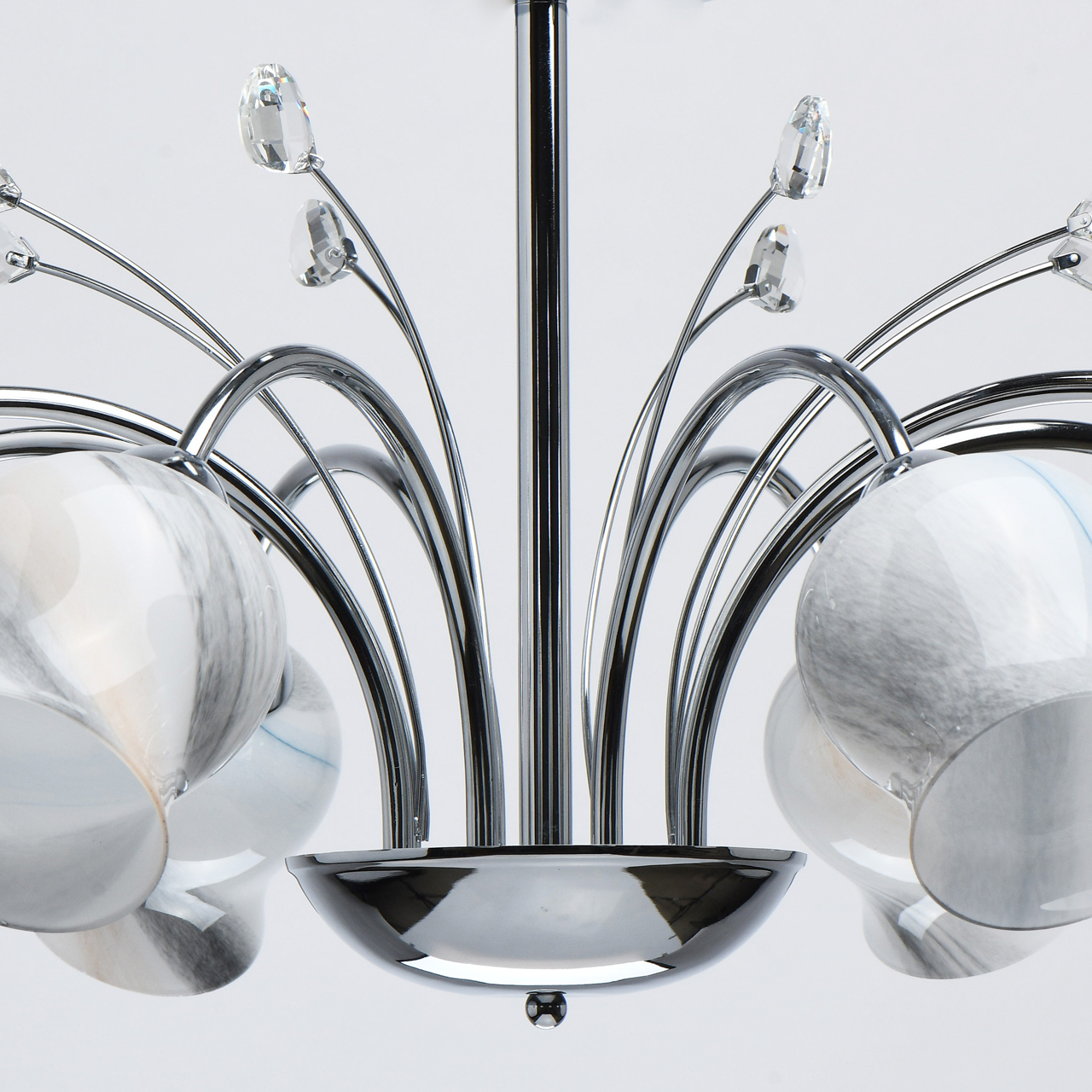 Металлическое основание светильника гальванизировано в цвет хрома. Стеклянные разноцветные плафоны отлиты в форму и окрашены в коричневый, серый, голубой и белый цвета. Светильник декорирован прозрачным хрусталем миндалевидной формы.Тип помещения