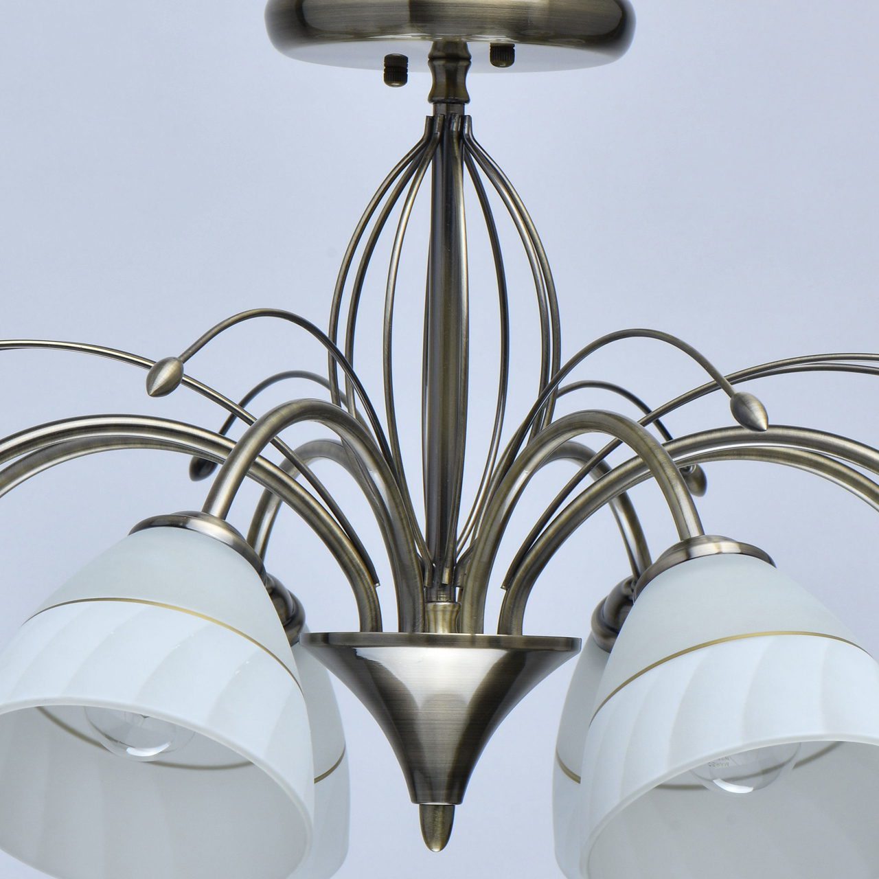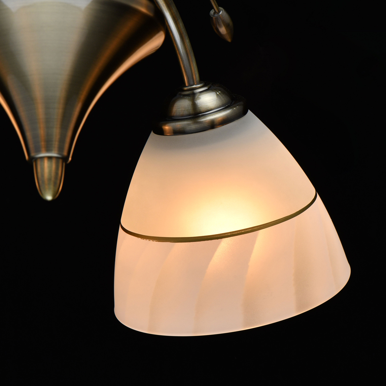 Основание светильника выполнено из сплава металла и гальванизировано в цвет античной бронзы с последующим лакированием. Стеклянные плафоны матированы и окрашены вручную в белый цвет. Полоска золотого цвета отделяет окрашенную часть от матированной.Тип помещения