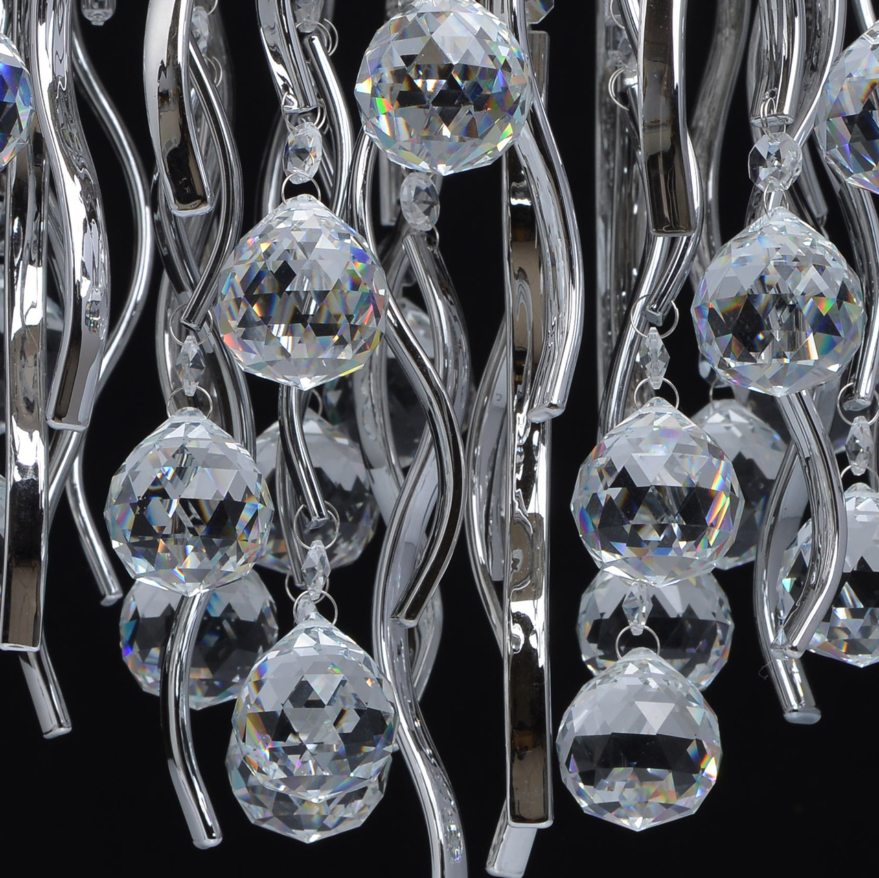 Металлическое основание цвета хрома, декоративные подвески из прозрачного хрусталя и гальванизированного стекла.Технология производства