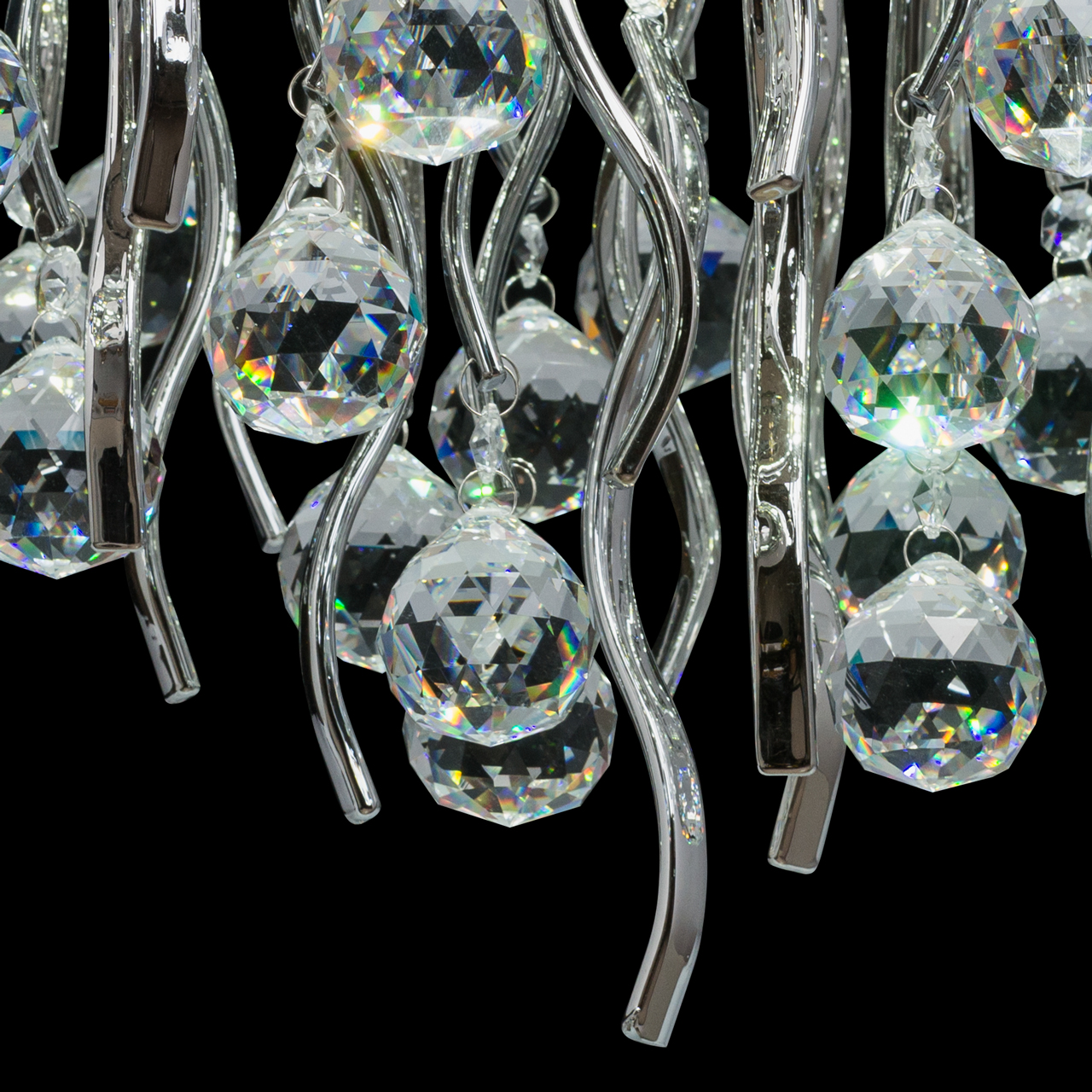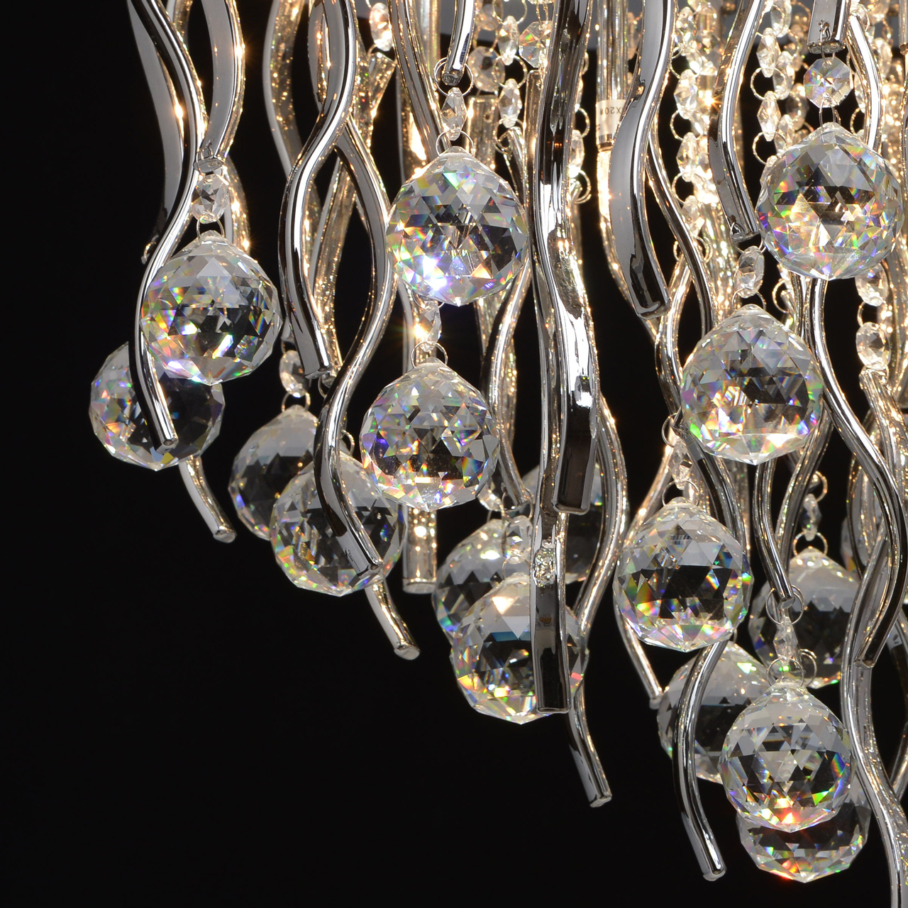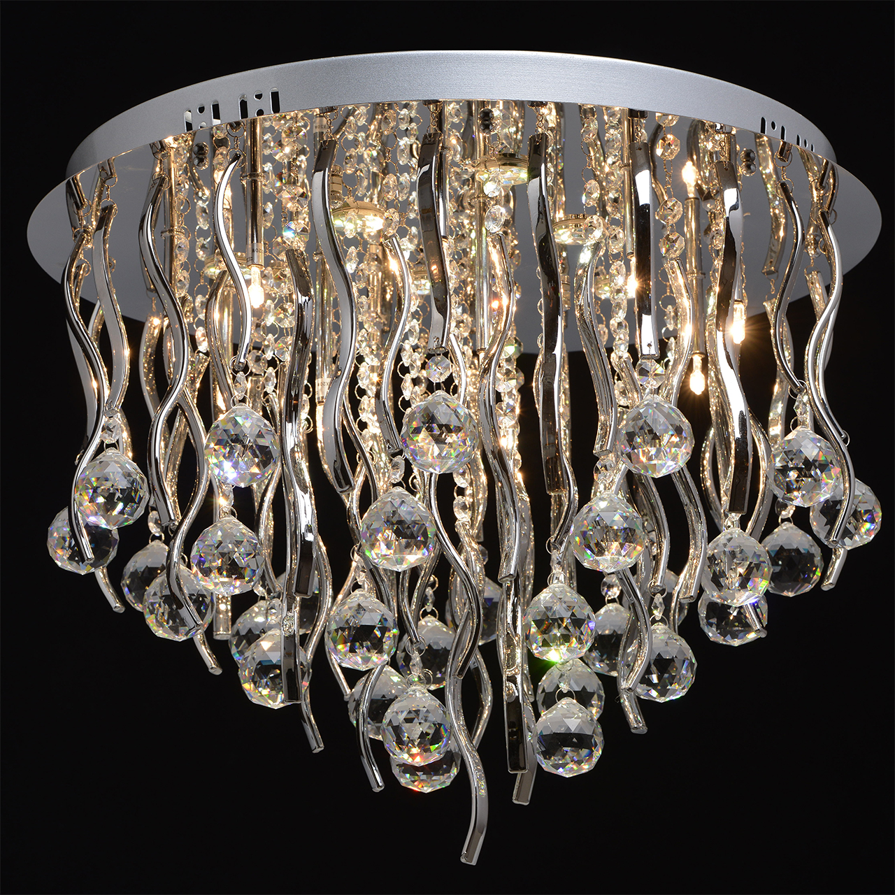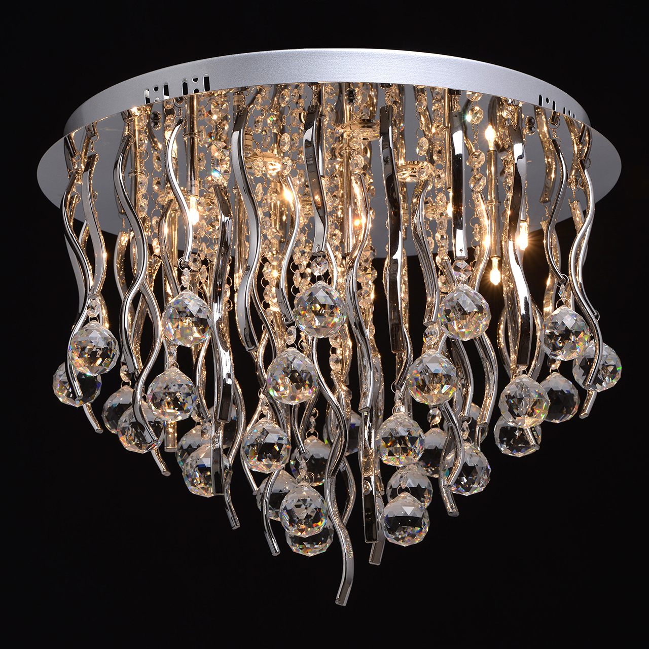 Зеркальное основание из отполированной стали. Волнообразные декоративные элементы из гальванизированного стекла, изготовленные гутным способом. Хрусталь ТМ F&D Crystal двух видов, c высоким показателем дисперсии.Тип помещения