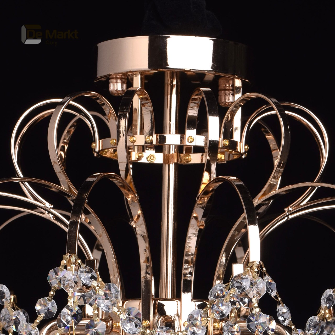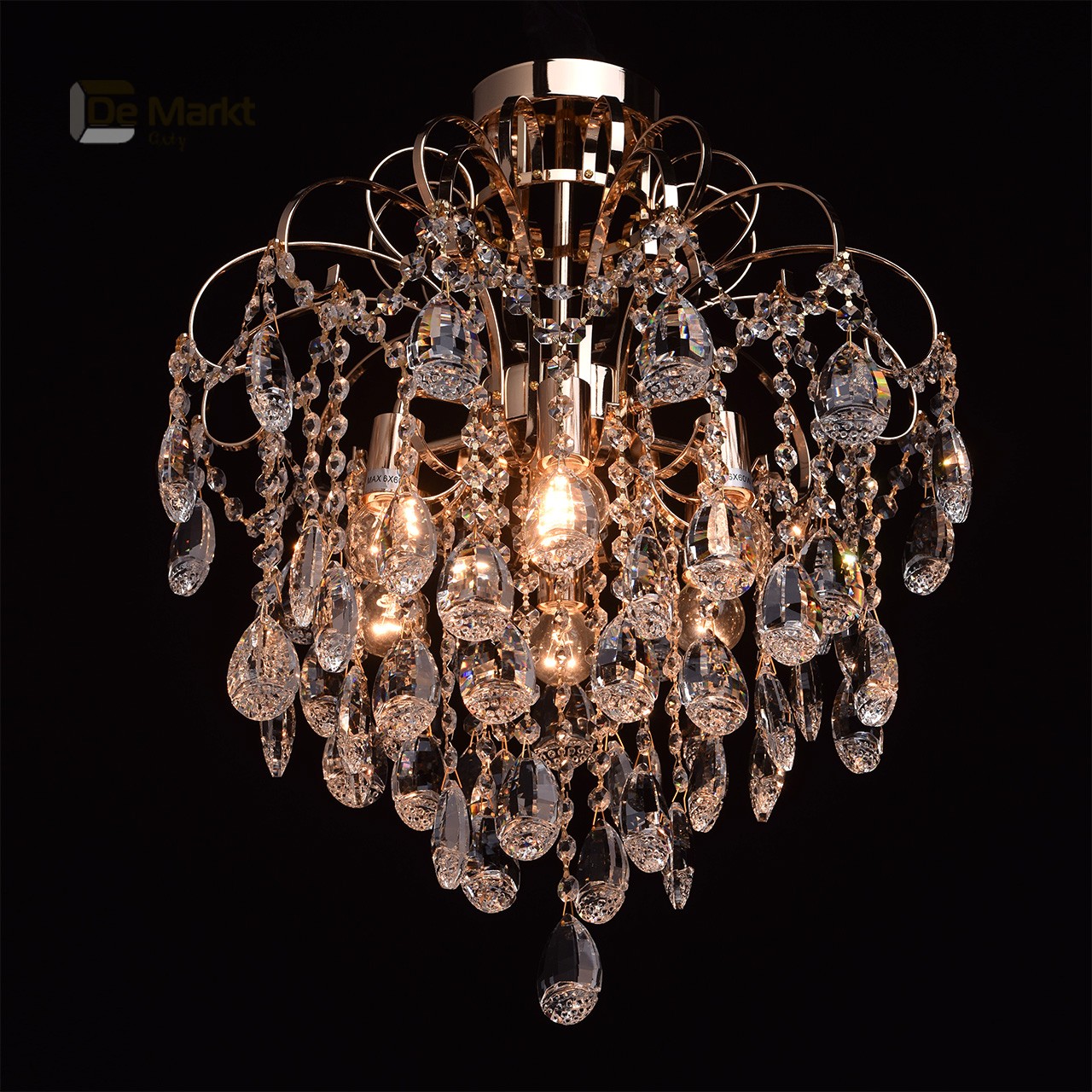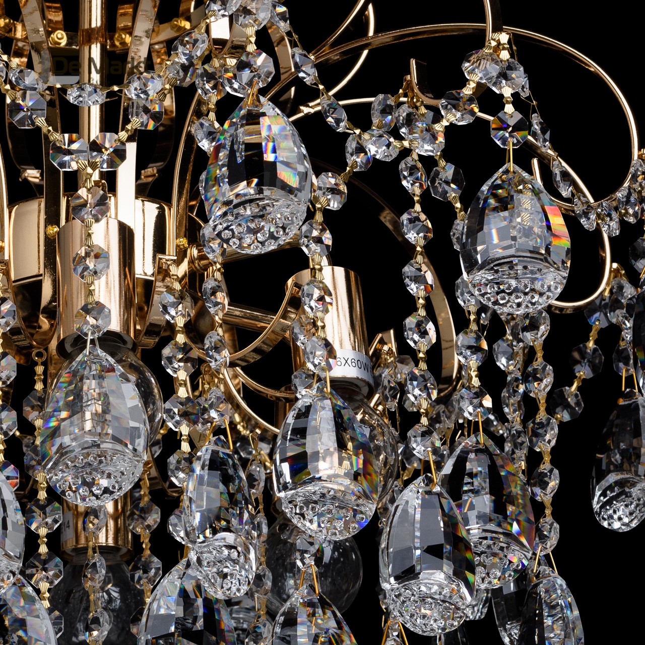 Основание светильника выполнено из металла и гальванизировано в цвет золота. Светильник декорирован подвесками из прозрачного хрустального стекла миндалевидной формы и формы октагона.Тип помещения