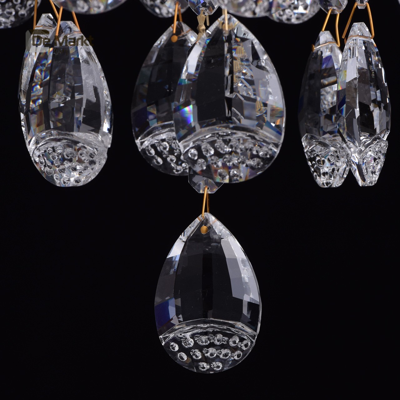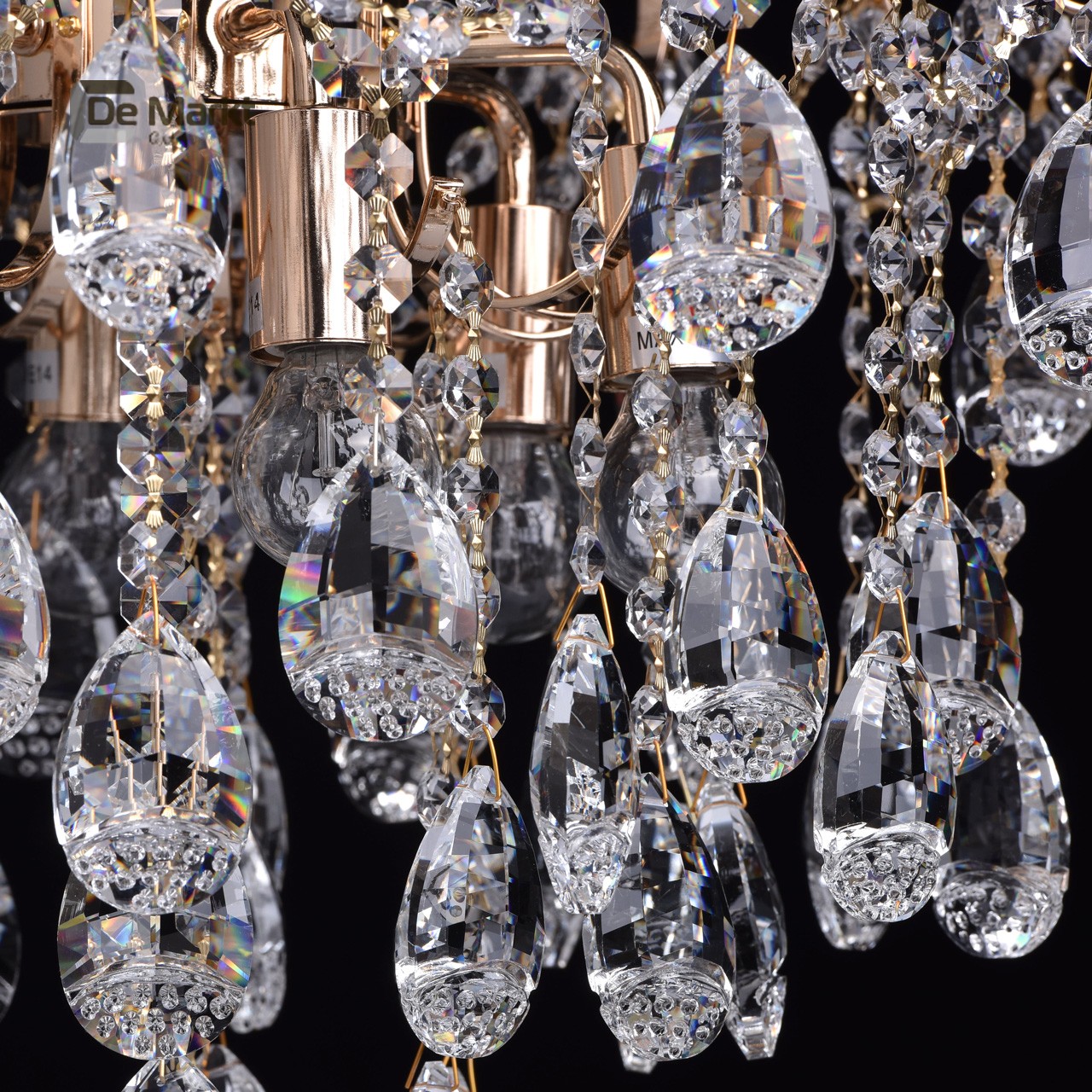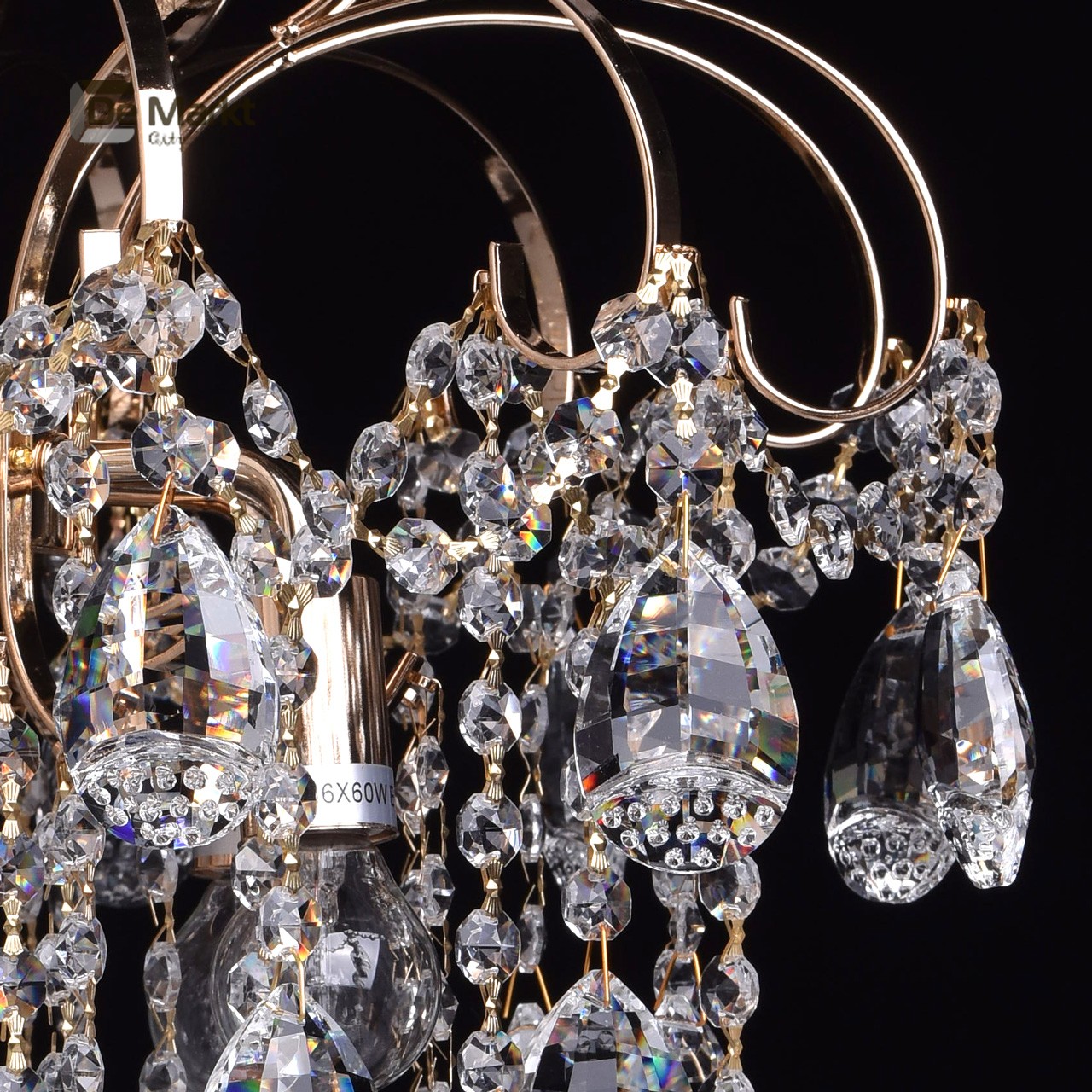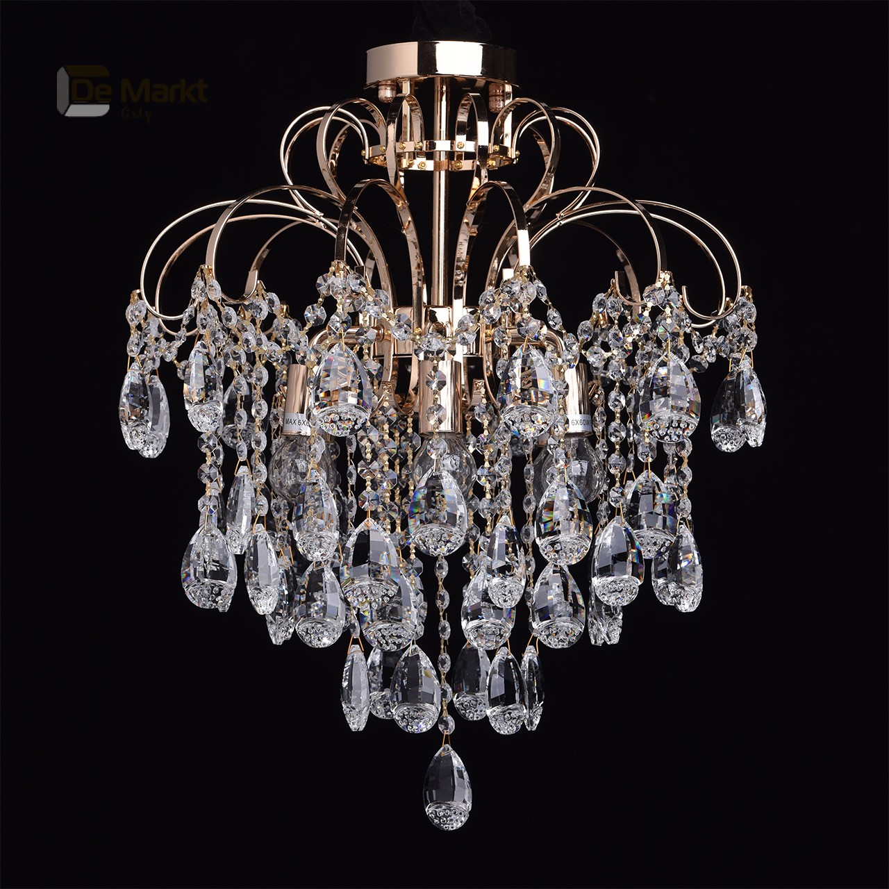 Основание светильника выполнено из металла и гальванизировано в цвет золота. Светильник декорирован подвесками из прозрачного хрустального стекла миндалевидной формы и формы октагона.Тип помещения