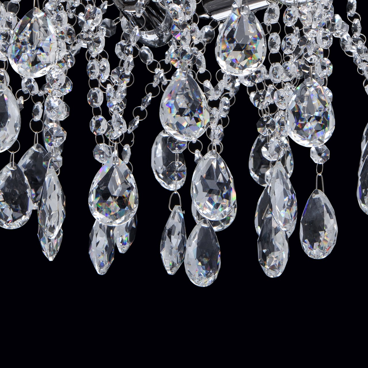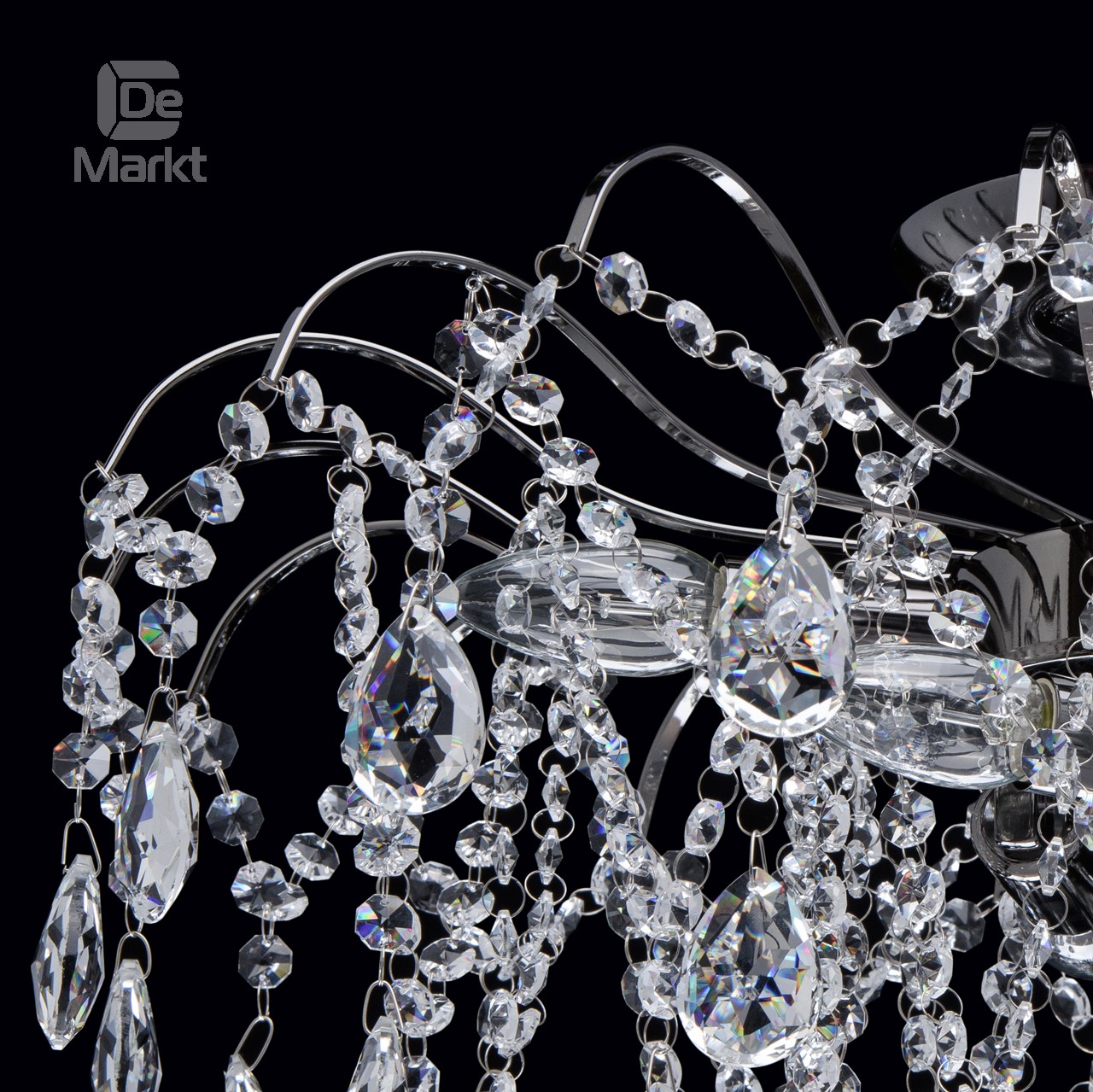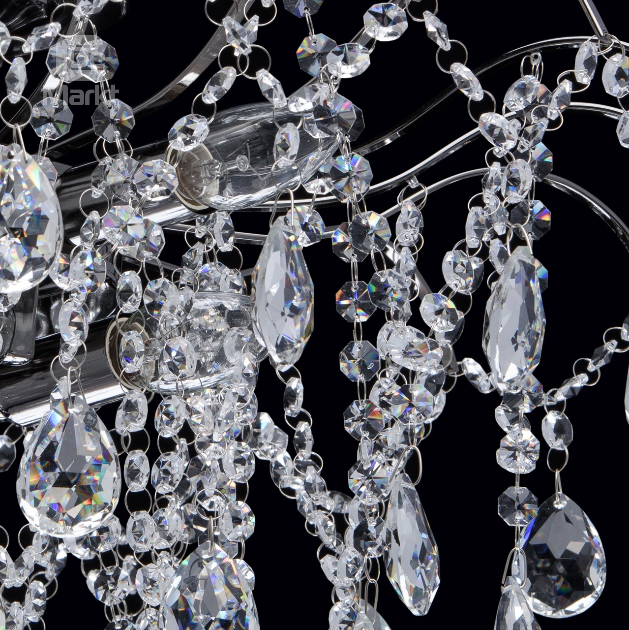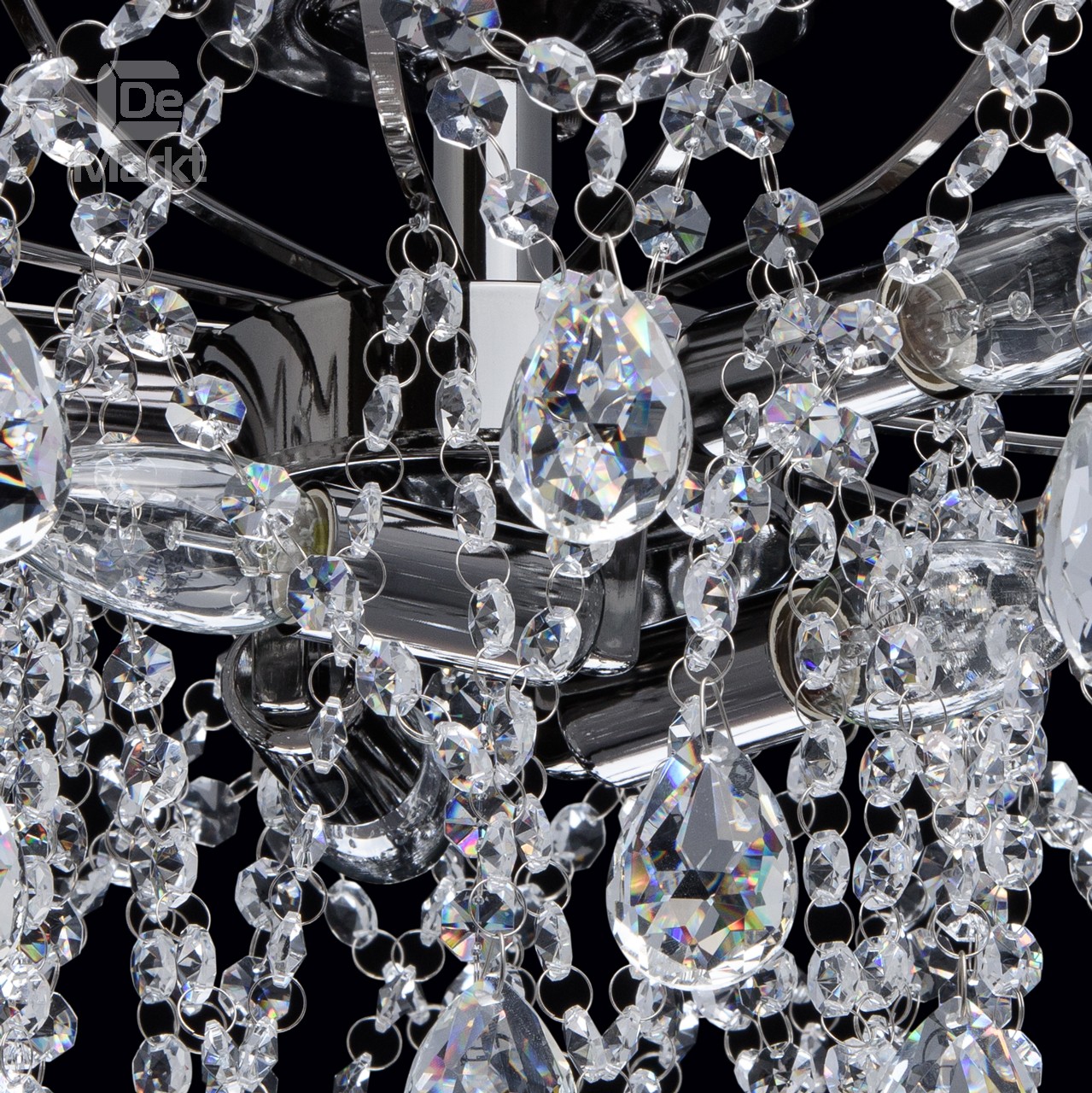 Основание светильника выполнено из металла и гальванизировано в цвет никеля. Светильник декорирован подвесками из прозрачного хрустального стекла миндалевидной формы и формы октагона.Тип помещения