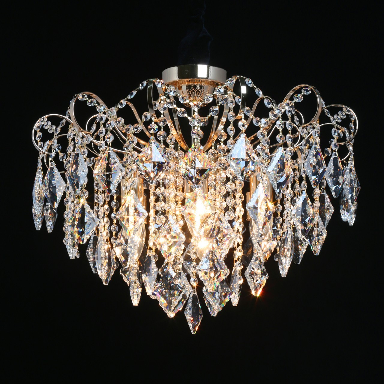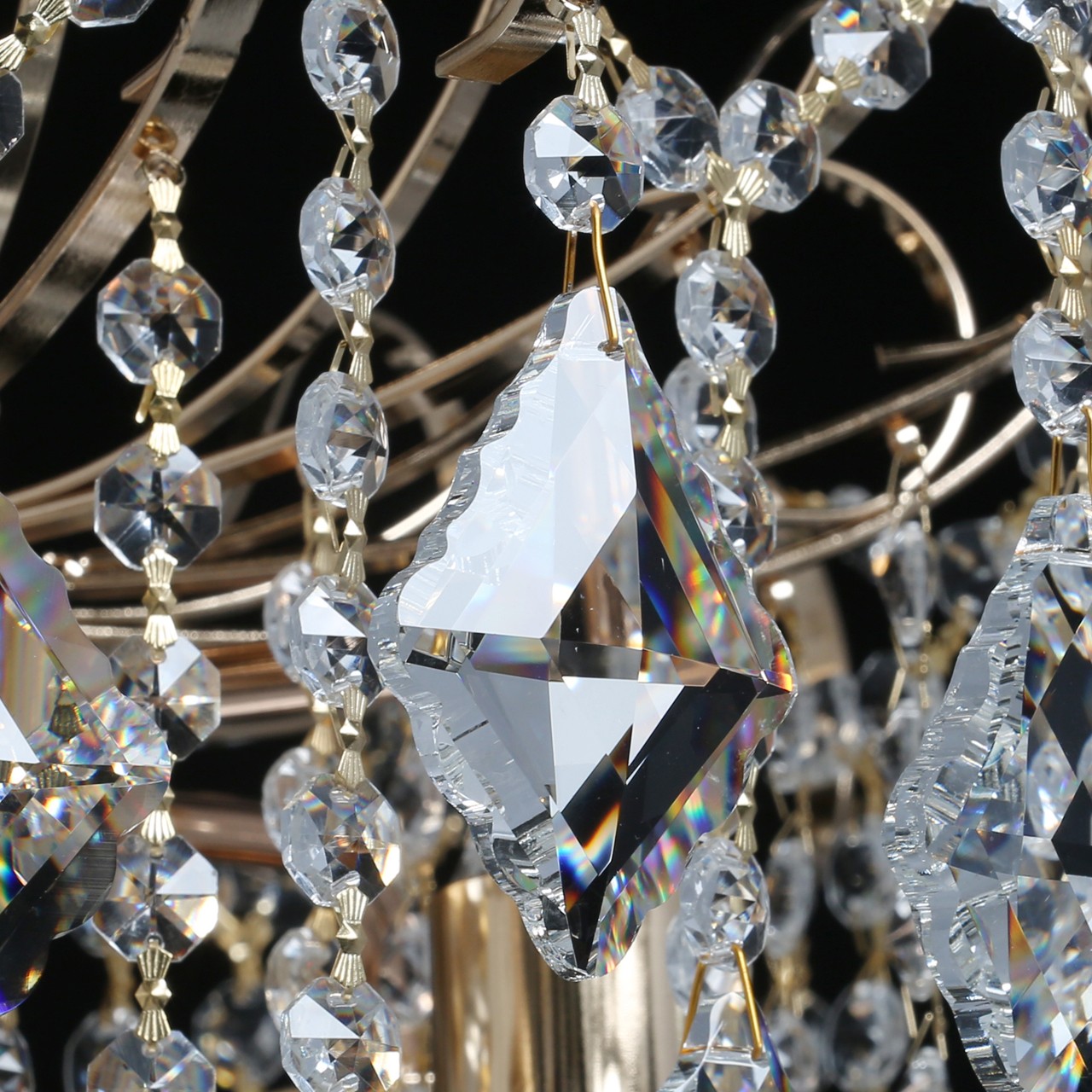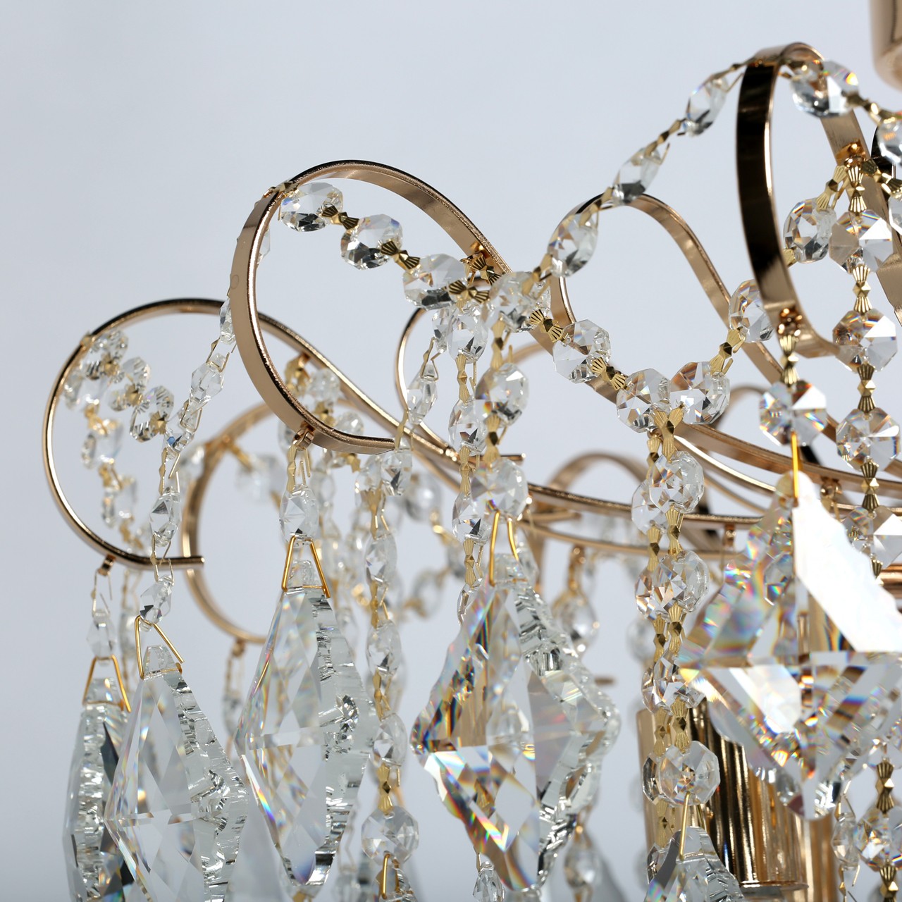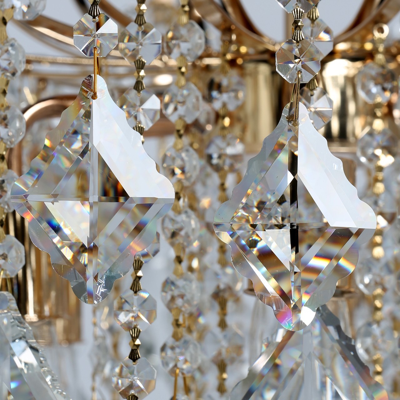 Хрустальный массивный декор в форме ромба, Подвески из прозрачного хрусталя и цепочки из октагонов создают красивую игру света Классический золотой цвет основания всегда в тренде Компактные размеры высоты для хрустальных светильников редкостьСтилевые решения интерьера
