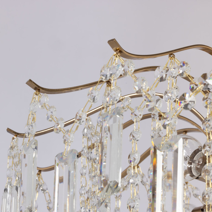 Цвет основания латуни привлекает внимание и придает люстре уникальность. Оригинальный декор из хрусталя вытянутой формы тщательно подобран и создает яркое эстетическое впечатление, обеспечивая эффектную игру света. Заменяемые источники света удобны в эксплуатации. Компактная высота актуальна для стандартной высоты потолка.Металлическое основание потолочной люстры гальванизировано в цвет латуни. Светильник декорирован прозрачным хрусталем разной формы.