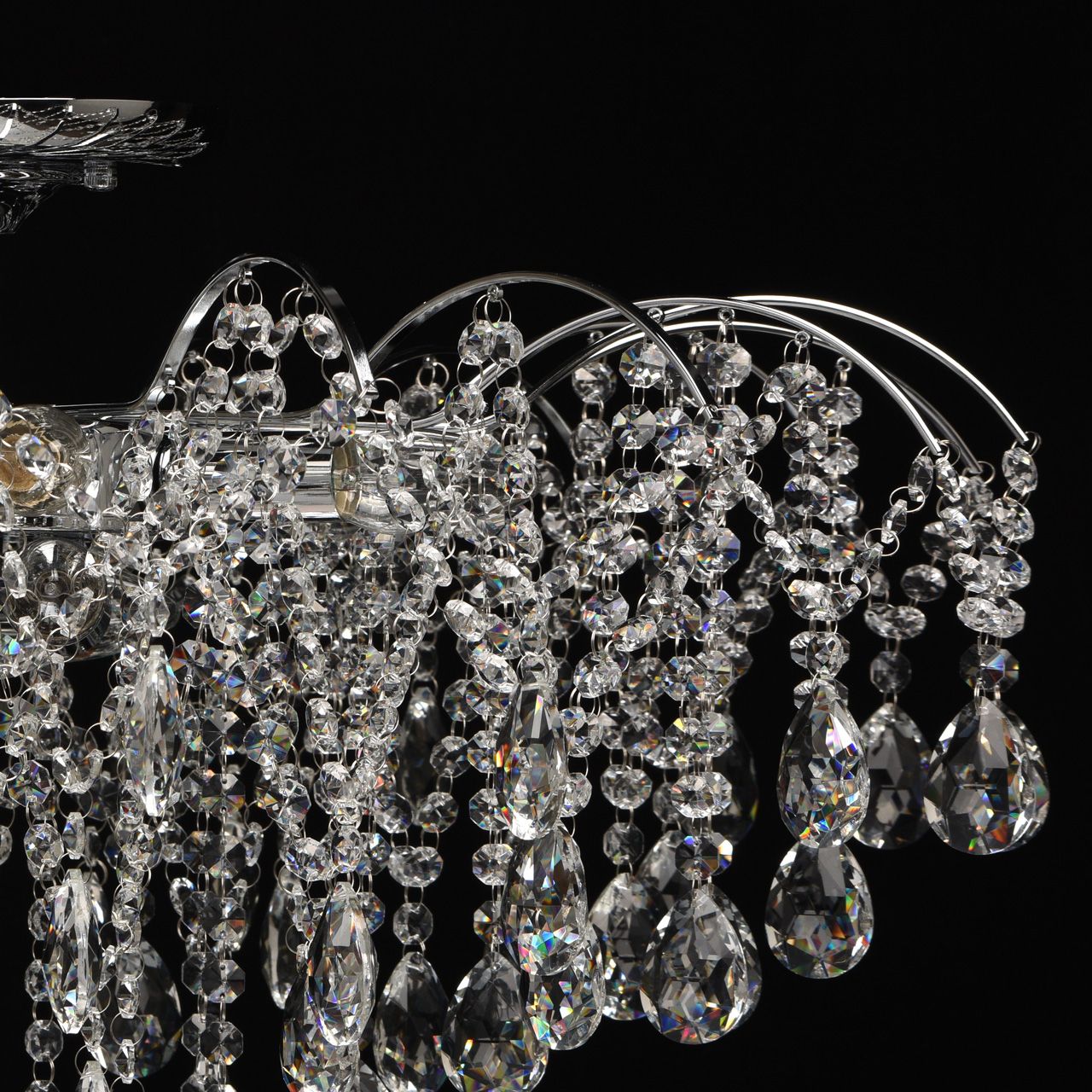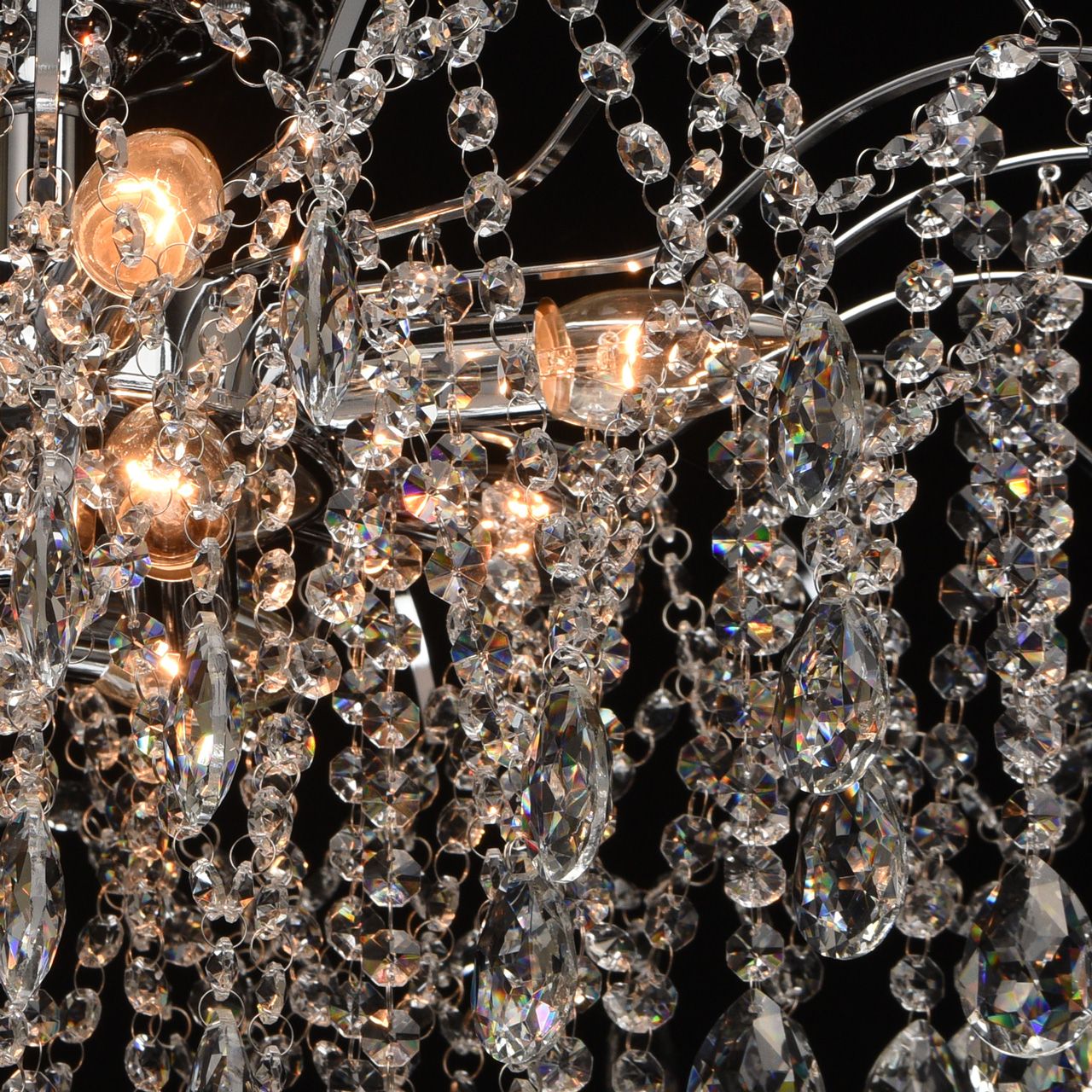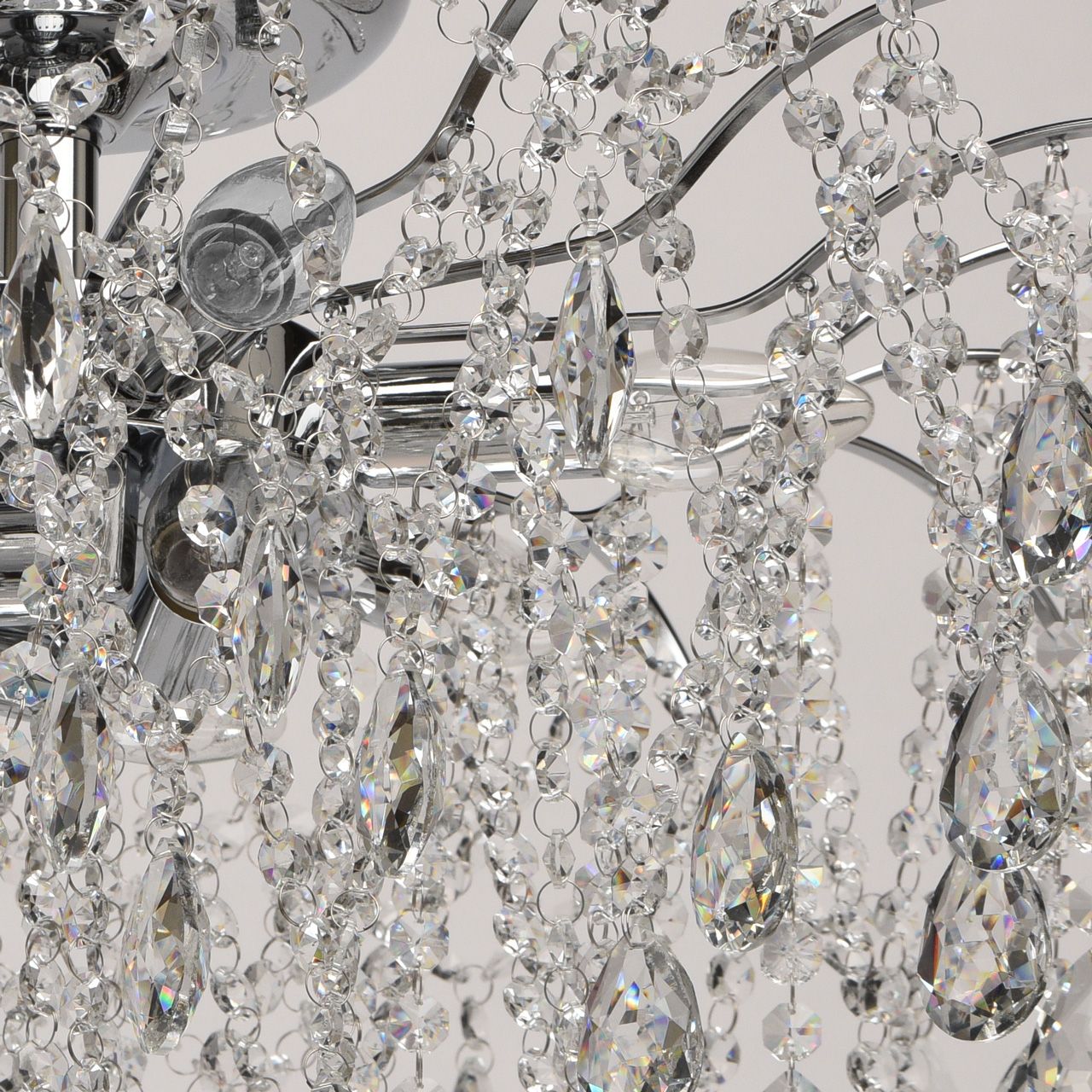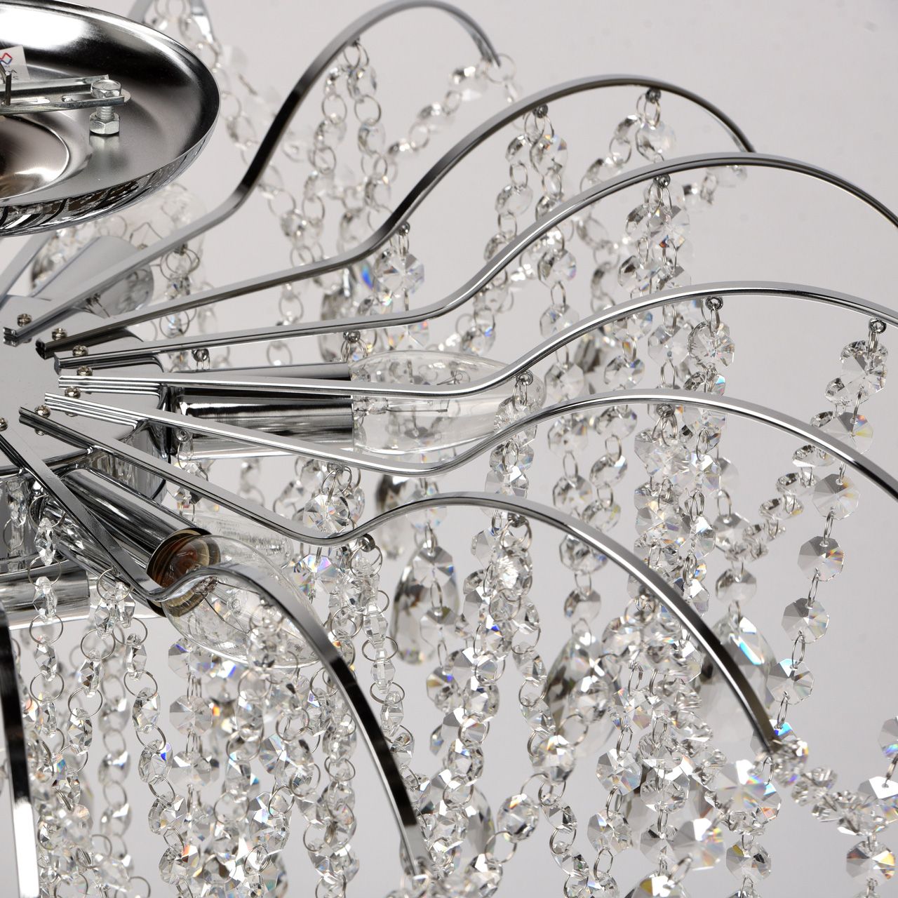 Основание светильника выполнено из металла и гальванизировано в цвет хрома. Светильник декорирован прозрачным хрусталем формы октагон и миндаль.Тип помещения