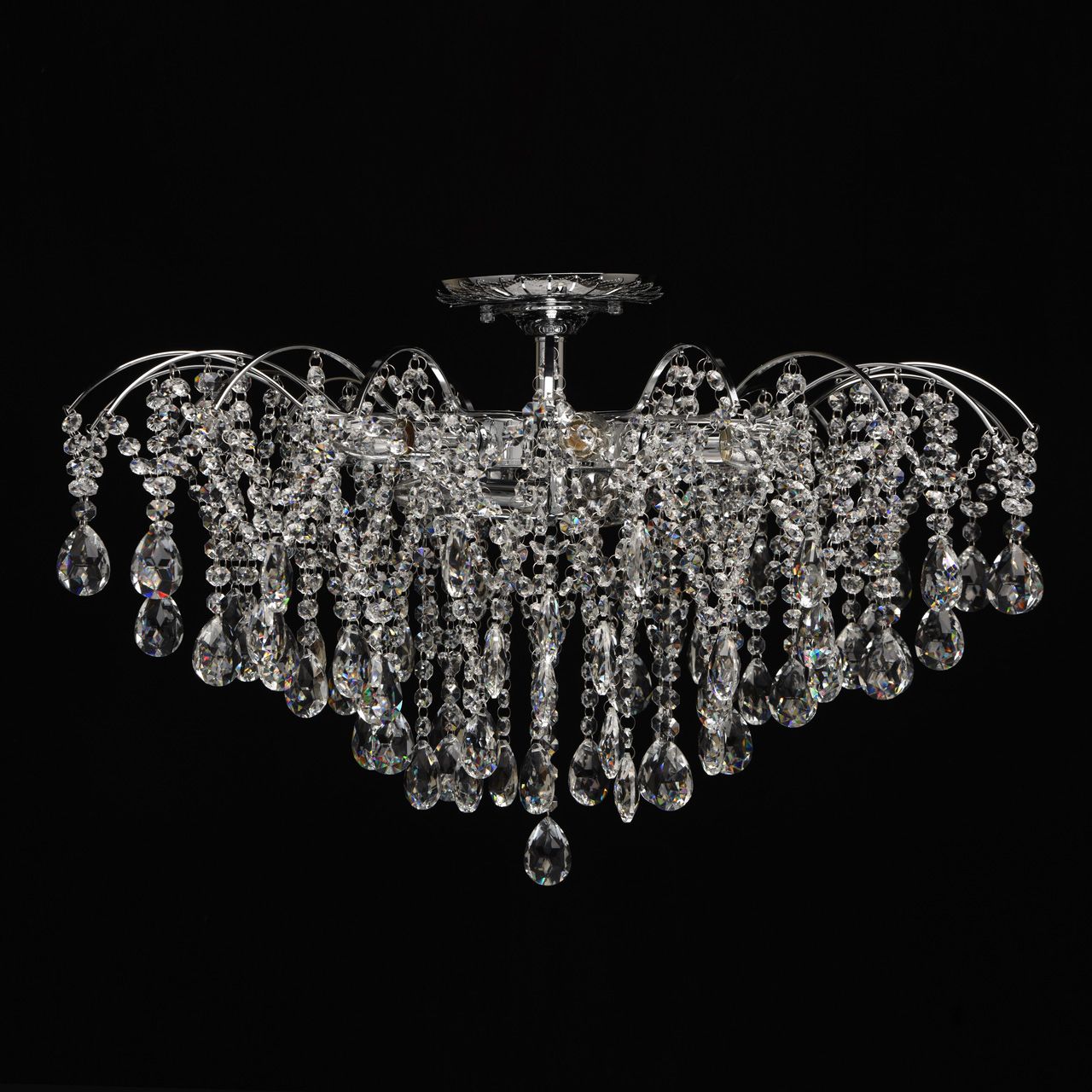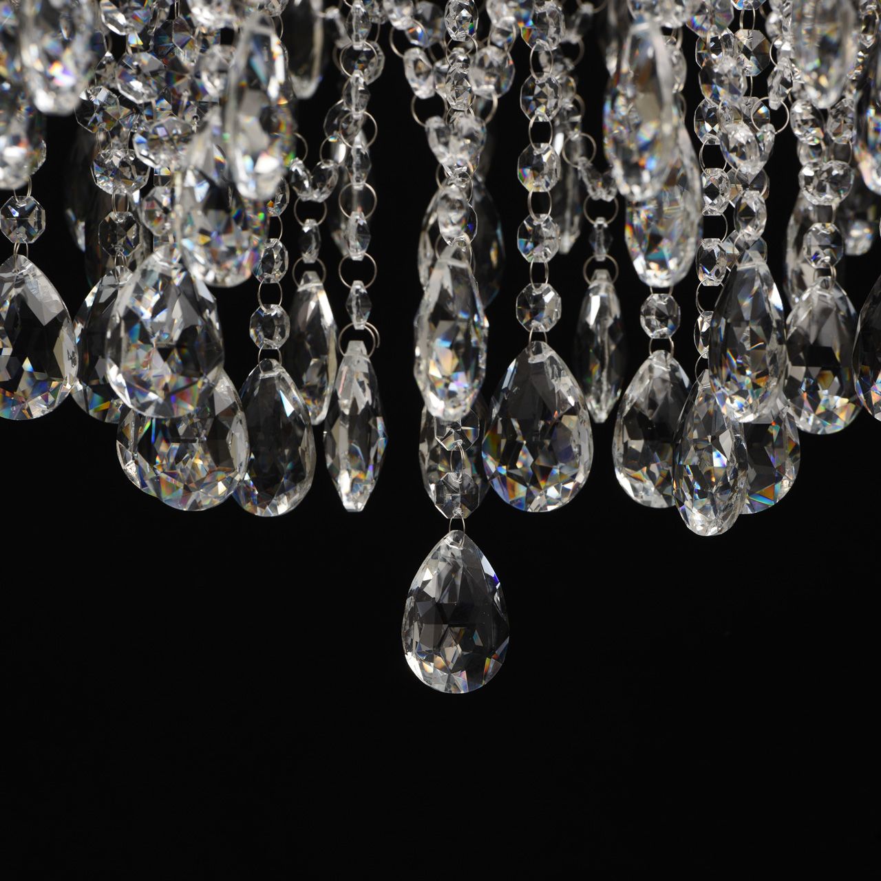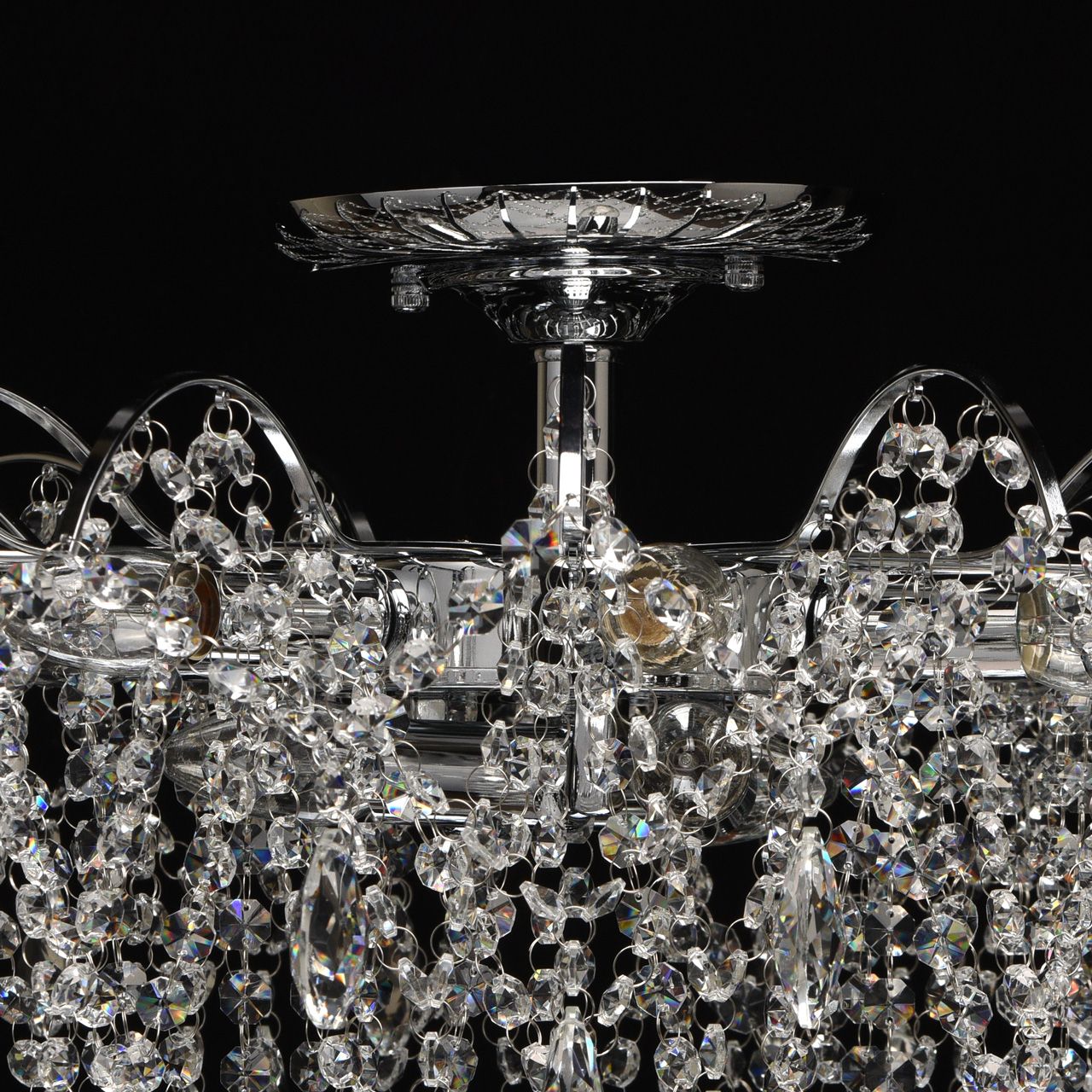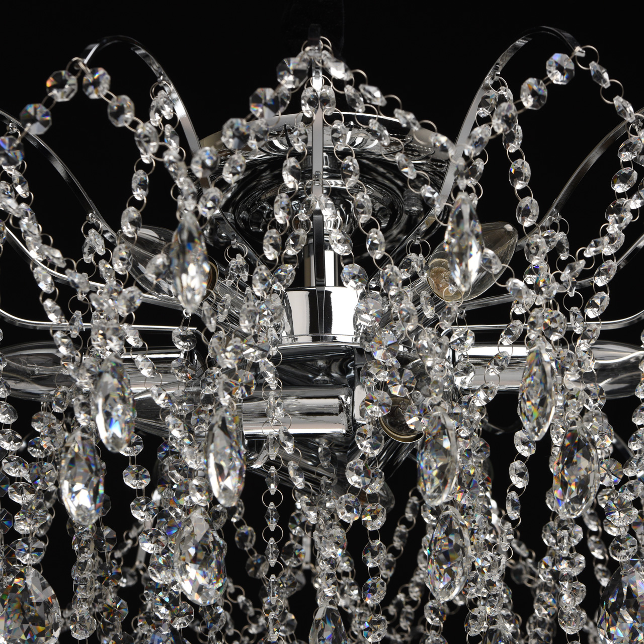 Основание светильника выполнено из металла и гальванизировано в цвет хрома. Светильник декорирован прозрачным хрусталем формы октагон и миндаль.Тип помещения