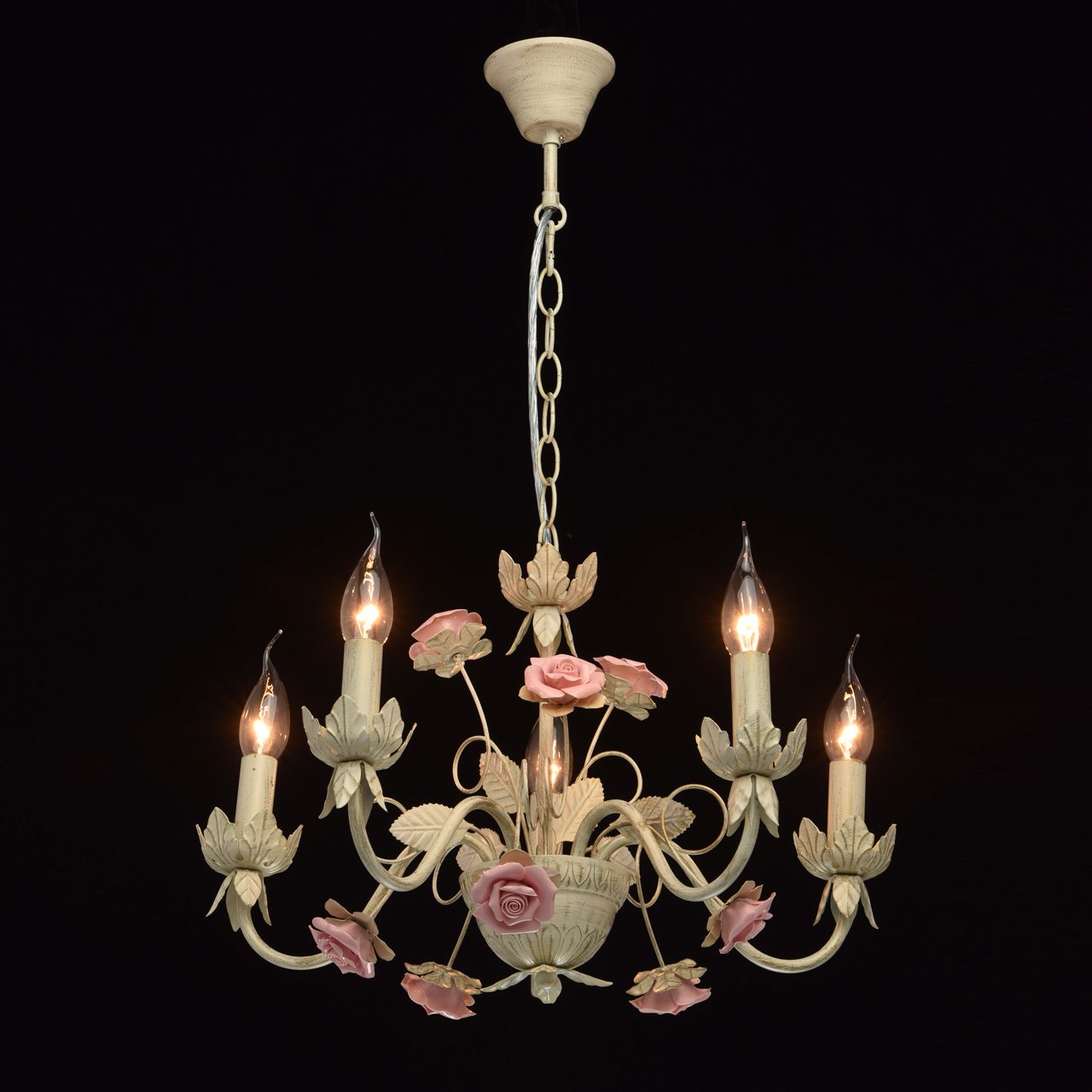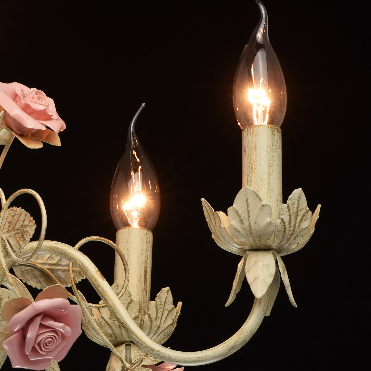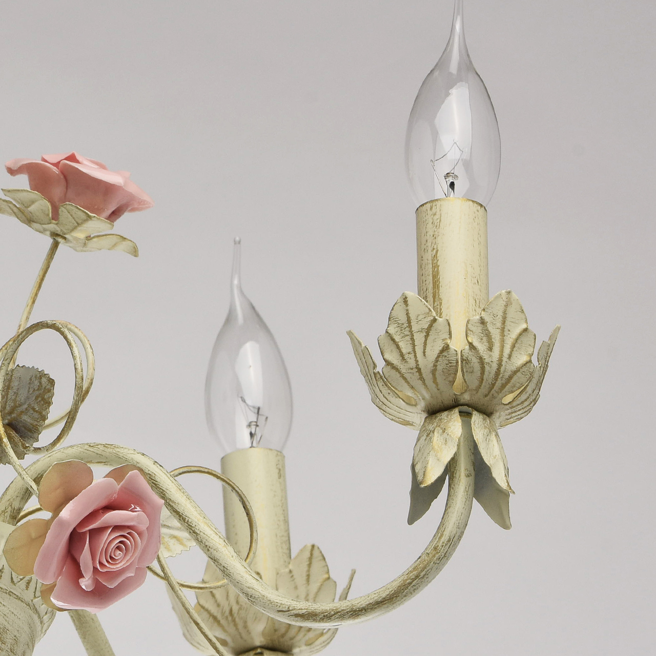Изящная люстра выполнена в нежном флористическом стиле Приятный бежевый цвет с эффектом золотого патинирования позволяет люстре встроиться в большинство интерьеров Традиционная форма свечи создает высокие параметры освещения Нежно розовые фарфоровые розы делают люстру необыкновенно изящной и романтичной Идеальное решение для спальни или гостиной выполненных в стиле Прованс. Широкая семья дает возможность осветить смежные помещения в одном стилеСтилевые решения интерьера