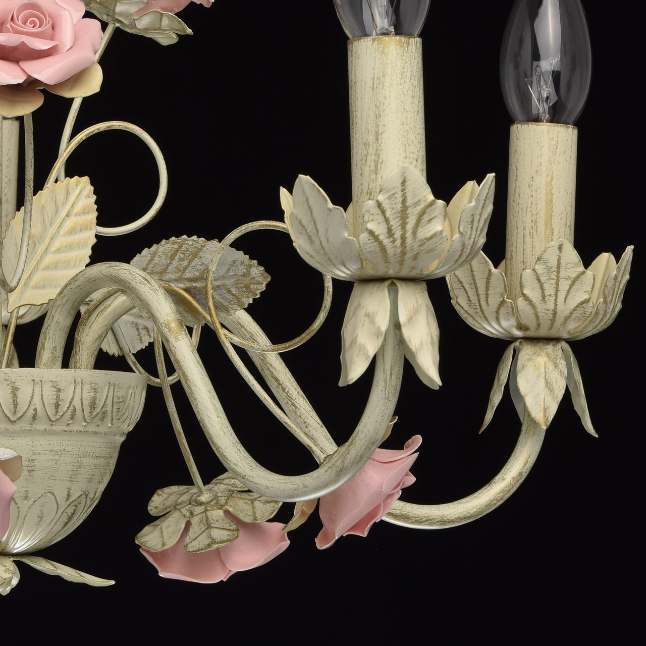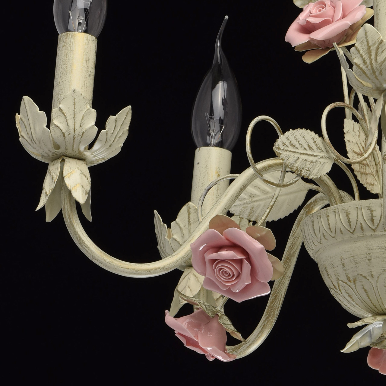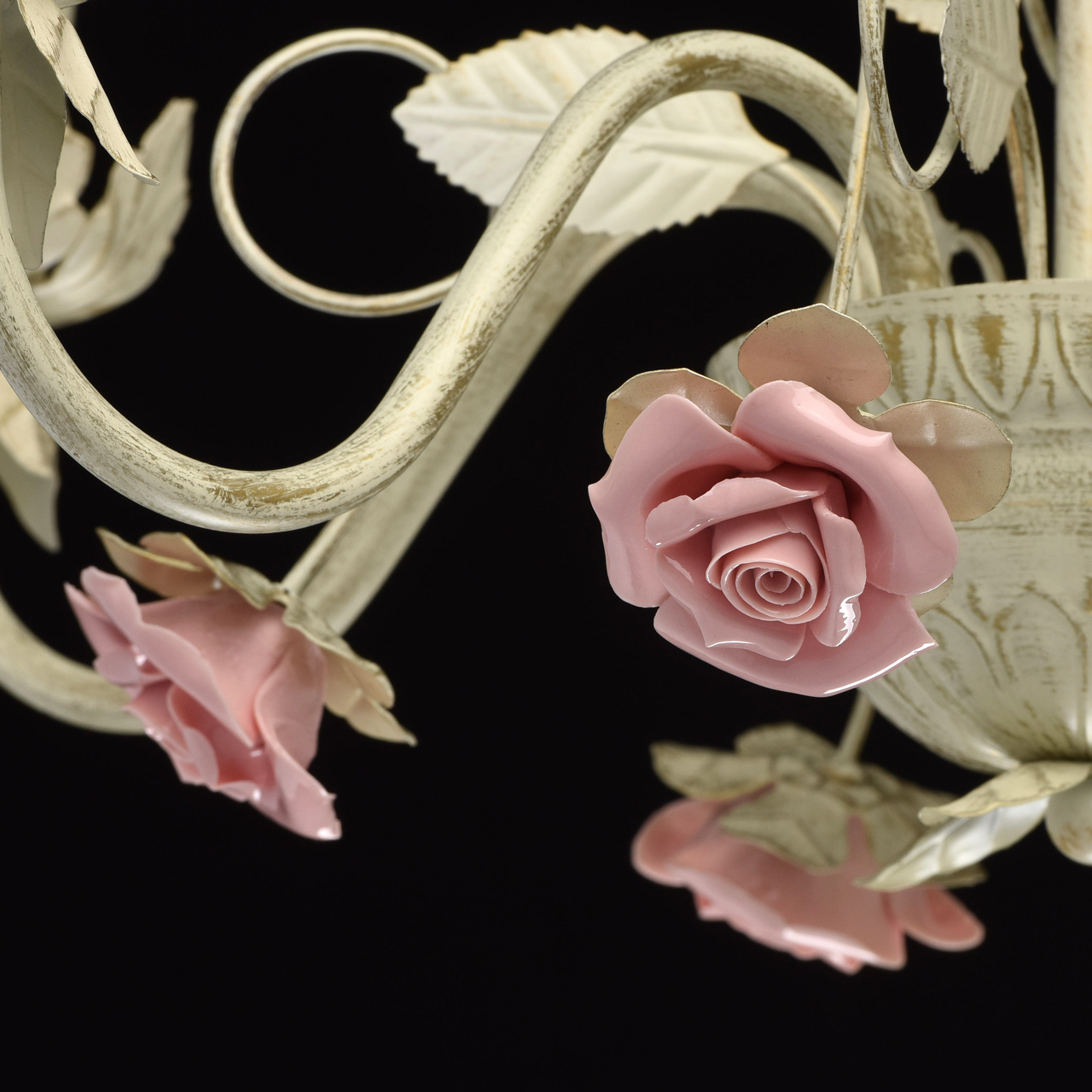 Металлическое основание белого цвета с эффектом золотой патины. Декор: розы из глазурированного фарфора.Технология производства