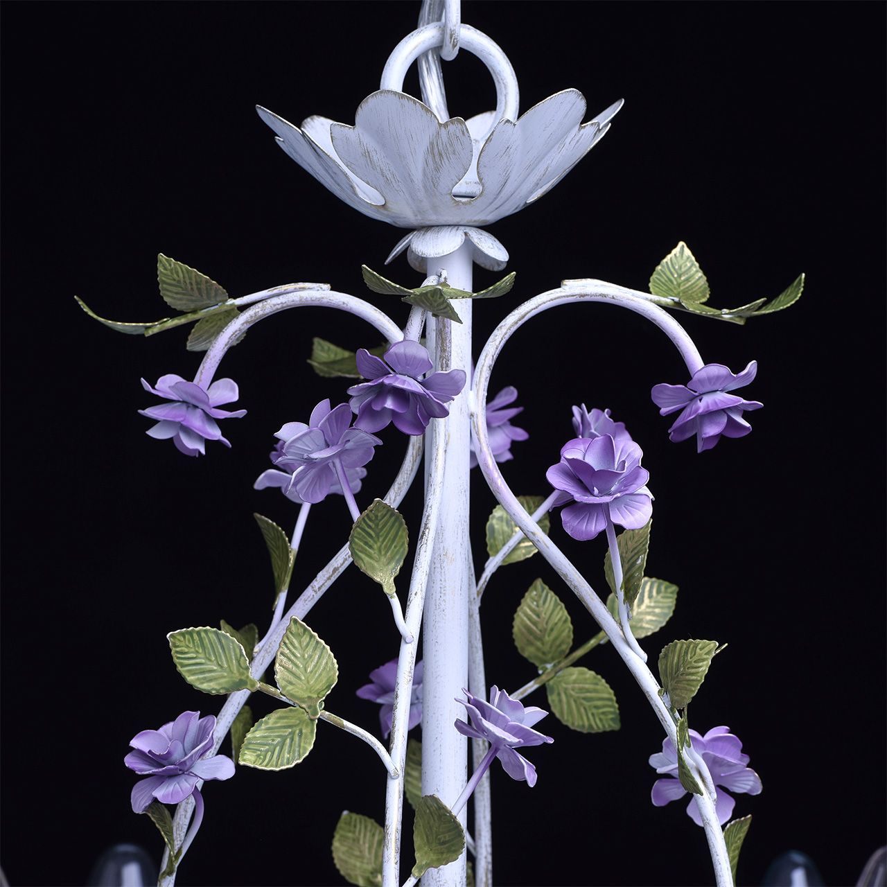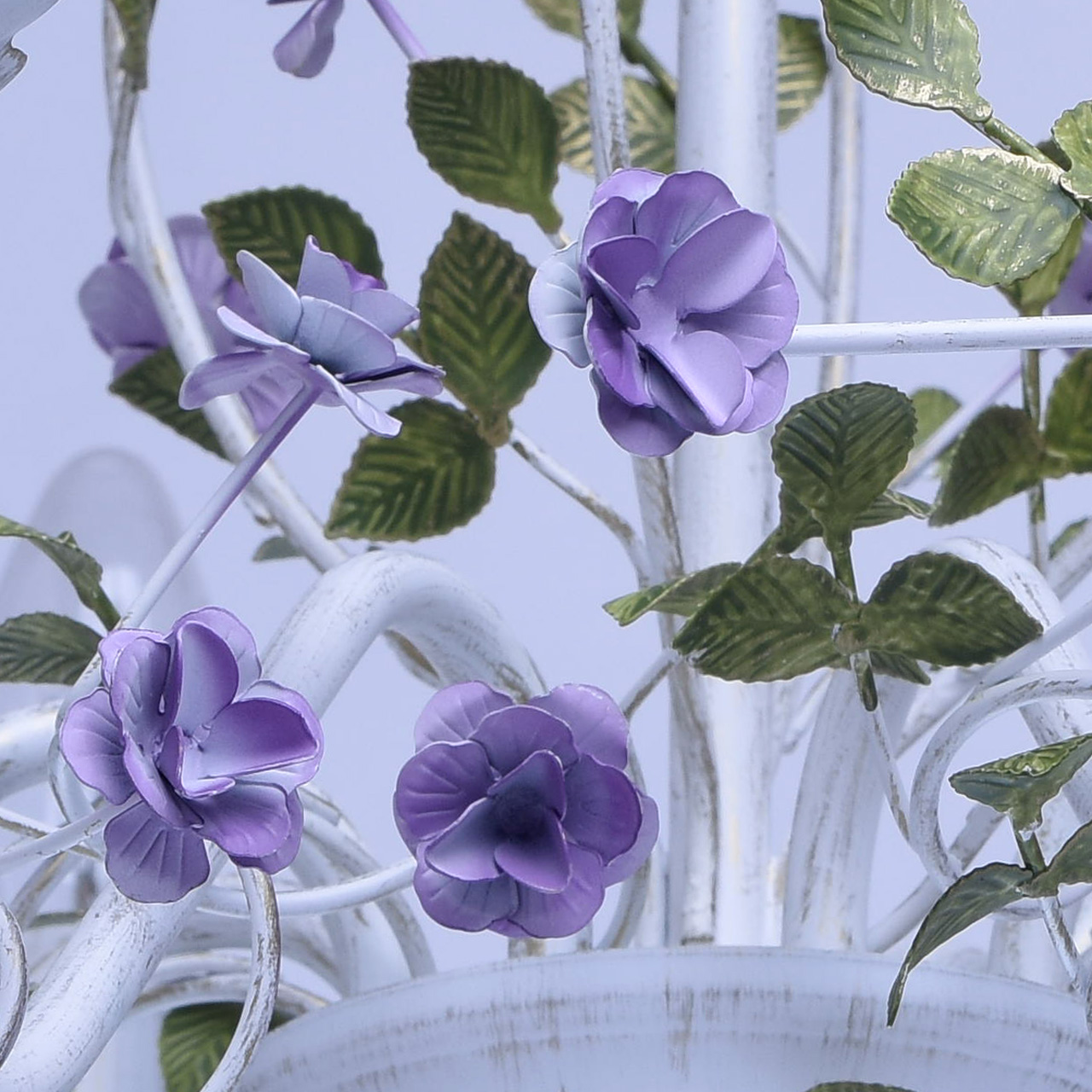Металлическое основание окрашено в белый цвет с золотистой патиной. Декор: цветы из металла фиалкового цвета.Технология производства
