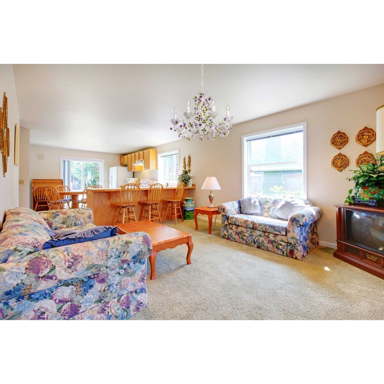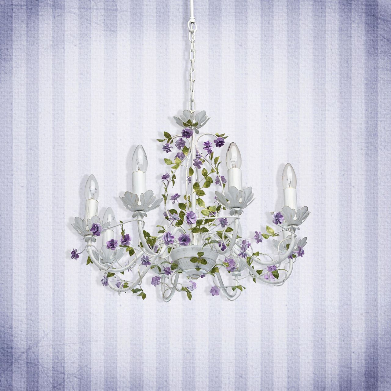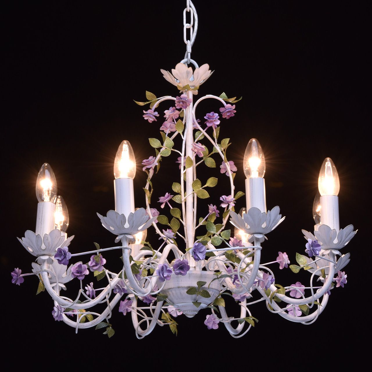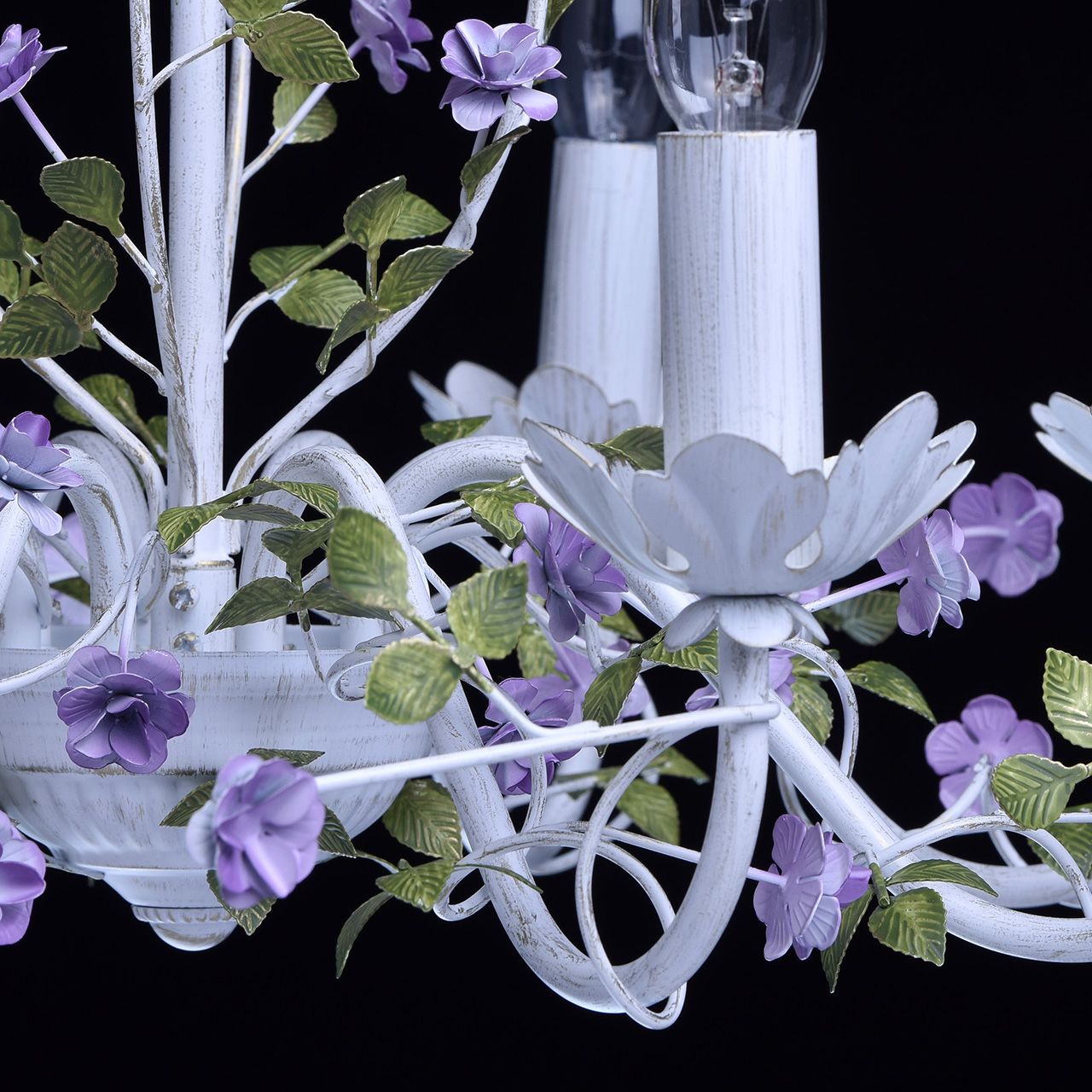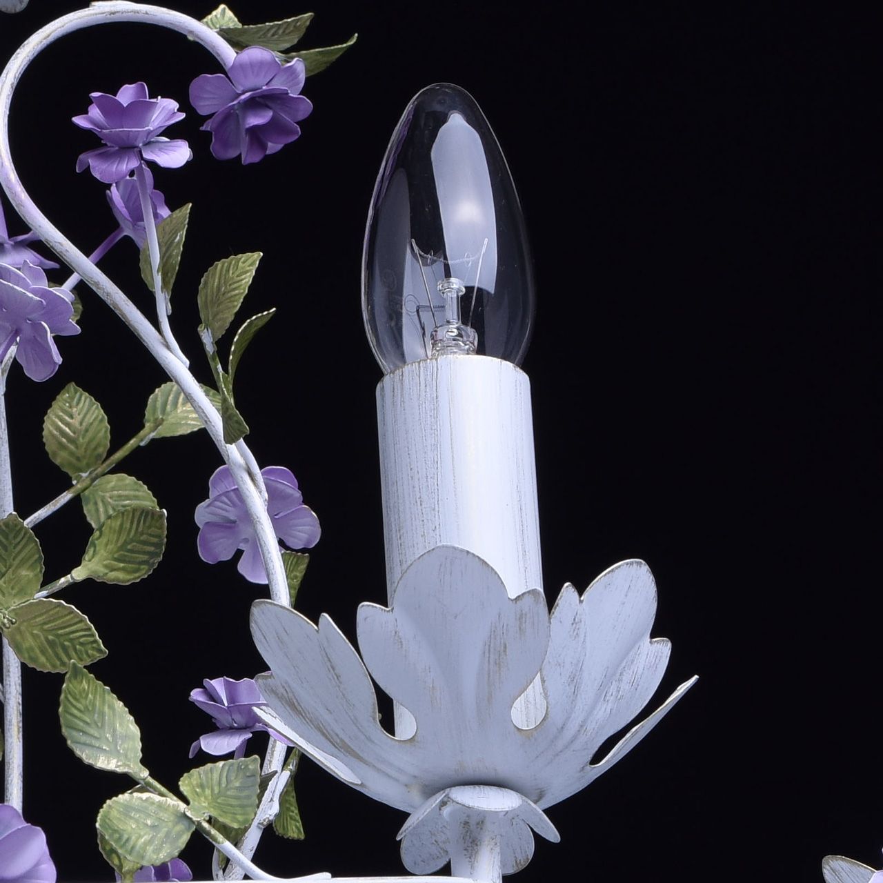 Воздушная весенняя люстра из коллекции «Букет» - мечта романтичных особ. Матово-белое металлическое основание с эффектом патинирования в цвет золота декорировано элементами флористического стиля. Миниатюрные цветы фиалкового оттенка переплетаются с изящными зелеными листьями. Широкая семья – люстра, бра, торшер, настольная лампа – позволит превратить интерьер в настоящий сад и расставить в световые акценты в едином стиле. Рекомендуемая площадь освещения порядка 16 кв.м.Преимущества модели