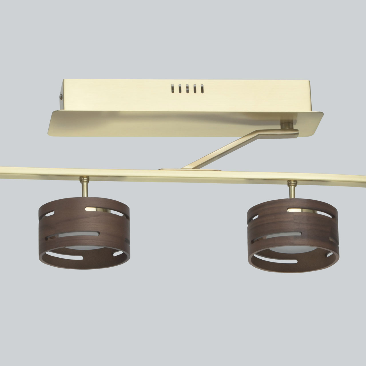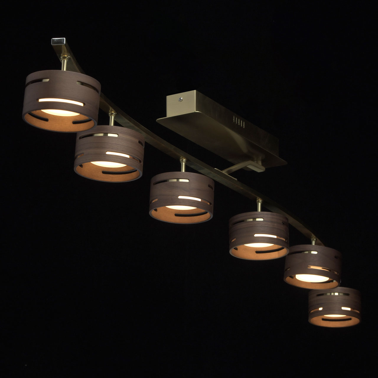 Основание выполнено из металла и гальванизировано в цвет матового золота. Плафоны выполнены из натурального дерева цвета венге. Светодиодные источники света типа SMD-board закрыты рассеивателями из матового акрила.Тип помещения