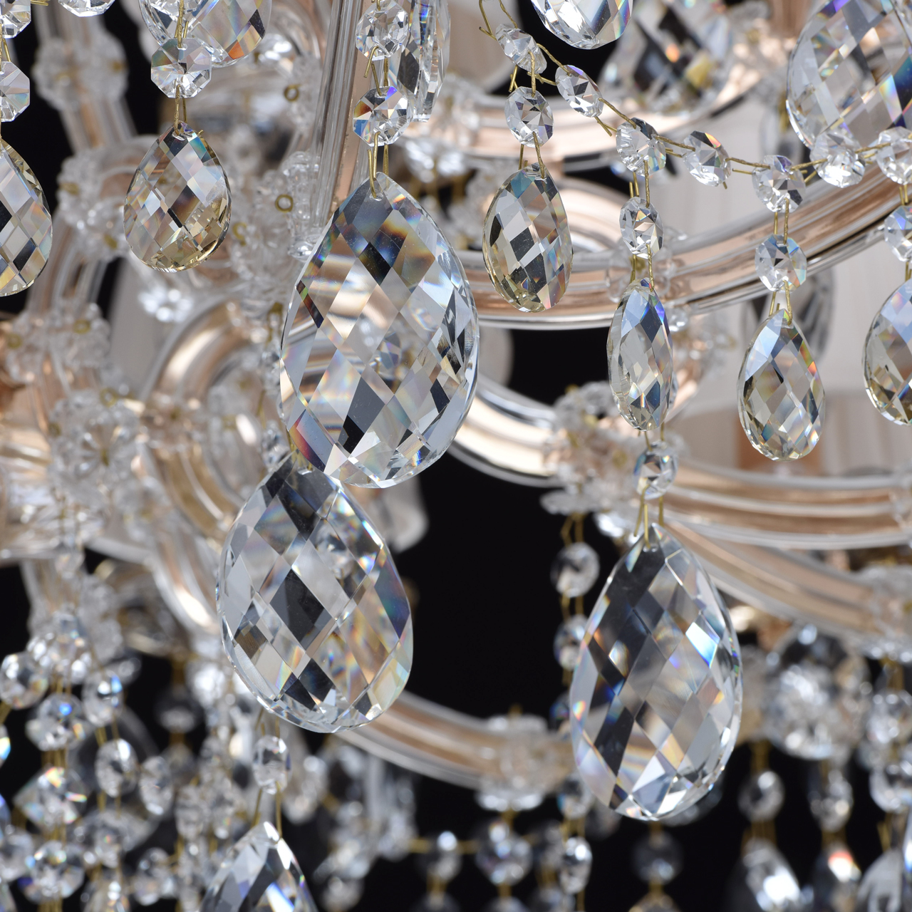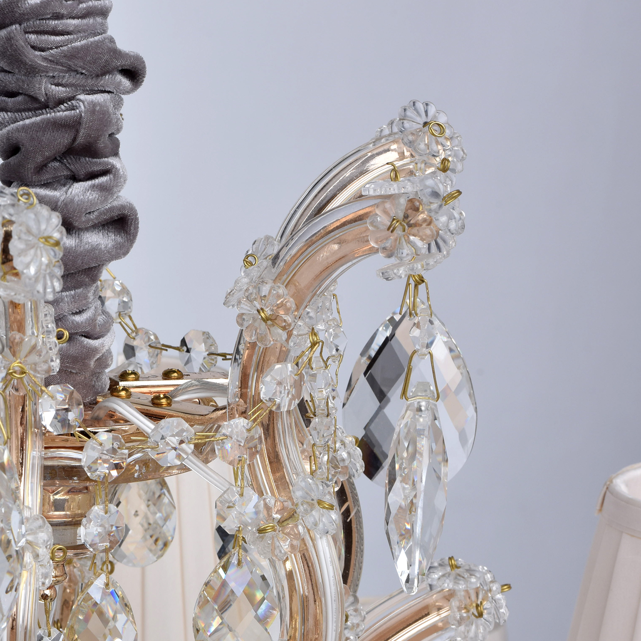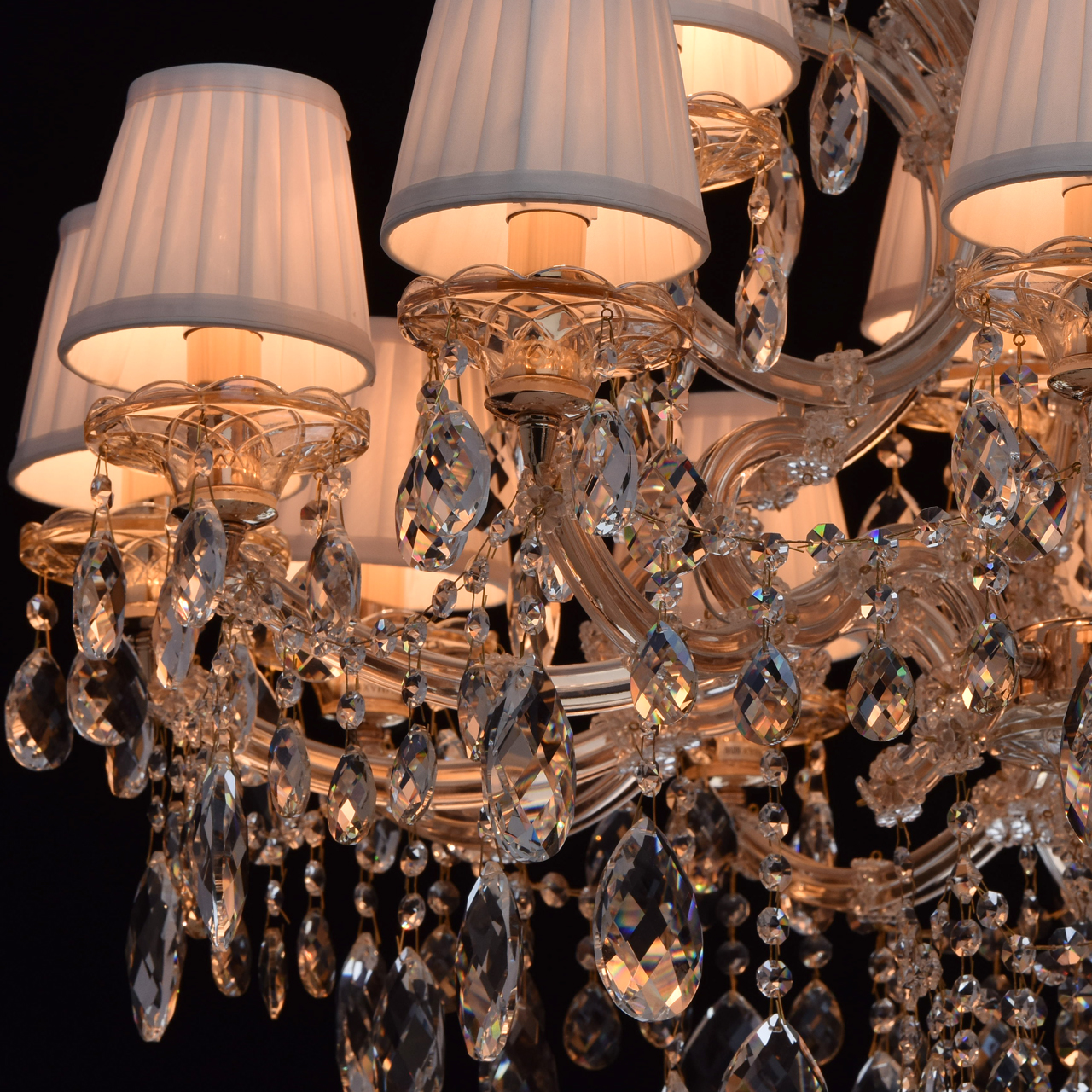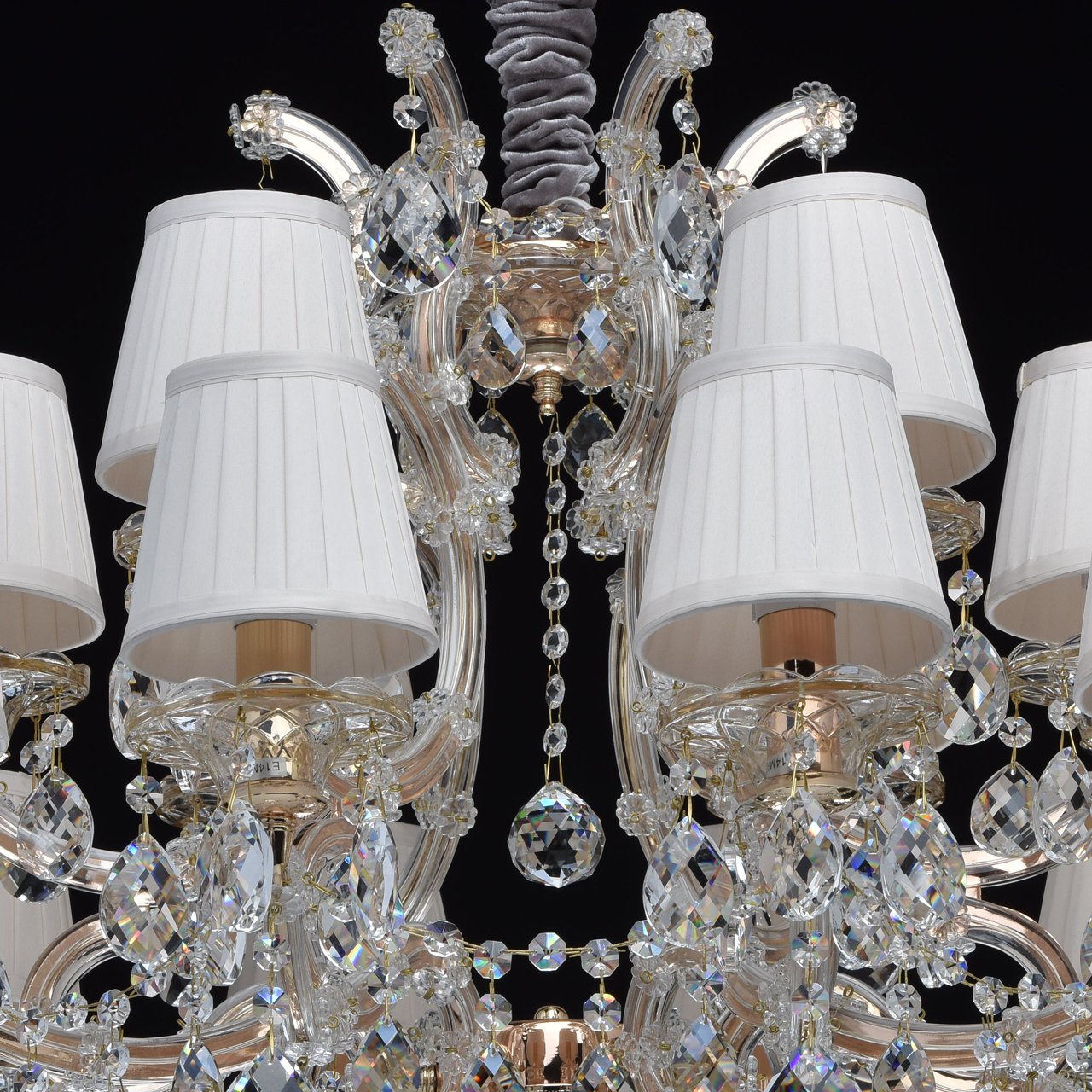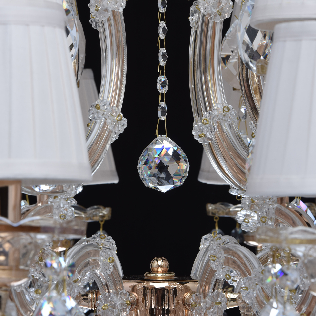 Металлическое основание цвета золота, декоративные элементы из прозрачного стекла, хрустальные подвески из прозрачного хрусталя, текстильные абажуры белого цвета.Технология производства