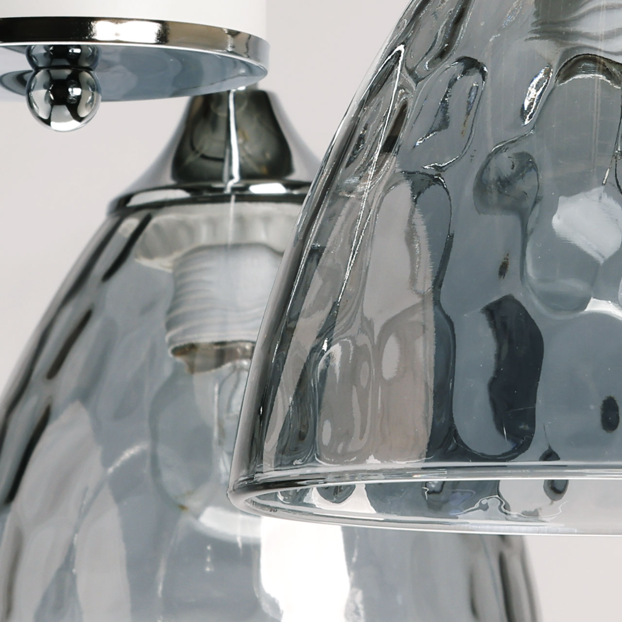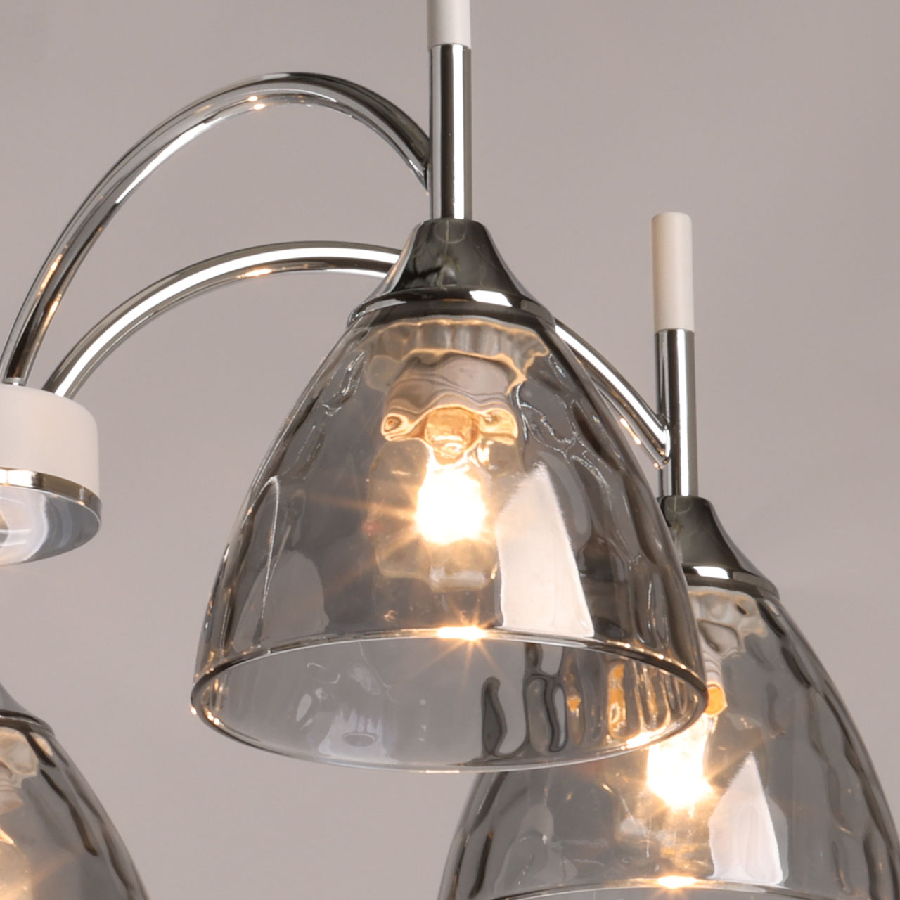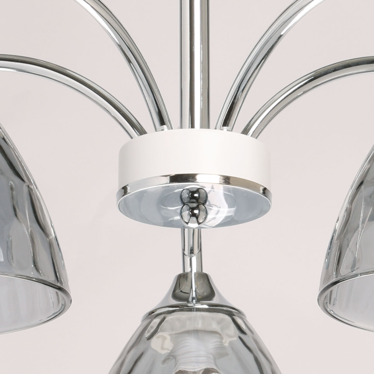 Основание/ металл/ хром, белый Плафон/ стекло/ дымчатое white+chrome/metal grayt/glass 5*60W Е27Модное сочетание белого и цвета хрома придает потолочной люстре легкости и воздушности. Ячеистая фактура плафонов добавляет потолочной люстре индивидуальности. Компактный размер потолочной люстры позволяет сохранить пространство комнаты при стандартном потолке. Заменяемые источники света удобны в эксплуатации. Металлическое основание потолочной люстры гальванизировано в цвет хрома. Отдельные элементы основания окрашены в белый цвет. Плафоны выполнены из фактурного стекла, гальванизированного в дымчатый цвет.