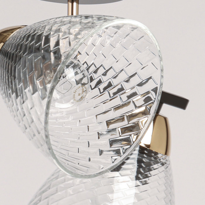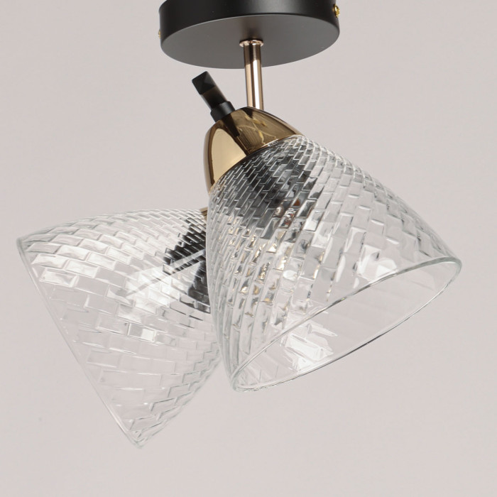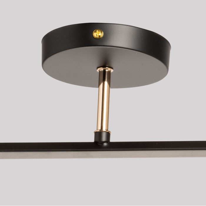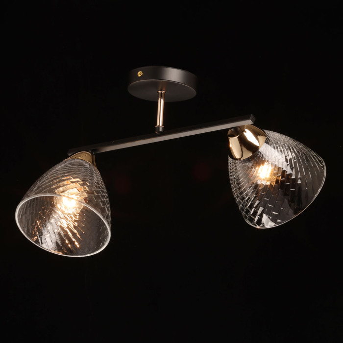 Контрастное сочетание глубокого черного цвета и цвета бронзы добавляют люстре элегантности и стиля. Прямые линии основания люстры подчеркивают современность дизайну. Плафоны из фактурного стекла соответствуют тренду геометричности и создают красивую игру света. Свет, направленный в разные стороны позволяет ярко осветить пространство. Заменяемые источники света удобны в эксплуатации.Металлическое основание потолочной люстры окрашено в черный цвет. Отдельные элементы основания гальванизированы в цвет золота. Потолочный светильник декорирован плафонами из прозрачного фактурного стекла.