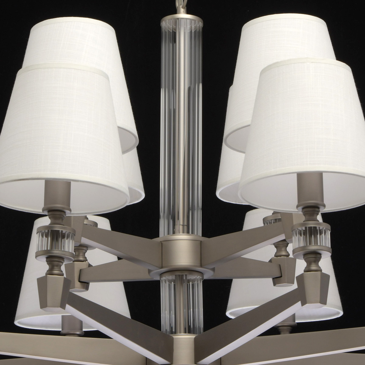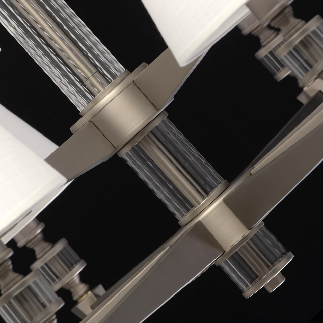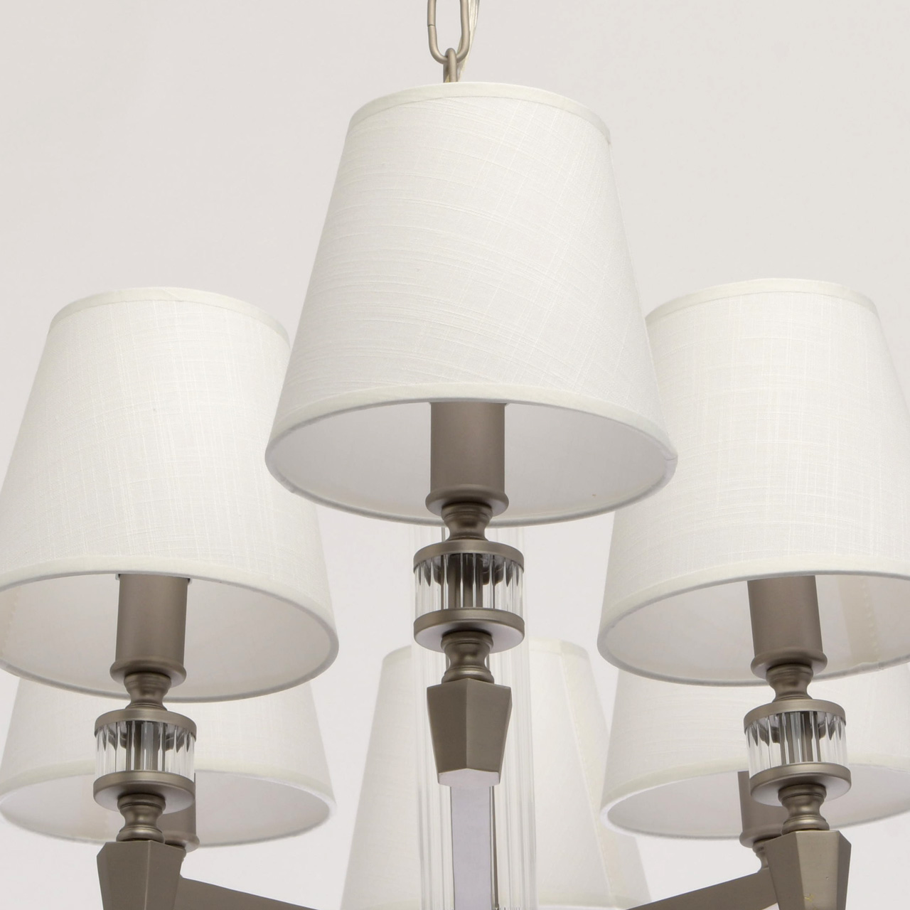 Основание светильника выполнено из комбинации сплавов металлов и гальванизировано в цвет никеля. Потолочная чаша - металл, обработка на токарном станке. Рожки - сплав алюминия, художественное литье. Декор - прозрачное стекло. Тканевые абажуры - белого цвета, с кантом сверху и снизу в цвет абажура. С внутренней стороны термостойкий акрил. Абажуры прошиты.Тип помещения