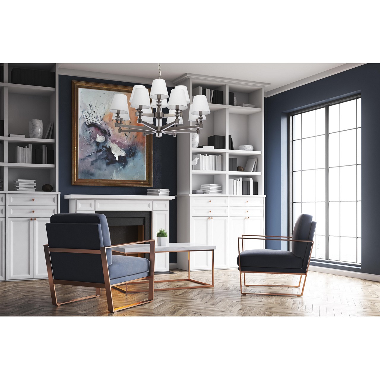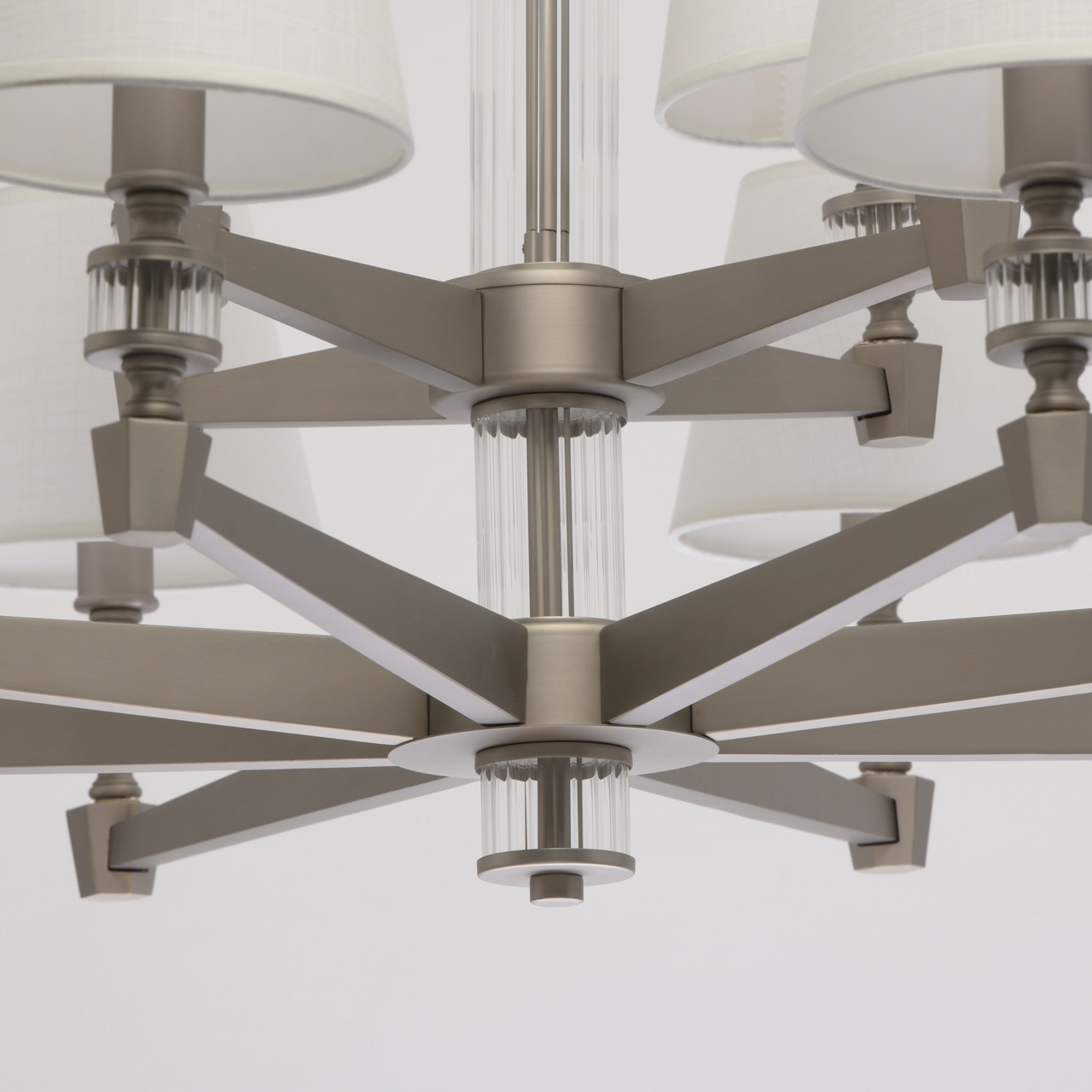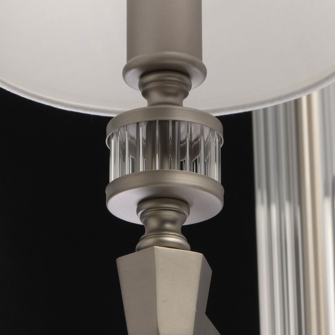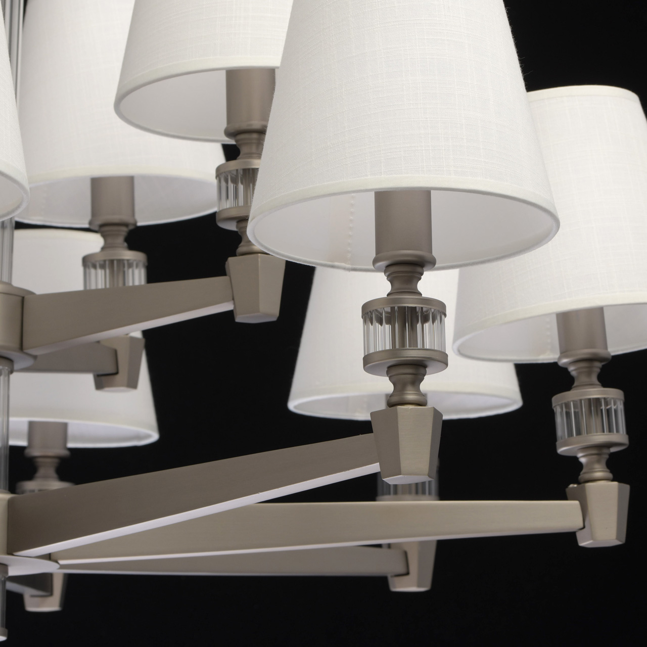 Основание светильника выполнено из комбинации сплавов металлов и гальванизировано в цвет никеля. Потолочная чаша - металл, обработка на токарном станке. Рожки - сплав алюминия, художественное литье. Декор - прозрачное стекло. Тканевые абажуры - белого цвета, с кантом сверху и снизу в цвет абажура. С внутренней стороны термостойкий акрил. Абажуры прошиты.Тип помещения