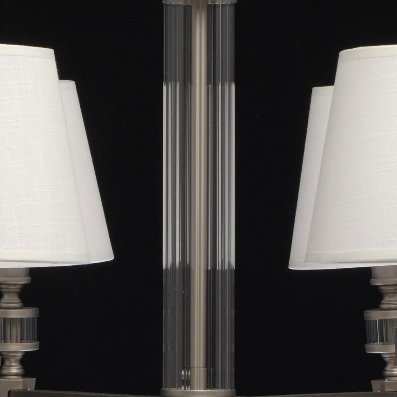 Основание светильника выполнено из комбинации сплавов металлов и гальванизировано в цвет никеля. Потолочная чаша - металл, обработка на токарном станке. Рожки - сплав алюминия, художественное литье. Декор - прозрачное стекло. Тканевые абажуры - белого цвета, с кантом сверху и снизу в цвет абажура. С внутренней стороны термостойкий акрил. Абажуры прошиты.Тип помещения