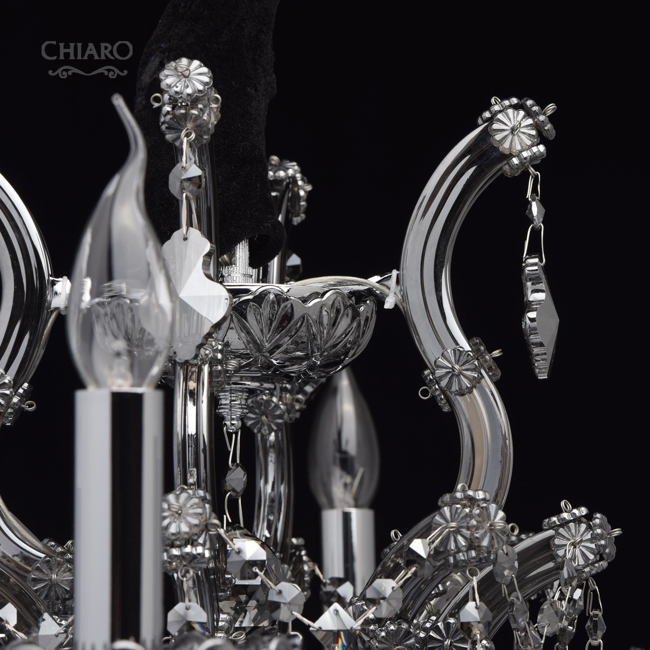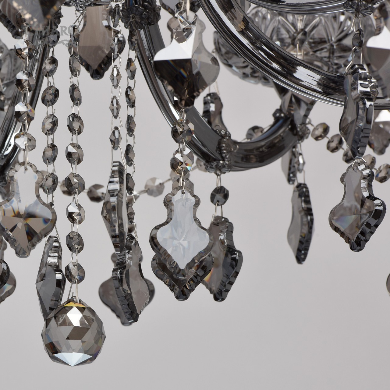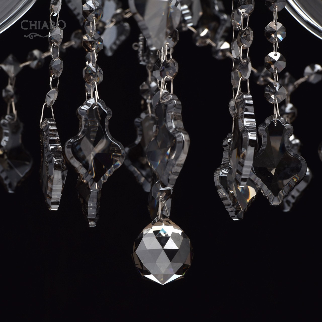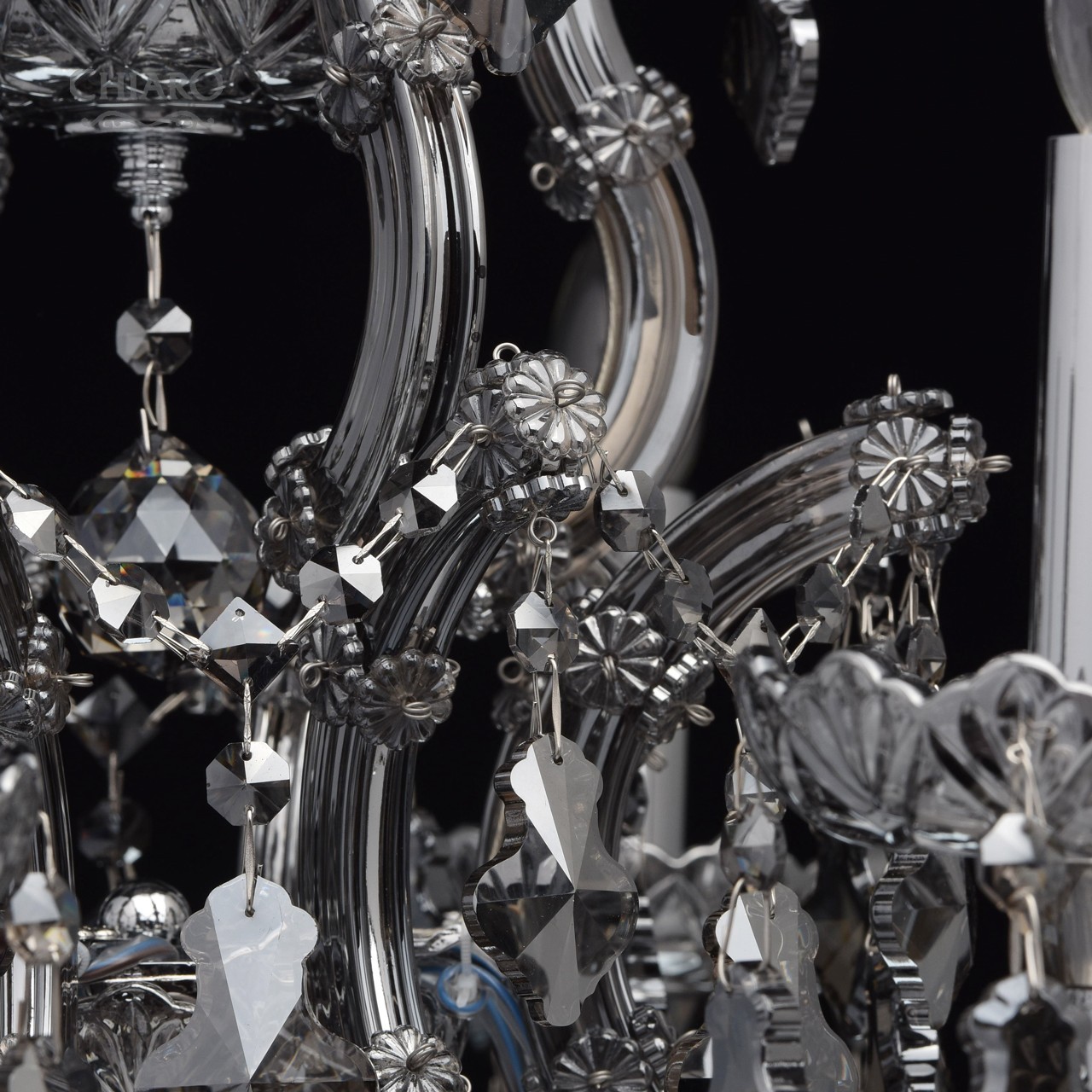 Металлическое основание цвета хрома, стеклянные накладки из выдувного стекла и хрустальные подвески цвета антрацитТехнология производства