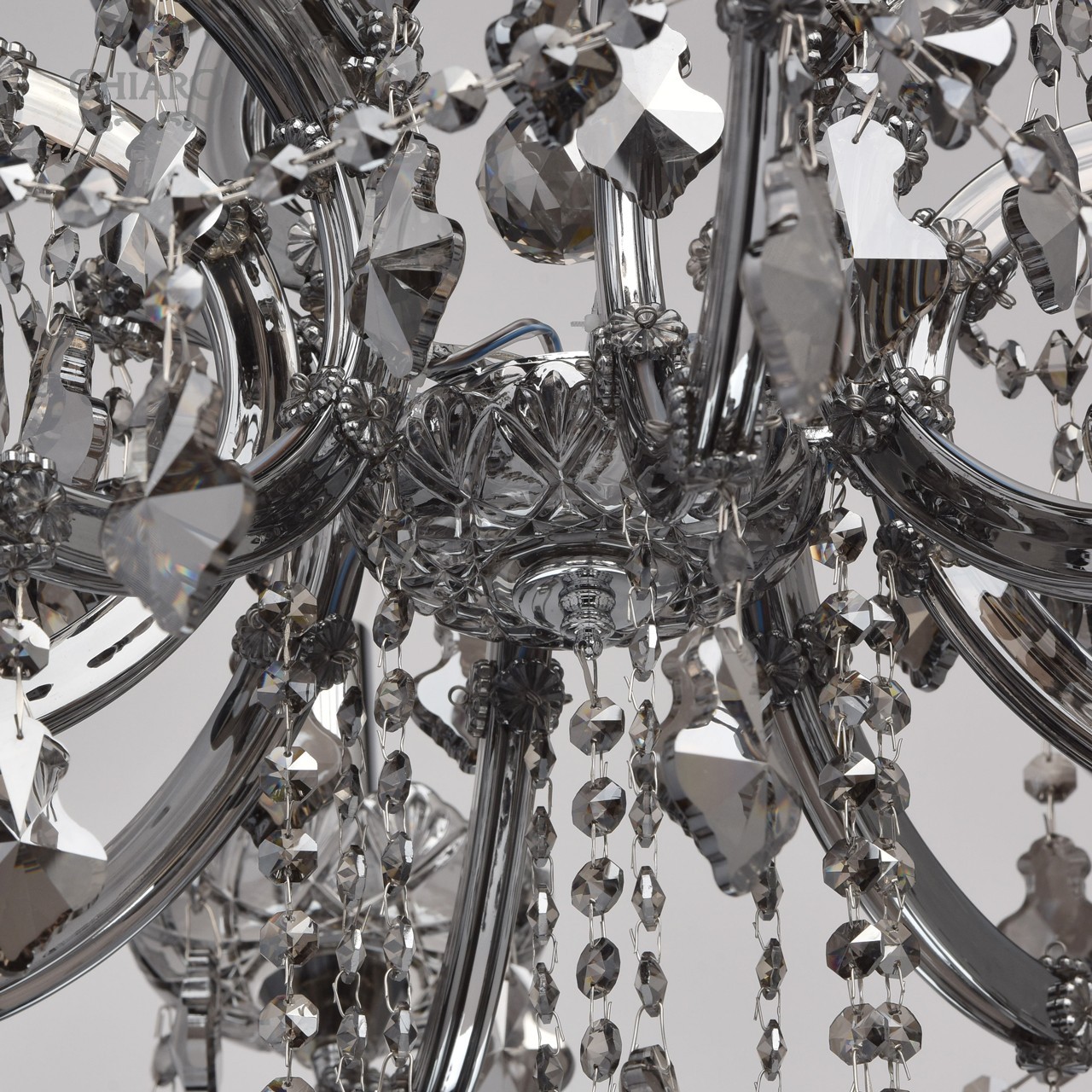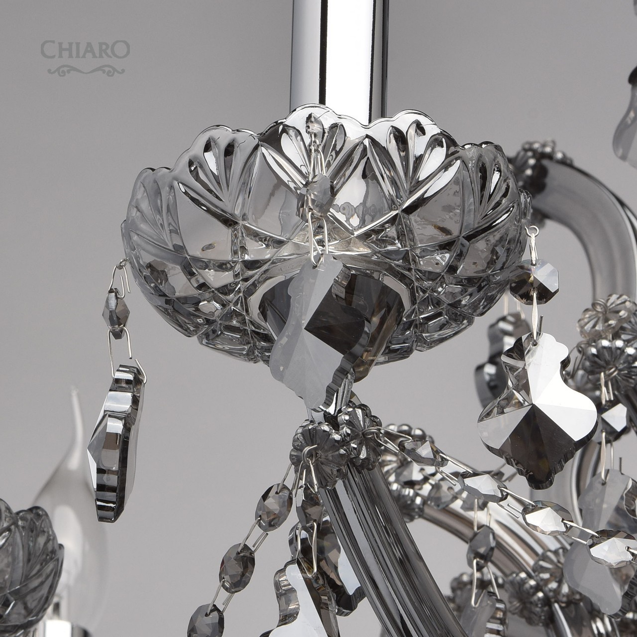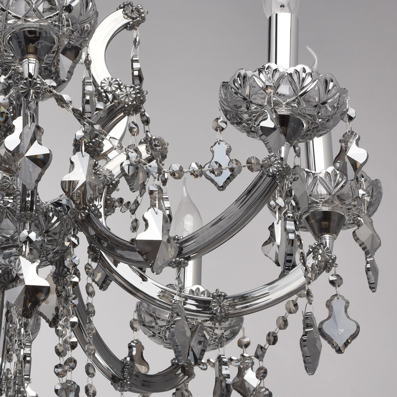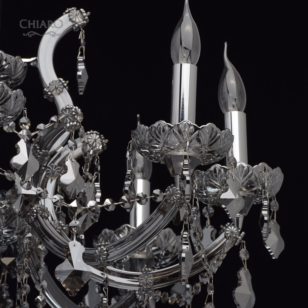 Металлическое основание цвета хрома, стеклянные накладки из выдувного стекла и хрустальные подвески цвета антрацитТехнология производства
