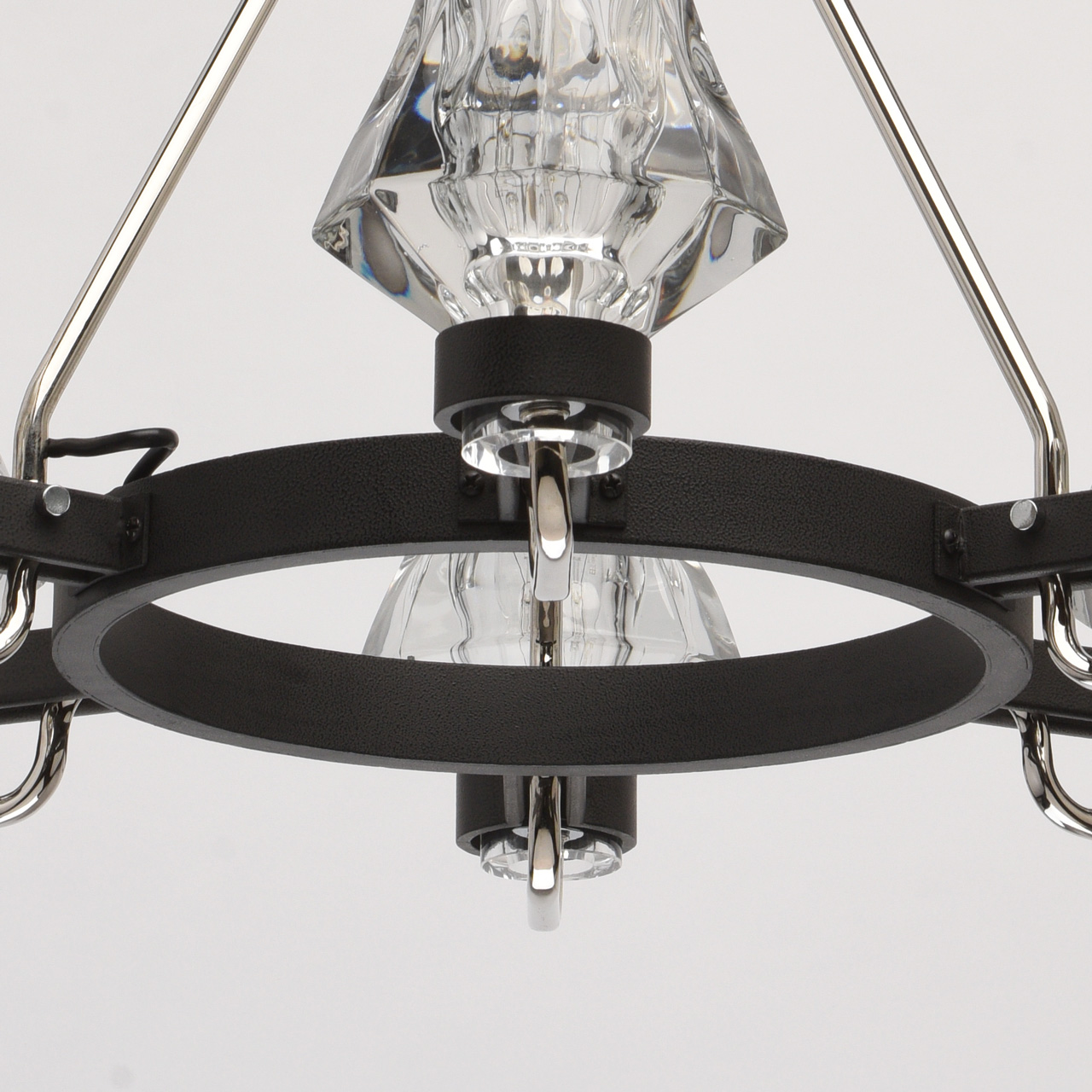 Основание светильника выполнено из металла и обработано по технологии порошкового окрашивания с эффектом фактурной поверхности в черный матовый цвет. Держатели плафонов выполнены по технологии художественного литья. Рожки гальванизированы в цвет хрома. Плафоны отлиты из прозрачного стекла в сложную форму.Тип помещения