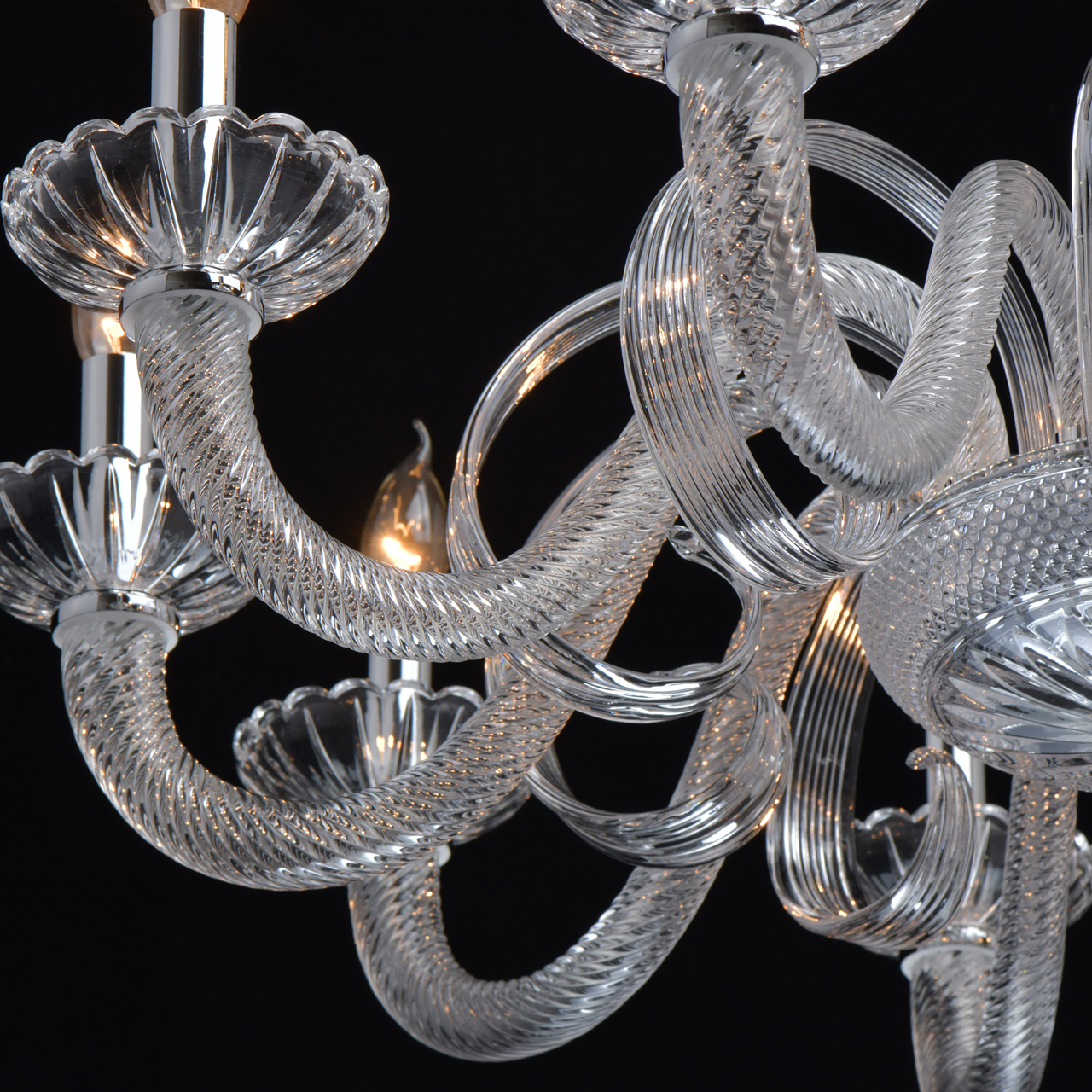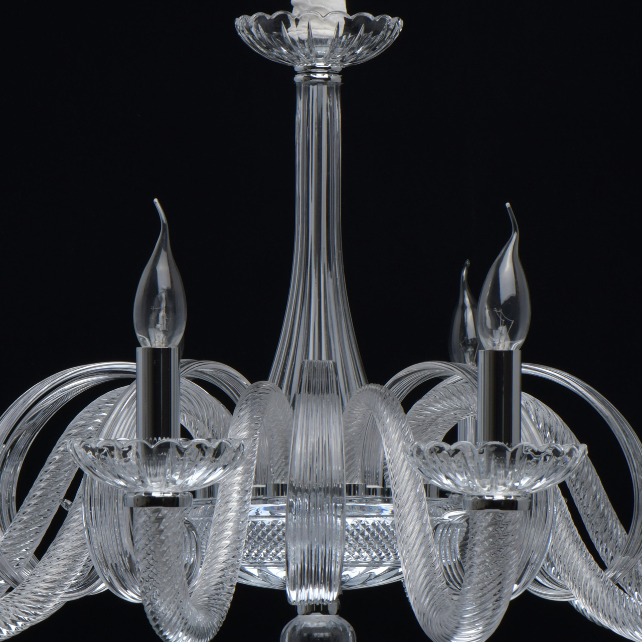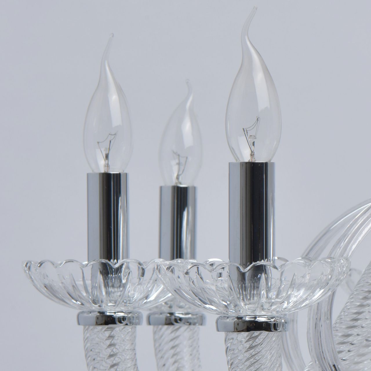 Основание светильника выполнено из гутного прозрачного стекла. Рожки выполнены по технологии твист. Декоративные элементы - по технологии вытягивания. Декоративные розетки отлиты в сложную форму. Отдельные элементы основания гальванизированы в цвет хрома.Тип помещения