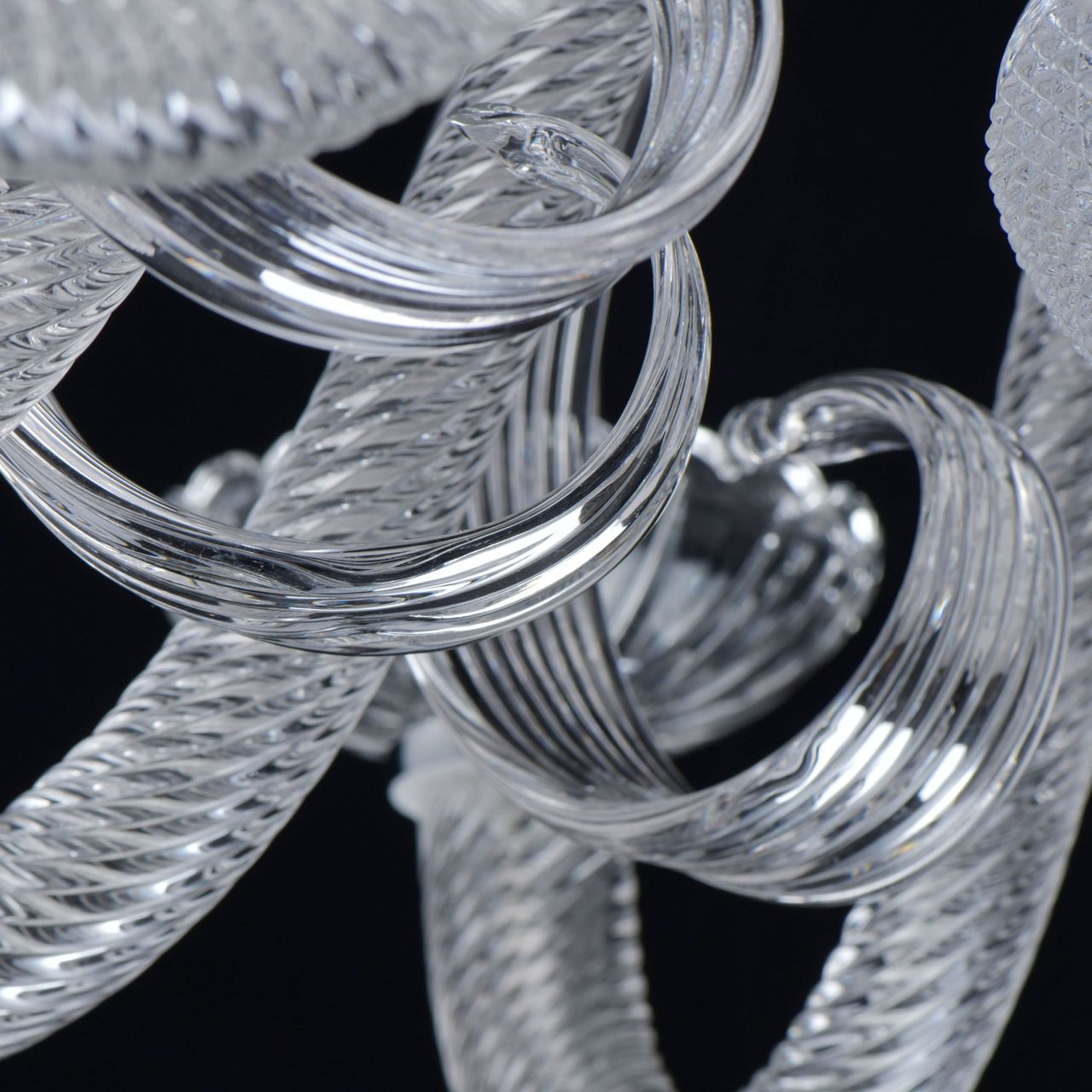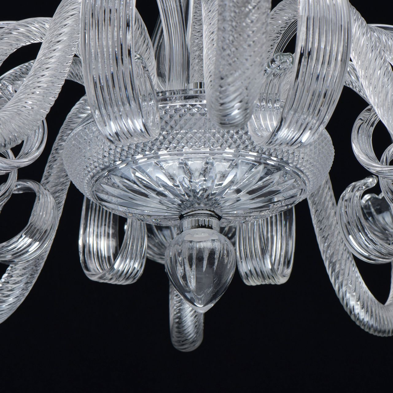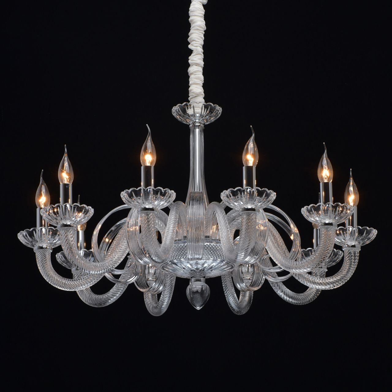 Основание светильника выполнено из гутного прозрачного стекла. Рожки выполнены по технологии твист. Декоративные элементы - по технологии вытягивания. Декоративные розетки отлиты в сложную форму. Отдельные элементы основания гальванизированы в цвет хрома.Тип помещения