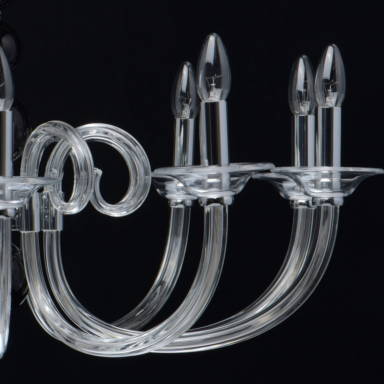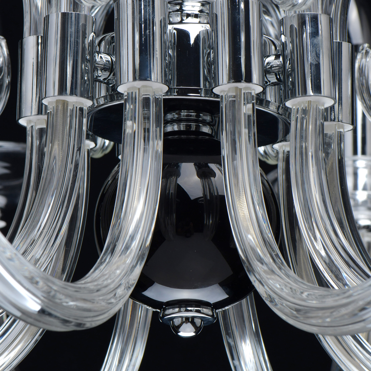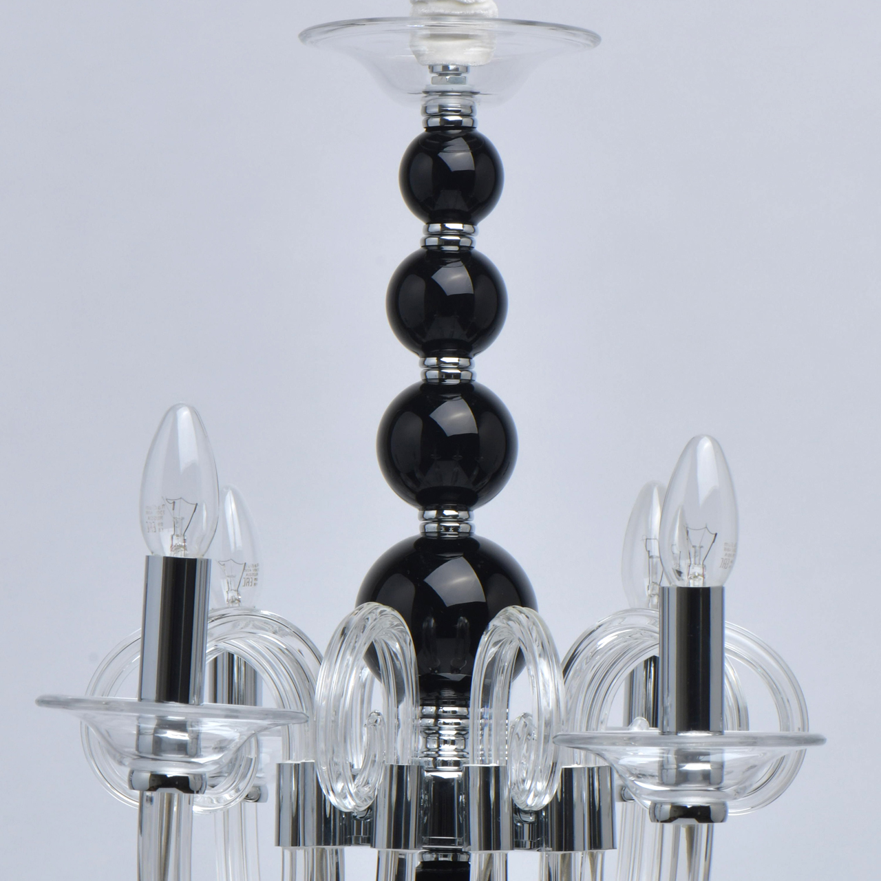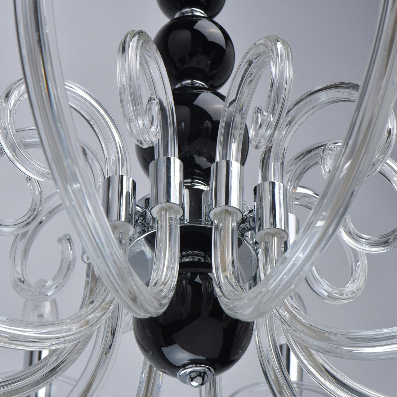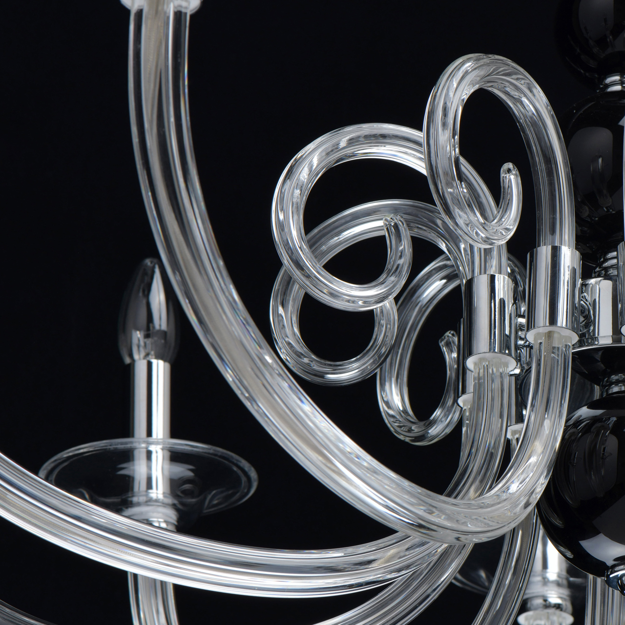 Основание светильника выполнено из гутного прозрачного стекла. Рожки и декоративные элементы выдуваются вручную. Декоративные элементы в виде сфер на центральной оси выполнены из стекла, окрашенного в массе в черный цвет. Отдельные элементы основания гальванизированы в цвет хрома.Тип помещения