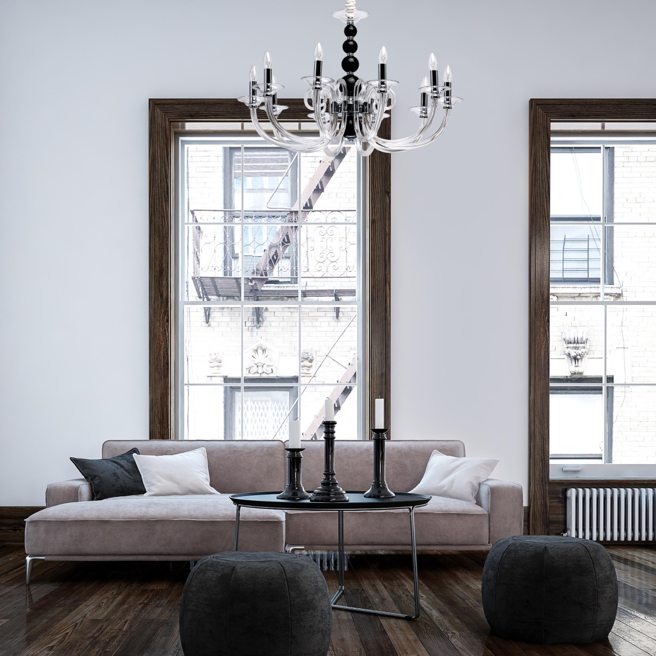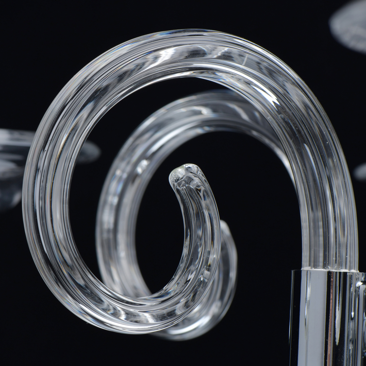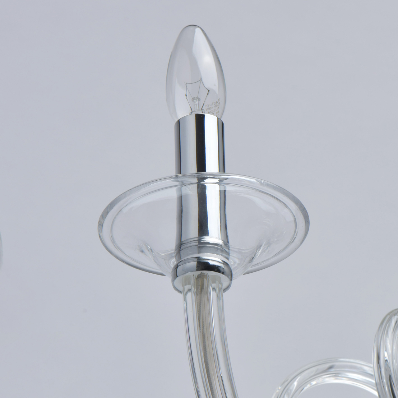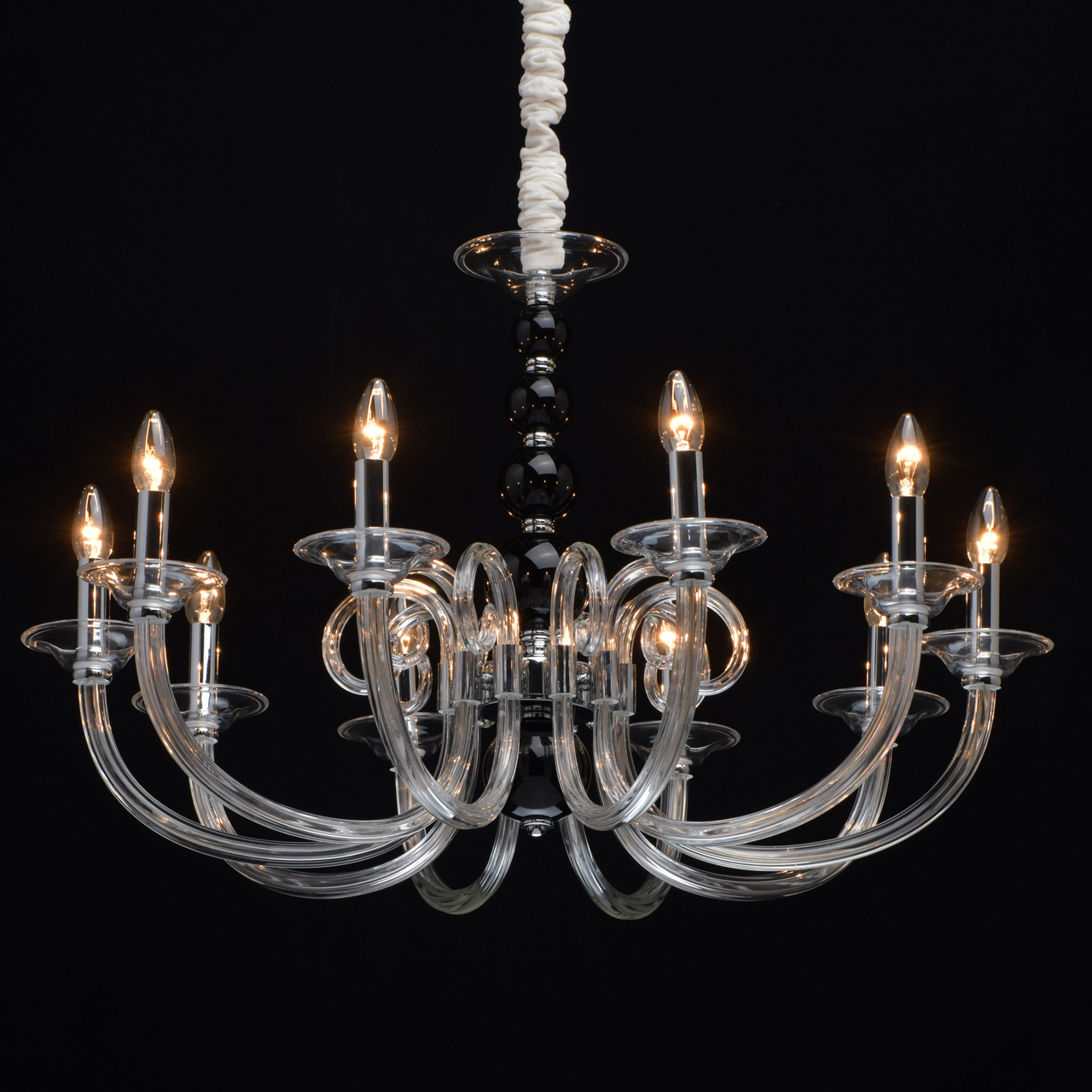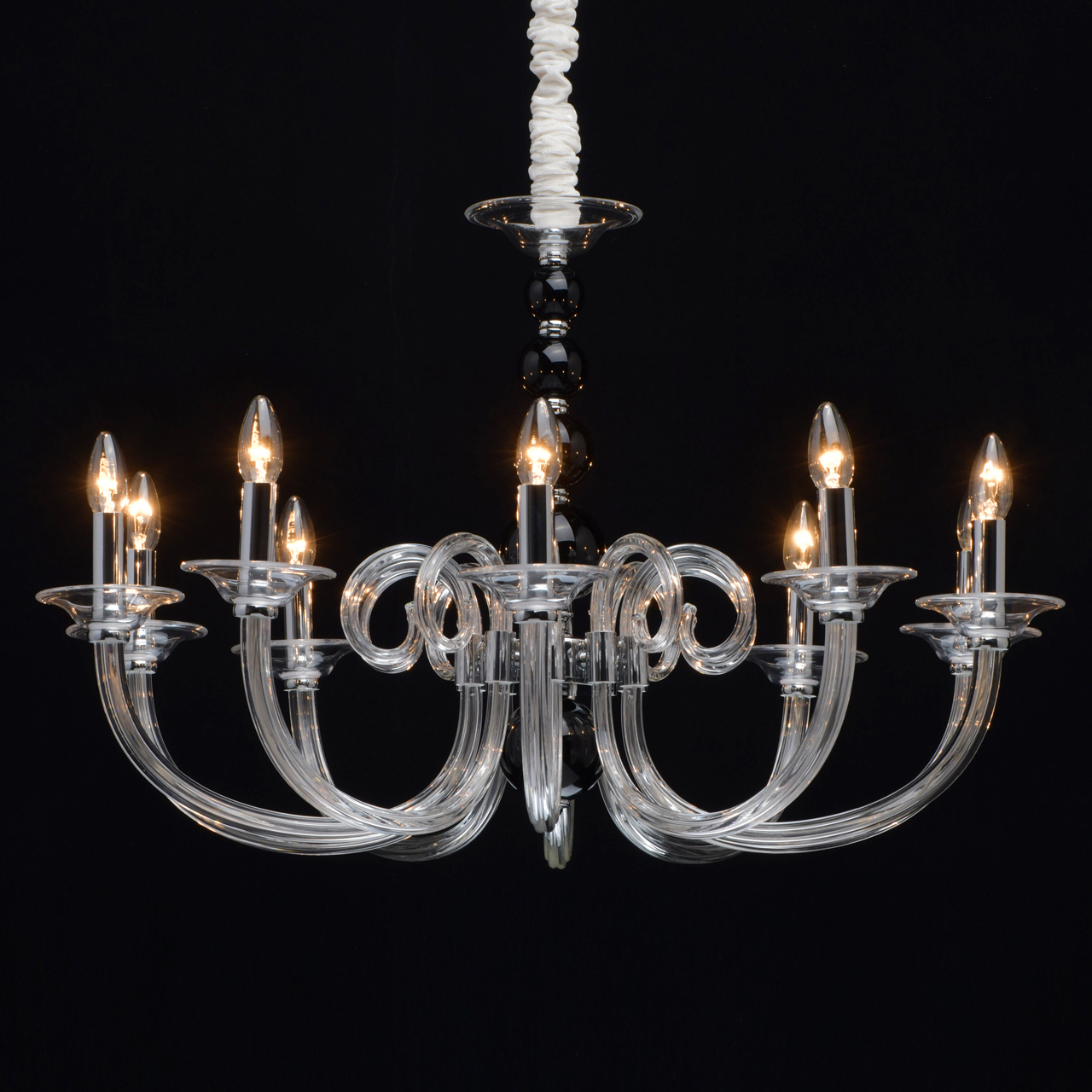 Основание светильника выполнено из гутного прозрачного стекла. Рожки и декоративные элементы выдуваются вручную. Декоративные элементы в виде сфер на центральной оси выполнены из стекла, окрашенного в массе в черный цвет. Отдельные элементы основания гальванизированы в цвет хрома.Тип помещения