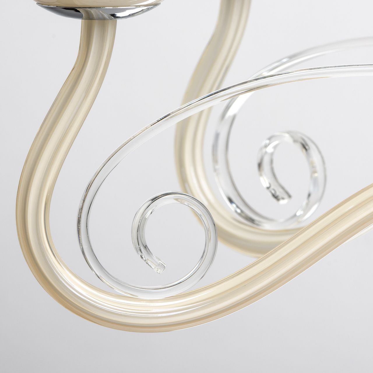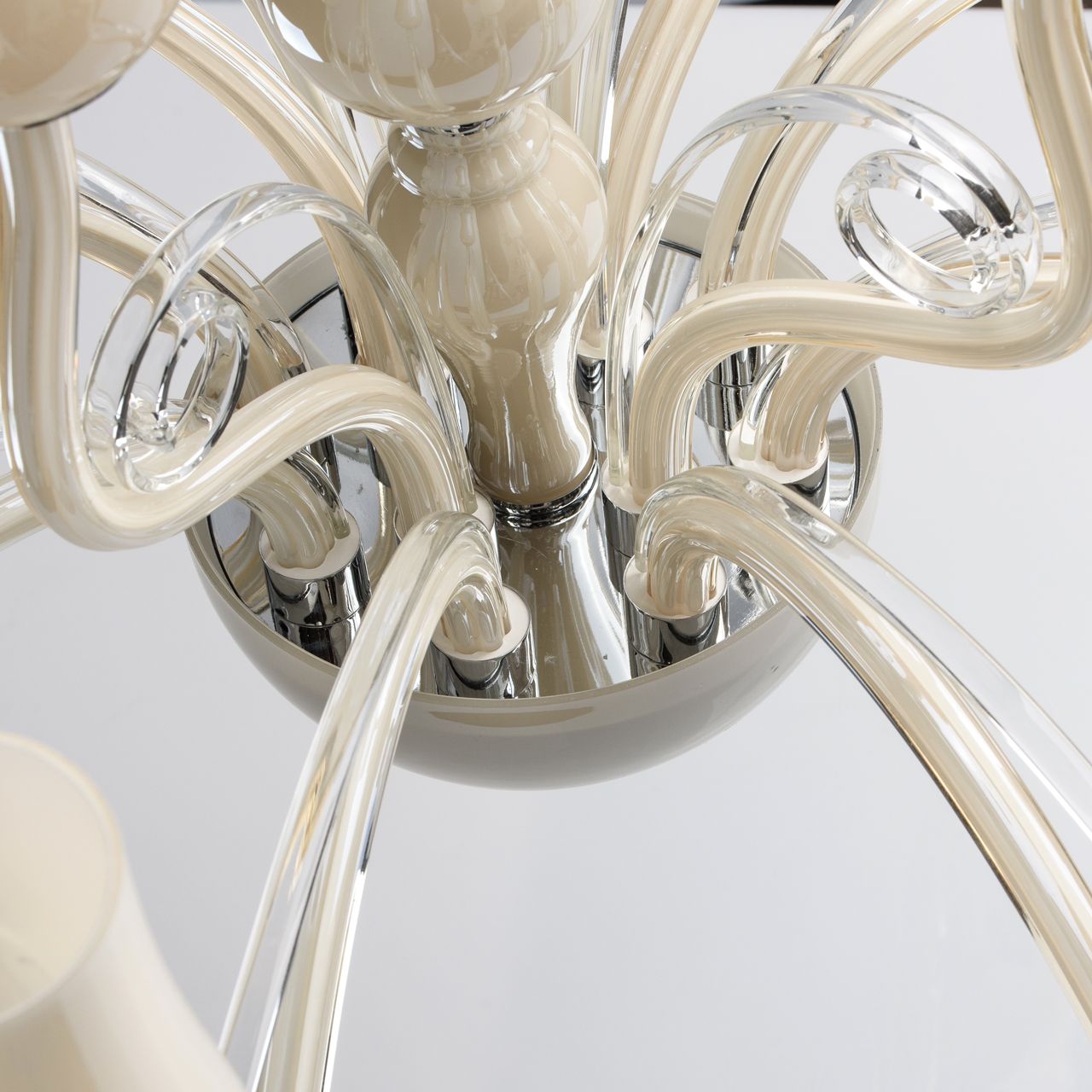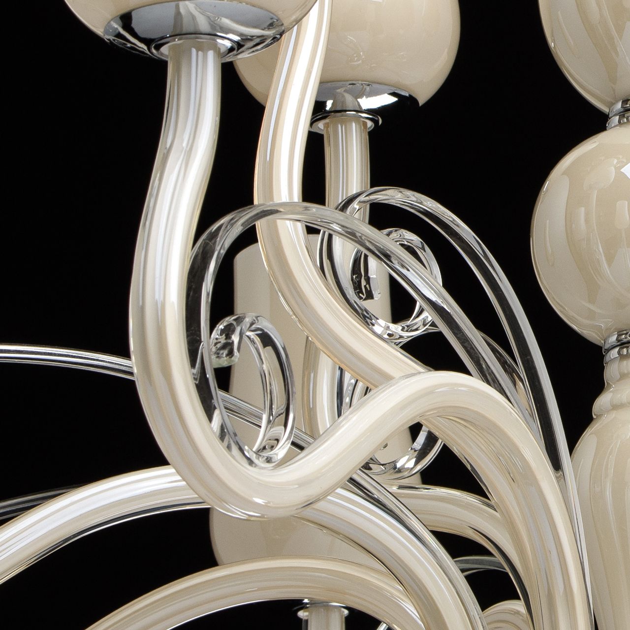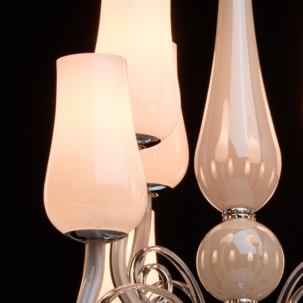 Основание светильника выполнено из сплава железа и гальванизировано в цвет хрома. Металлическая центральная ось закрыта декоративными элементами из стекла, окрашенного в массе в жемчужный цвет. Рожки выполнены из дутого стекла, окрашенного изнутри. Рожки декорированы элементами из прозрачного гутного стекла ручной работы. Плафоны выполнены из стекла окрашенного в массе в жемчужный цвет и отлитого в форму.Тип помещения