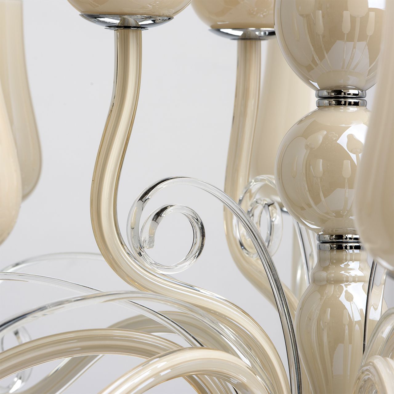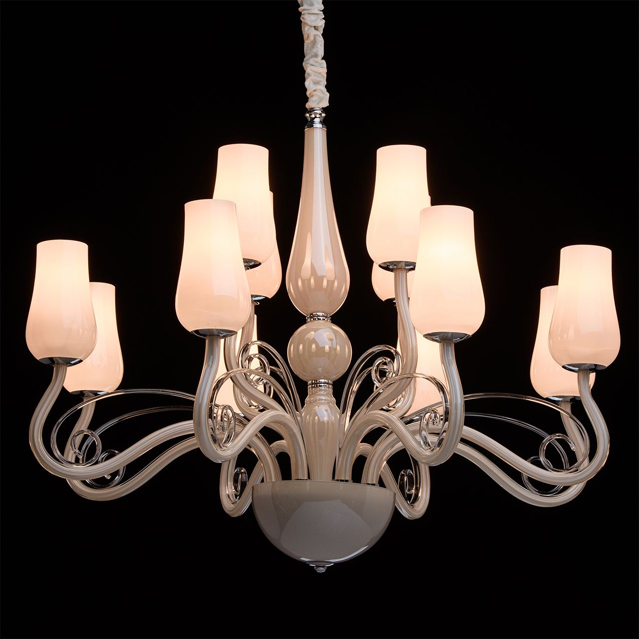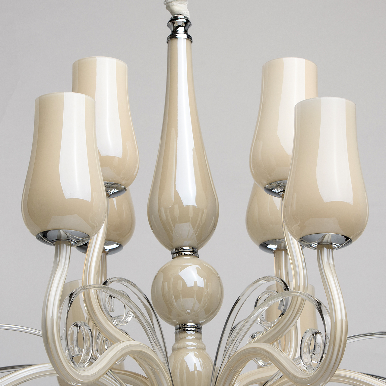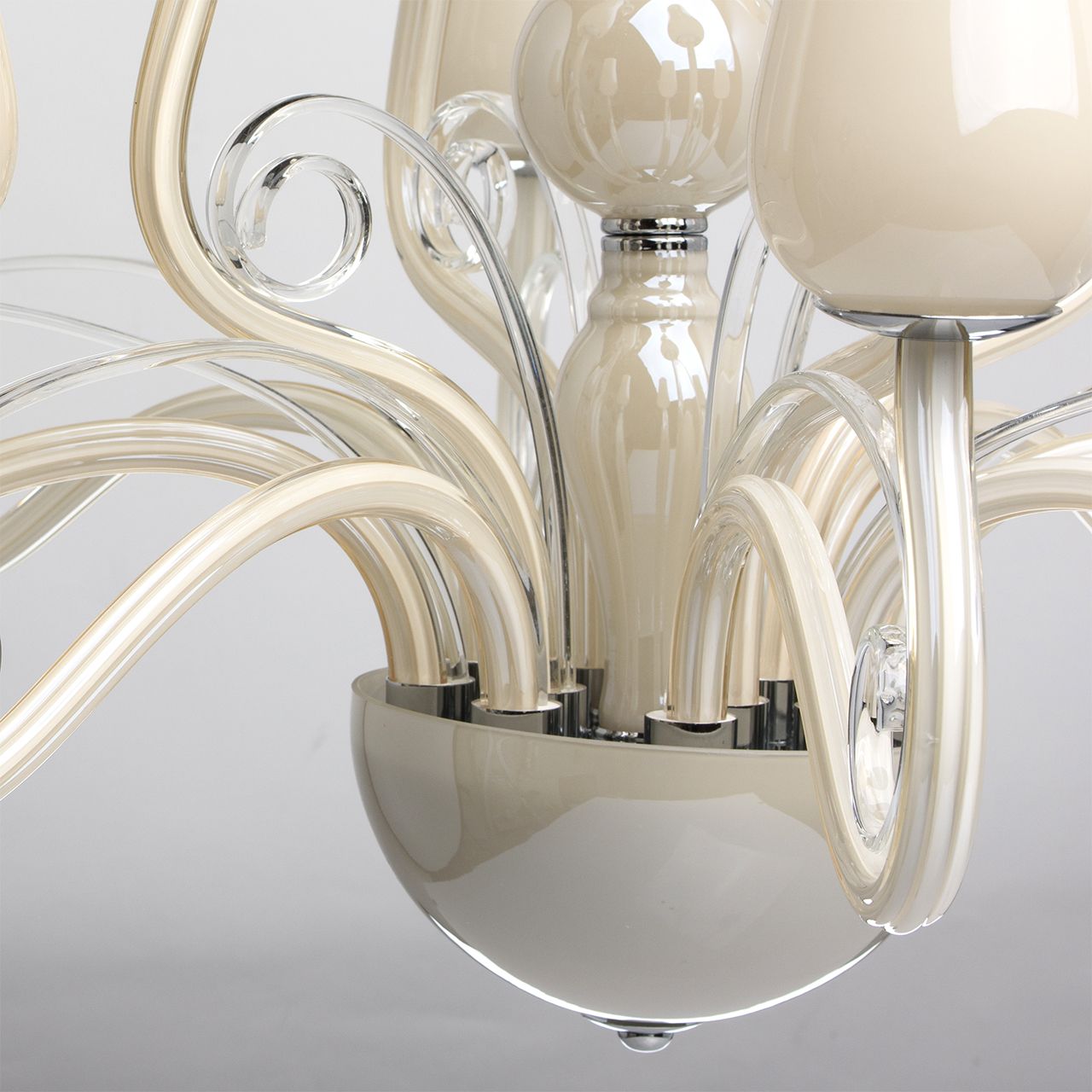 Основание светильника выполнено из сплава железа и гальванизировано в цвет хрома. Металлическая центральная ось закрыта декоративными элементами из стекла, окрашенного в массе в жемчужный цвет. Рожки выполнены из дутого стекла, окрашенного изнутри. Рожки декорированы элементами из прозрачного гутного стекла ручной работы. Плафоны выполнены из стекла окрашенного в массе в жемчужный цвет и отлитого в форму.Тип помещения