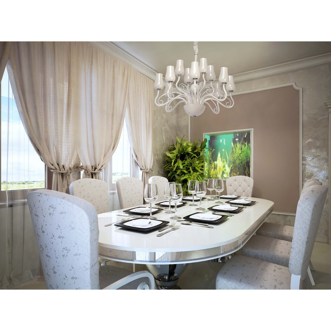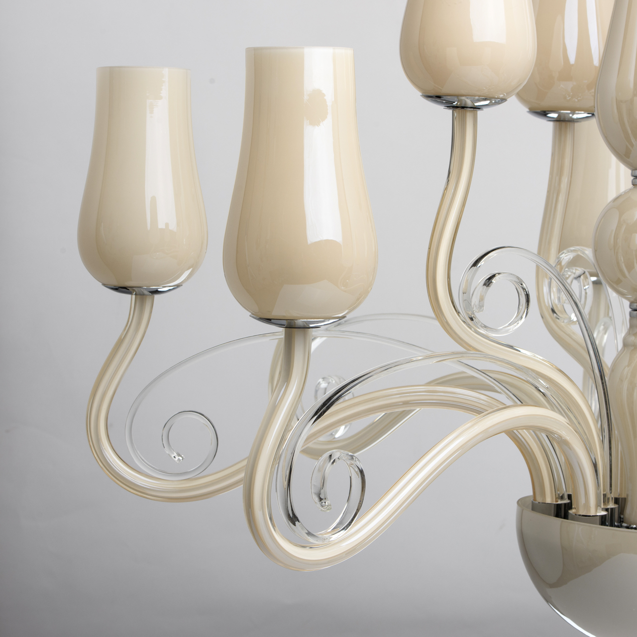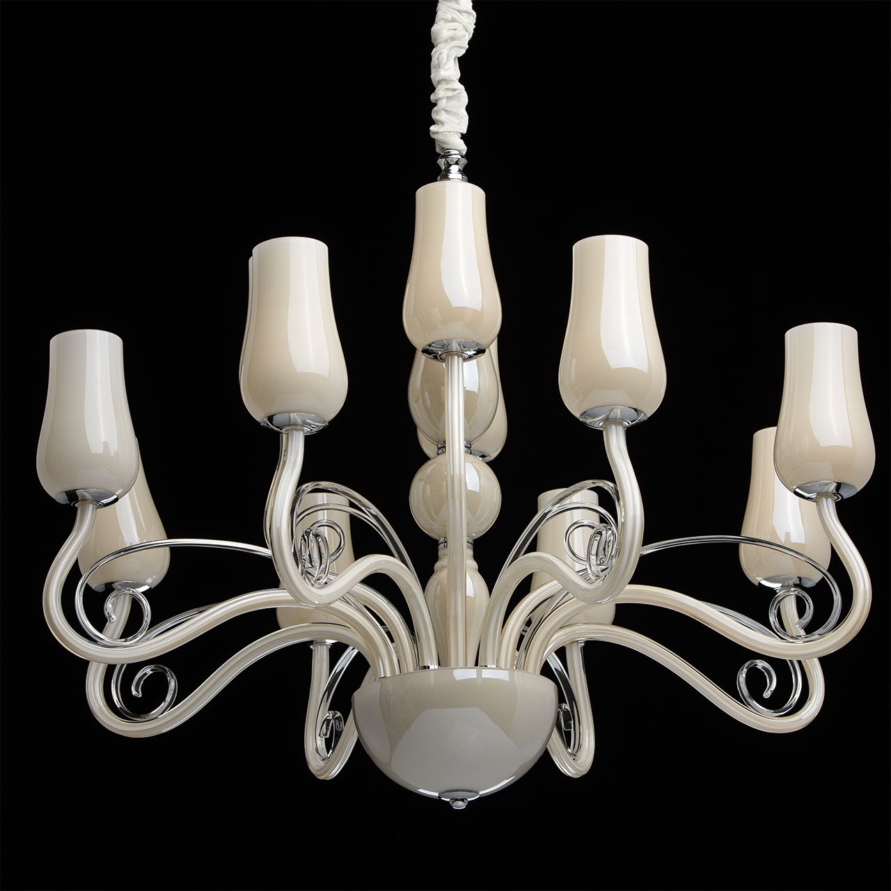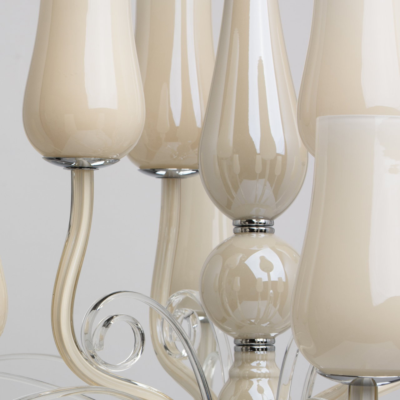 Основание светильника выполнено из сплава железа и гальванизировано в цвет хрома. Металлическая центральная ось закрыта декоративными элементами из стекла, окрашенного в массе в жемчужный цвет. Рожки выполнены из дутого стекла, окрашенного изнутри. Рожки декорированы элементами из прозрачного гутного стекла ручной работы. Плафоны выполнены из стекла окрашенного в массе в жемчужный цвет и отлитого в форму.Тип помещения