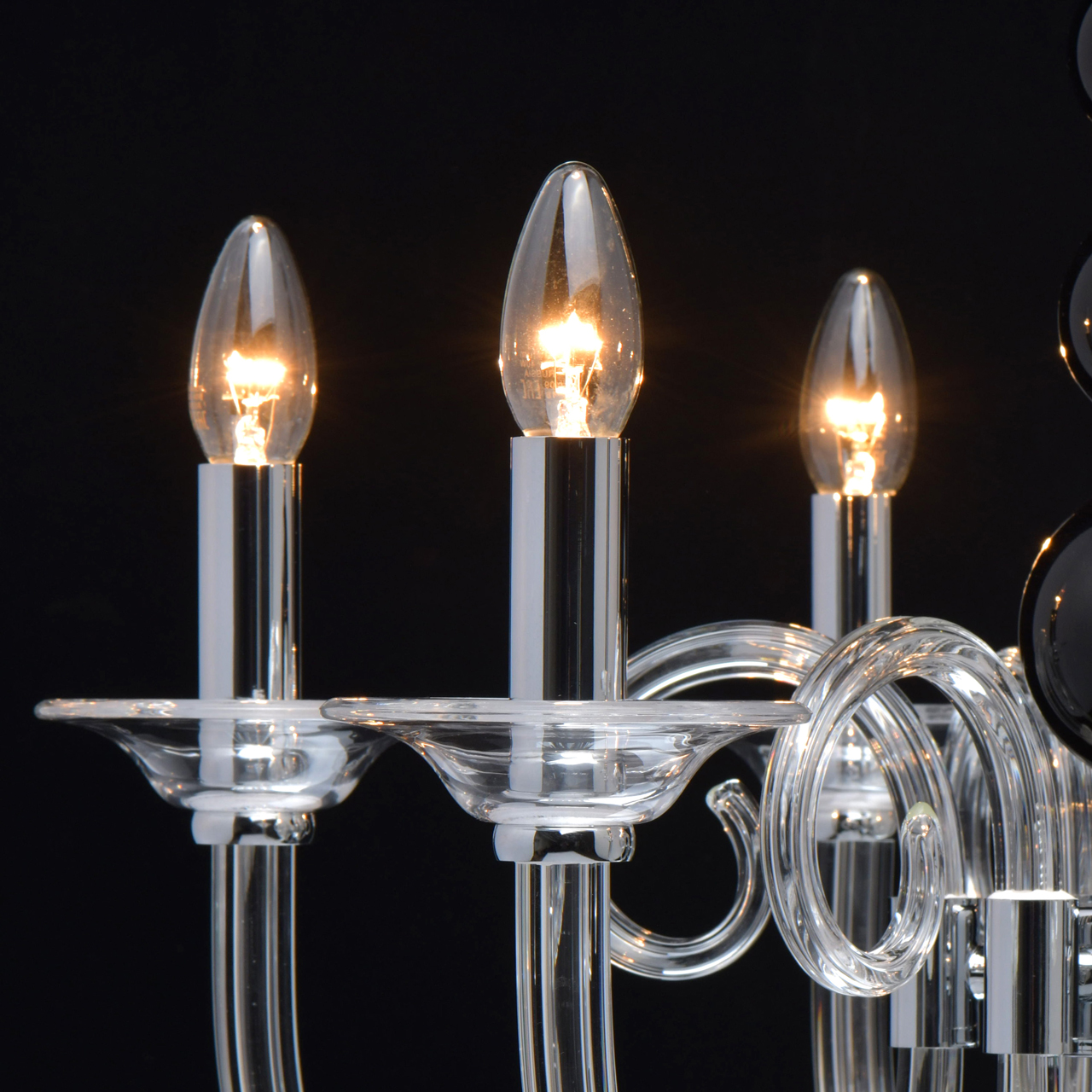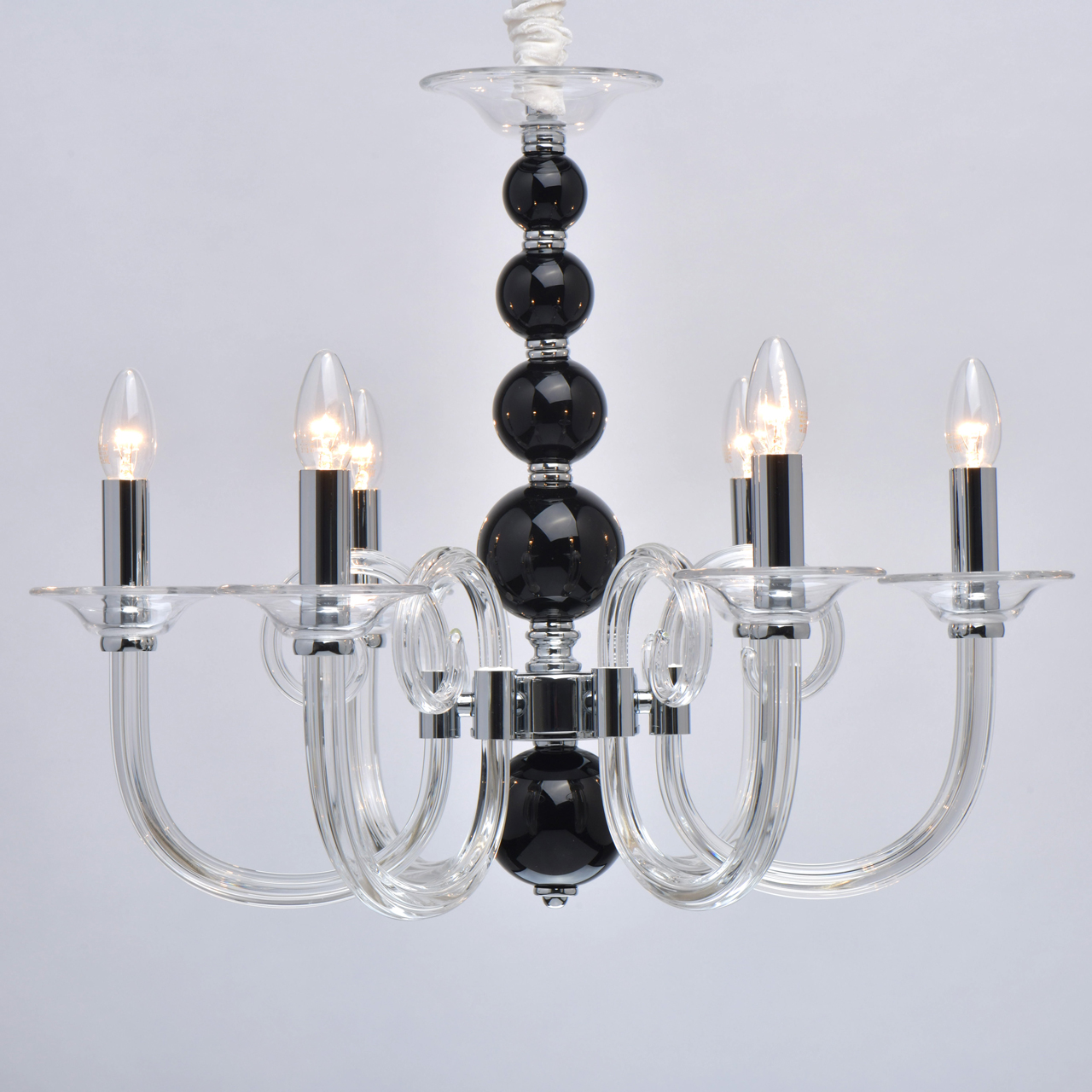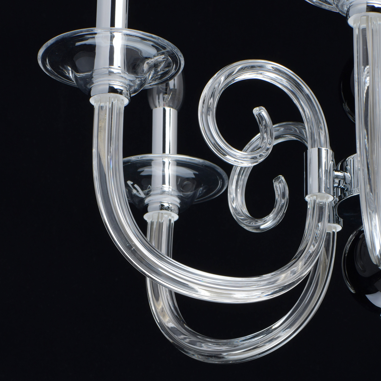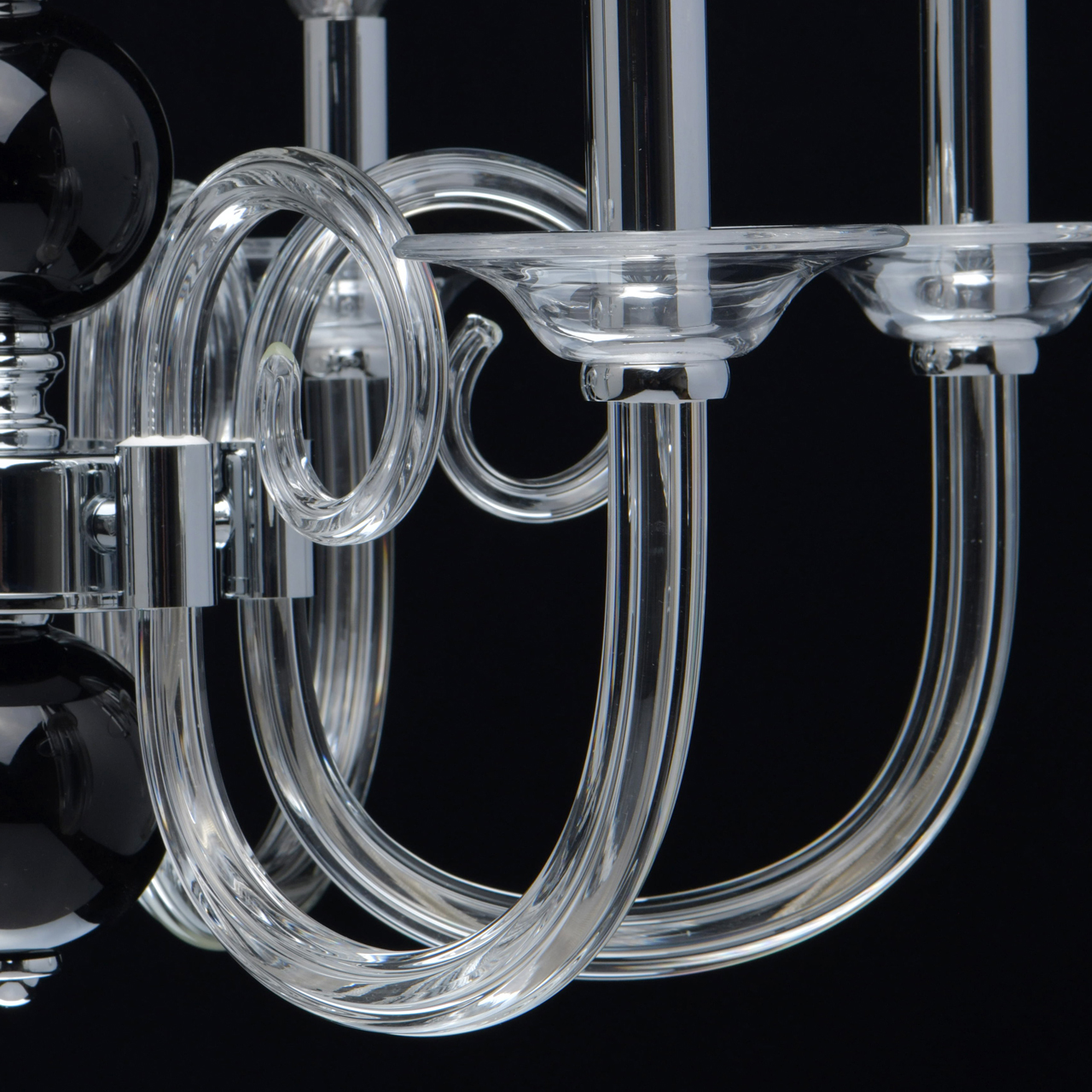 Основание светильника выполнено из гутного прозрачного стекла. Рожки и декоративные элементы выдуваются вручную. Декоративные элементы в виде сфер на центральной оси выполнены из стекла, окрашенного в массе в черный цвет. Отдельные элементы основания гальванизированы в цвет хрома.Тип помещения