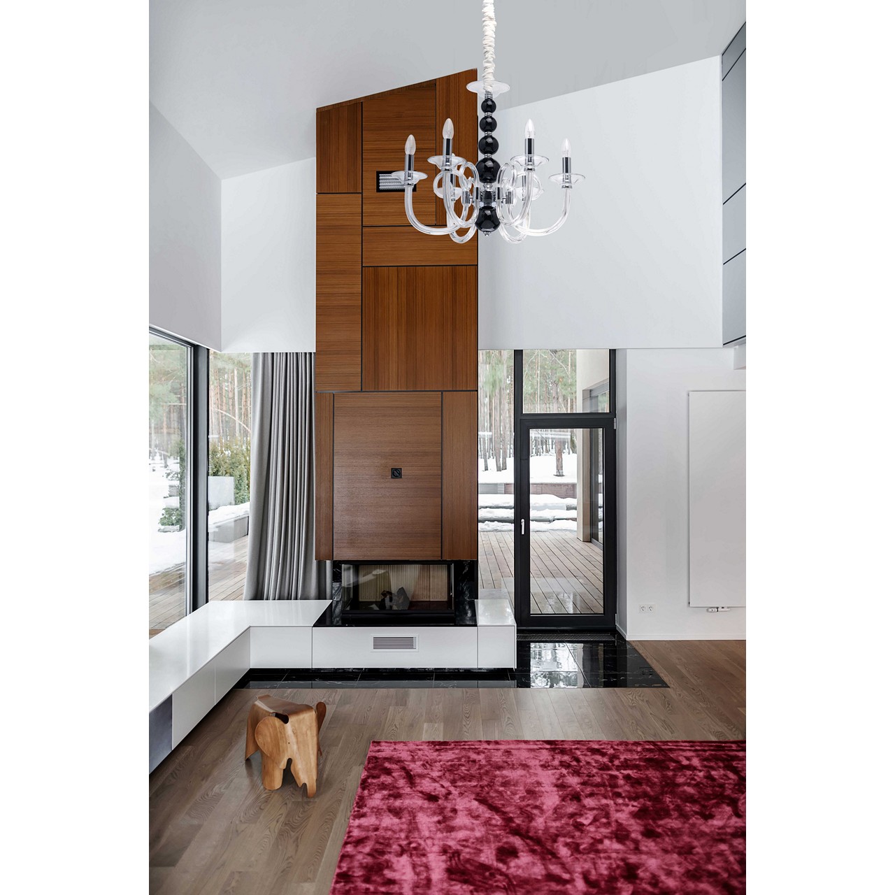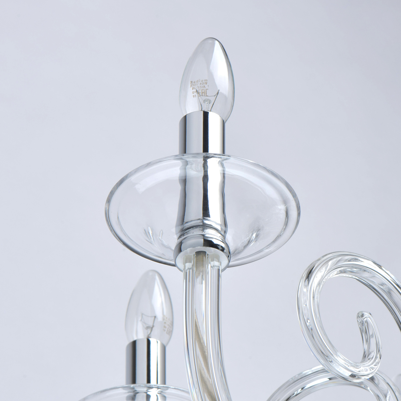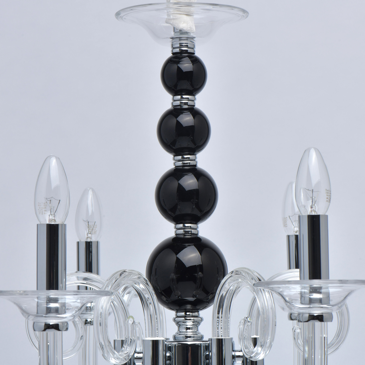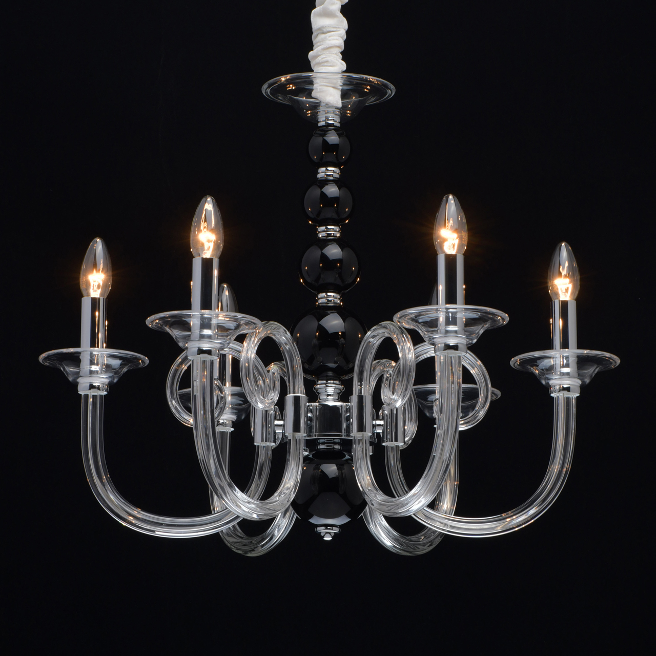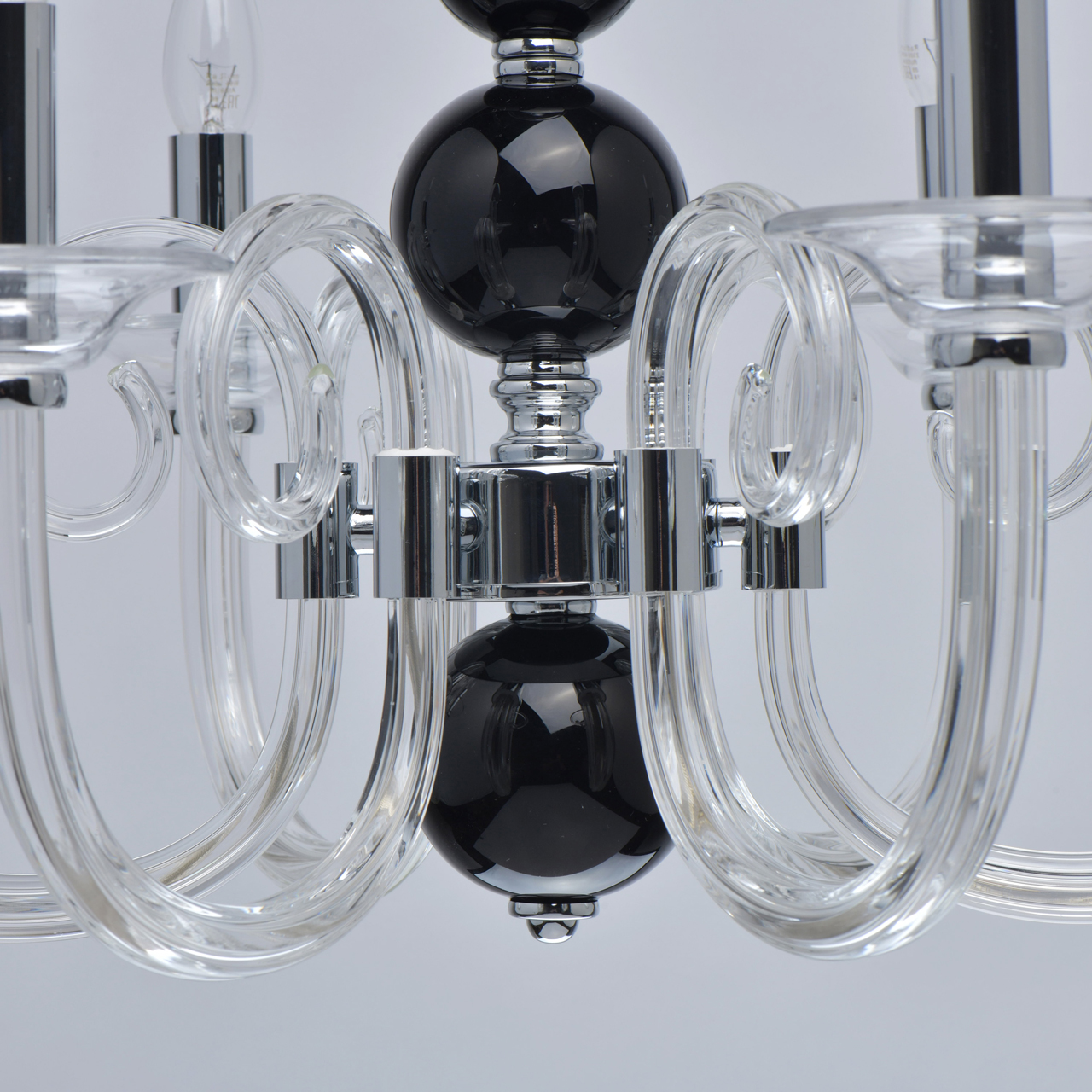 Основание светильника выполнено из гутного прозрачного стекла. Рожки и декоративные элементы выдуваются вручную. Декоративные элементы в виде сфер на центральной оси выполнены из стекла, окрашенного в массе в черный цвет. Отдельные элементы основания гальванизированы в цвет хрома.Тип помещения
