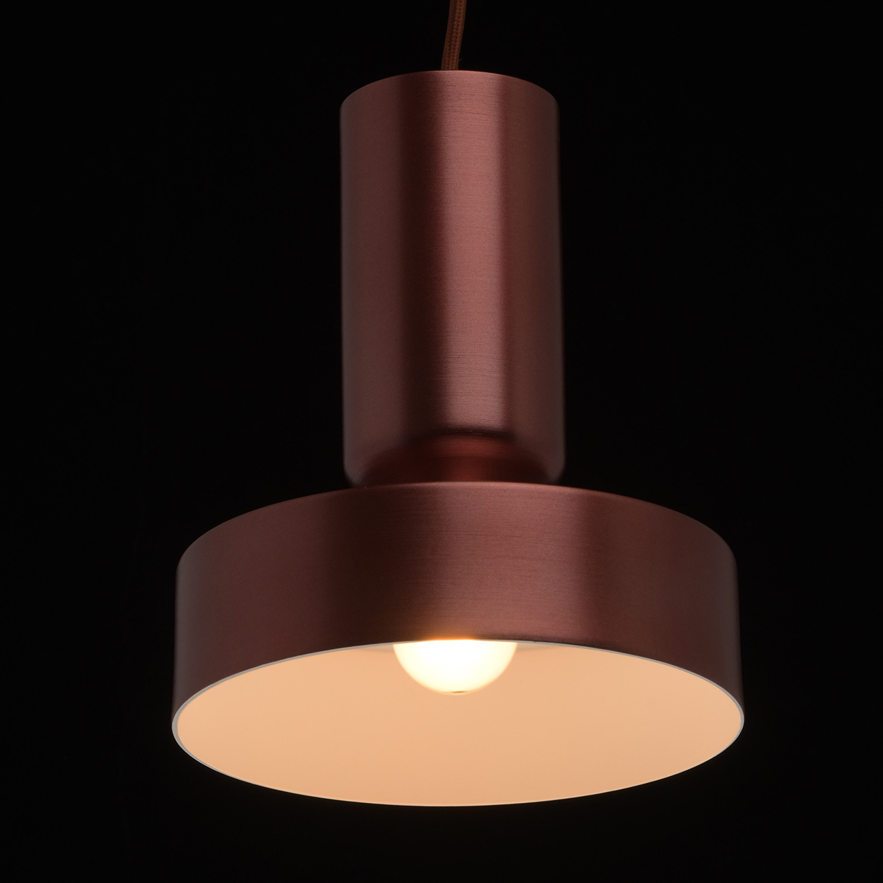 Нетривиальный и яркий светильник привлекает оригинальными формами и трендовой цветовой палитрой. Металлическое основание и плафон выполнены в цвете красной меди - это один из самых модных интерьерных тонов в наступившем сезоне. Изнутри плафон окрашен в белый оттенок, что делает свет более ярким. Под стать всей композиции и декоративный шнур в тон основанию. Такой светильник идеален для зональной подсветки современных интерьеров, особенно удачно он будет смотреться комбинация из нескольких подвесов.Преимущества модели