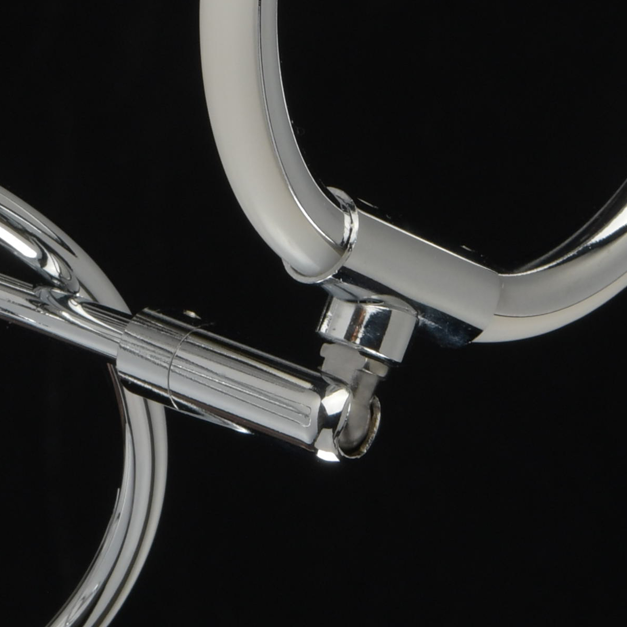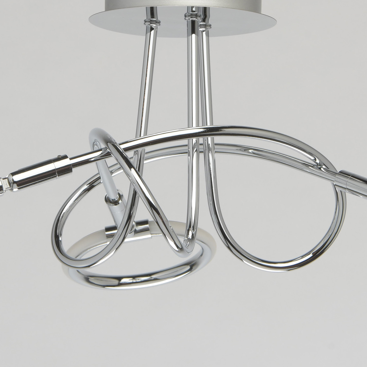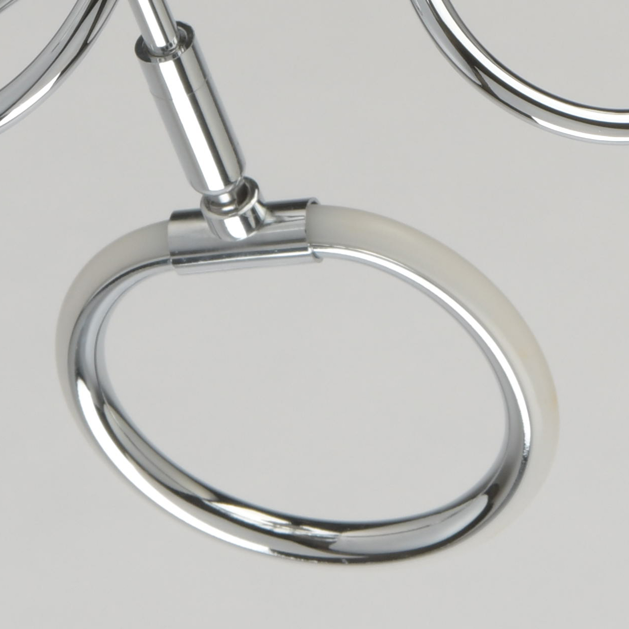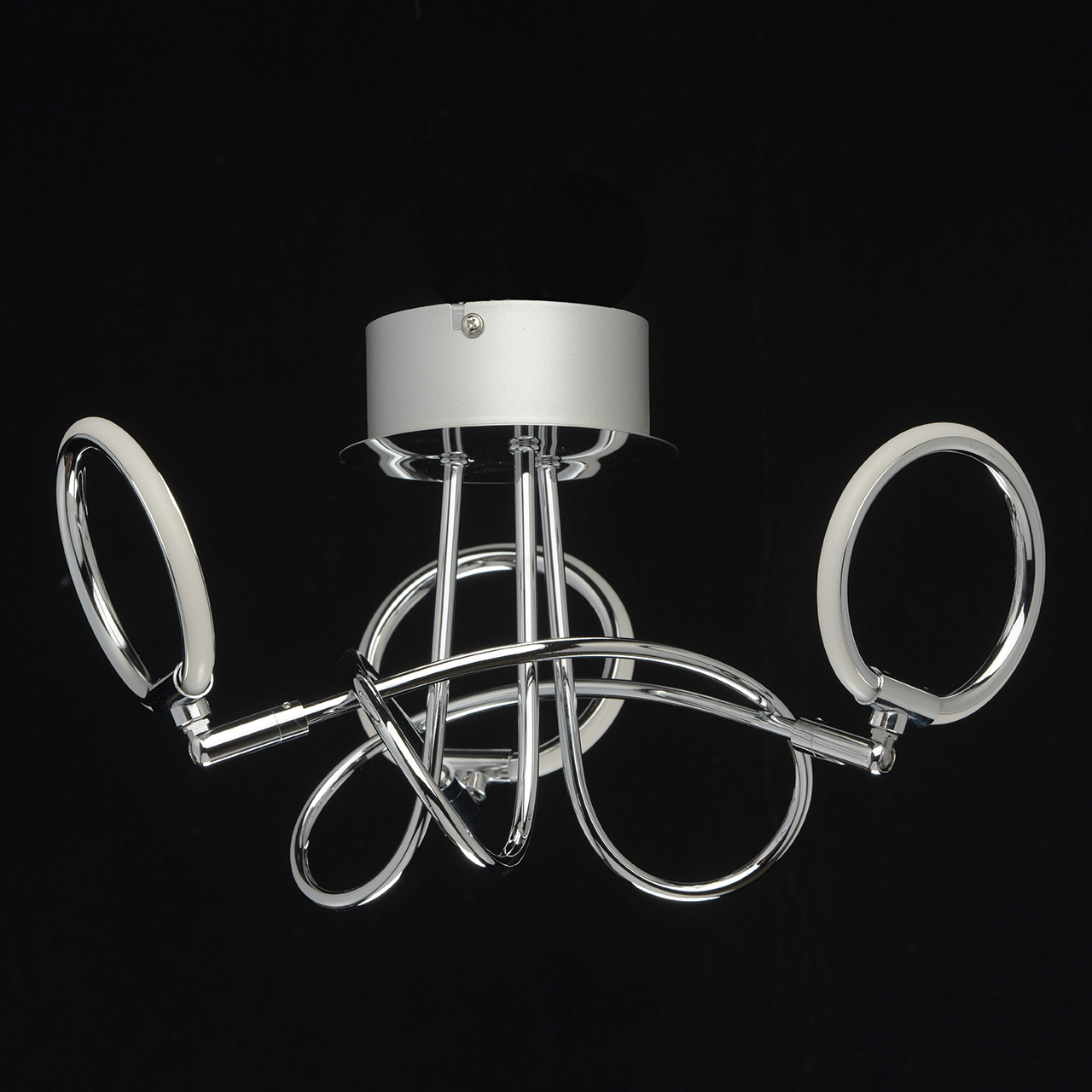 Несколько футуристичный дизайн светильника станет прекрасным дополнением современной обстановки в стиле техно, хай-тек. Причудливо изогнутое металлическое основание выполнено в трендовом оттенке матового хрома. Изогнутые рожки плавно переходят в не менее оригинальные плафоны-кольца из белого силикона. Композиция привлекает своей выдержанностью, завершенностью и нестандартным воплощением.Преимущества модели