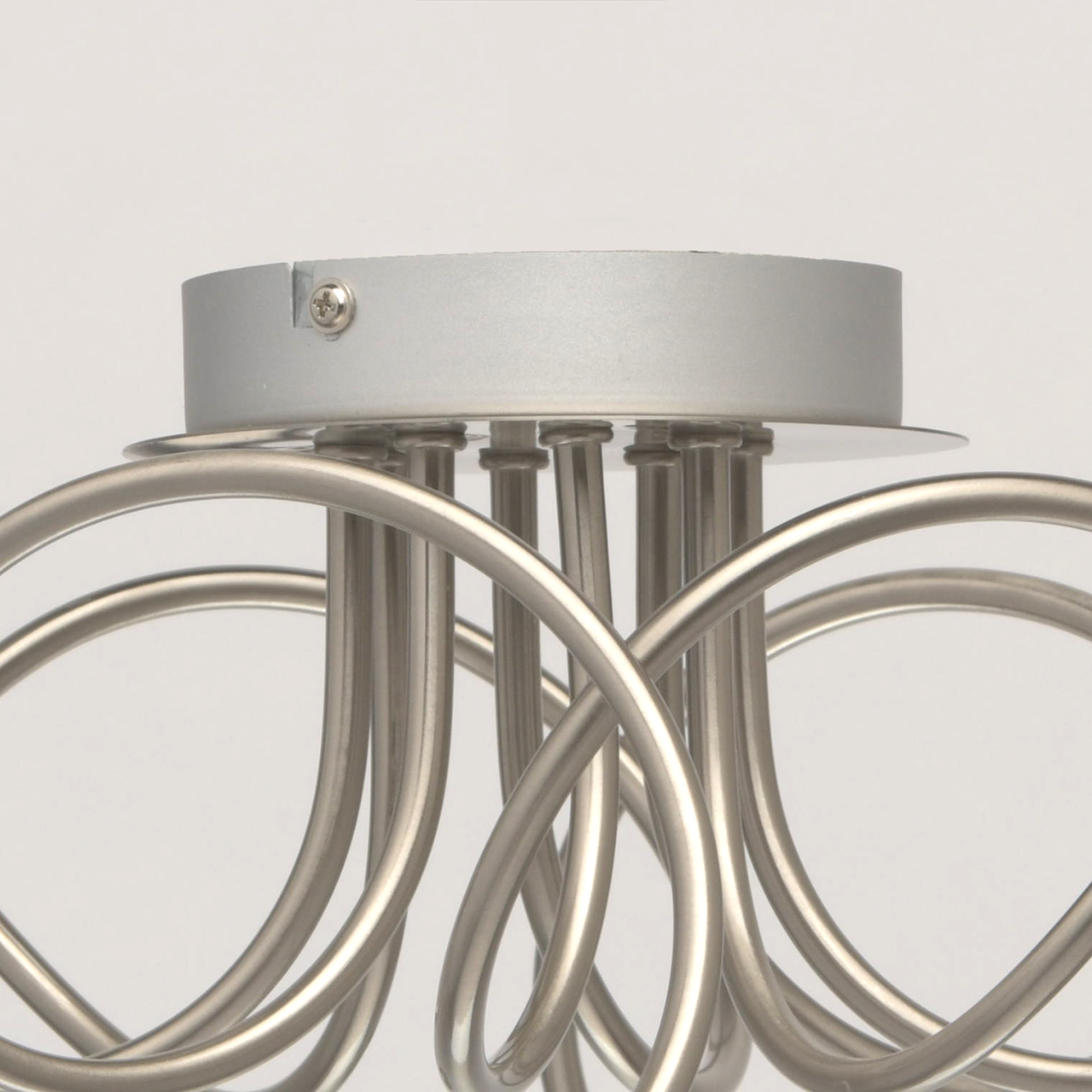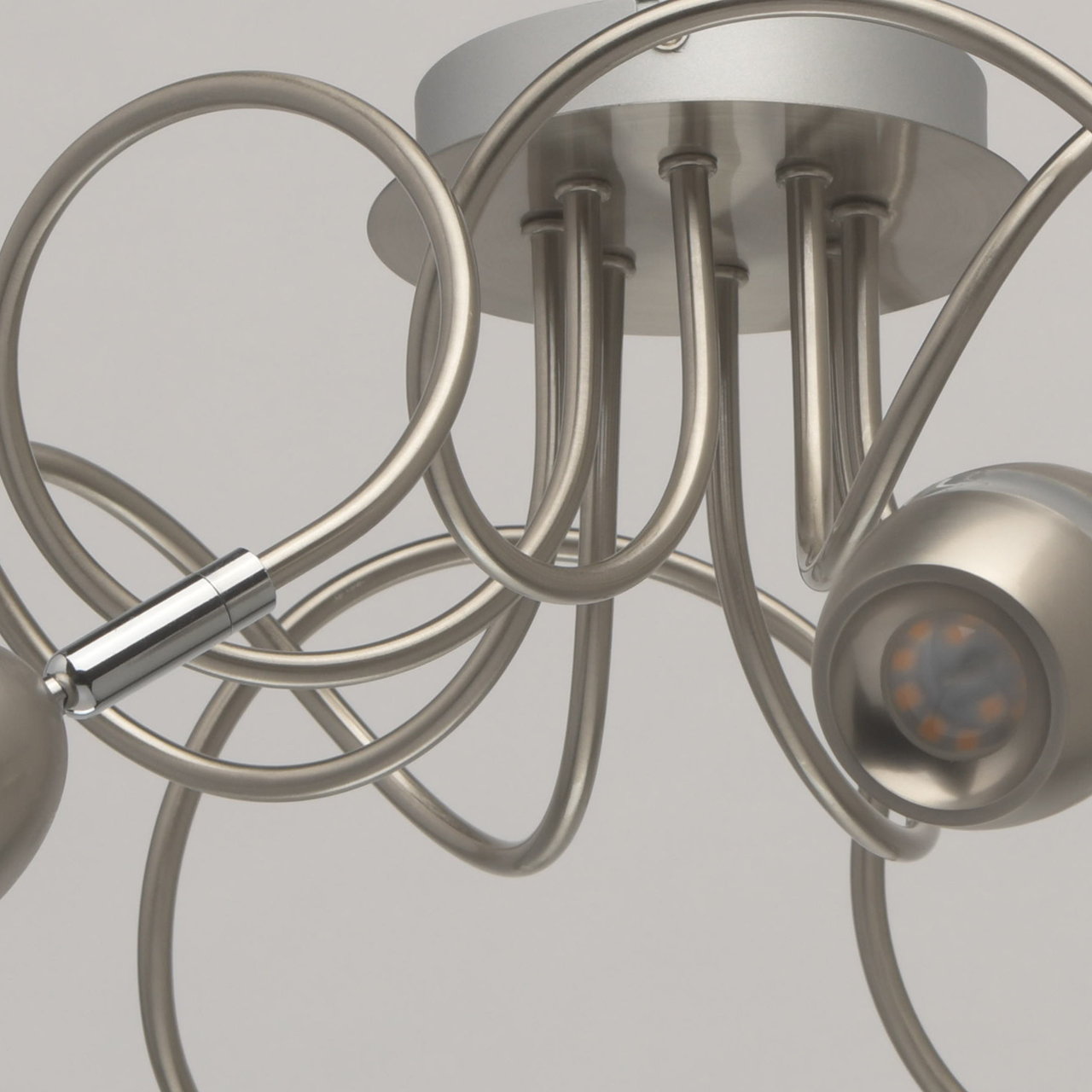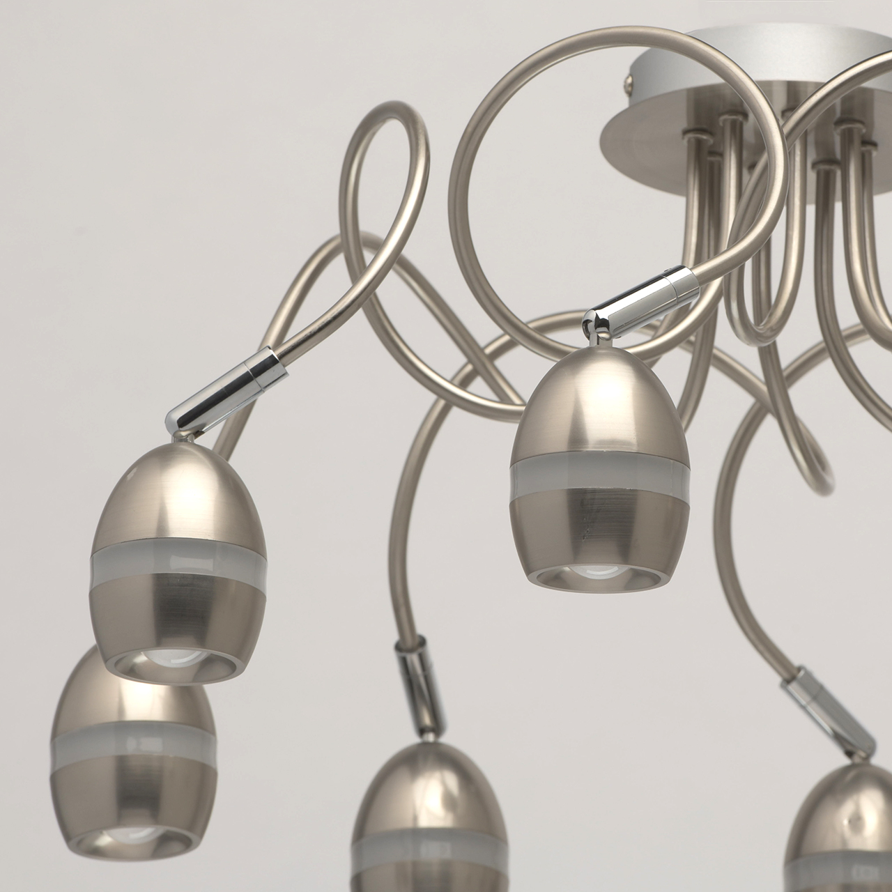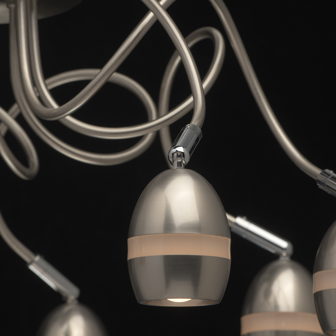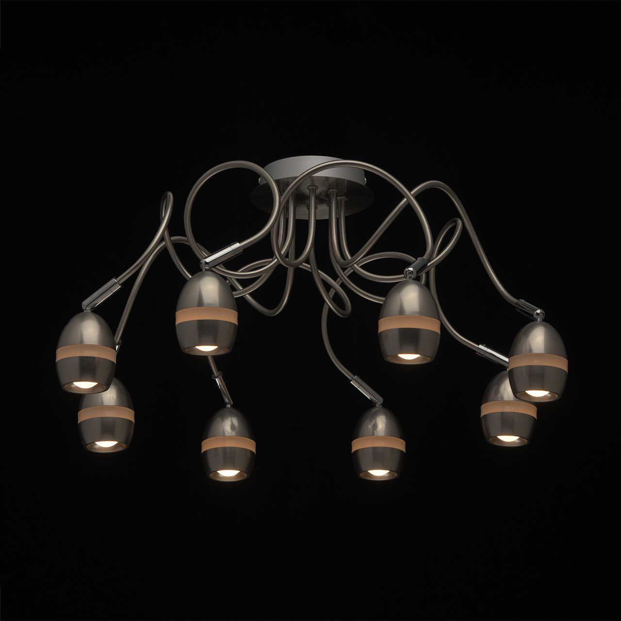 Основание и плафоны выполнены из комбинации сплавов металлов и гальванизированы в цвет матового никеля. Основание и рожки изготовлены из металла. Рожки изогнуты по технологии проката на роликовом станке. Плафоны выполнены из сплава алюминия. Светодиодные источники света типа SMD-board закрыты рассеивателями из матового акрила.Тип помещения