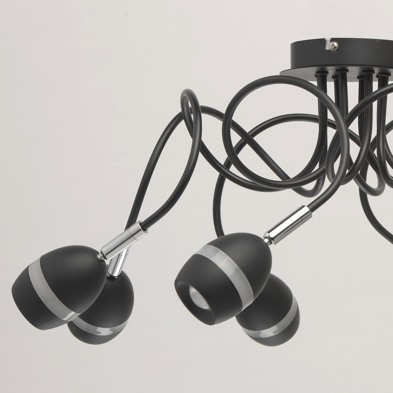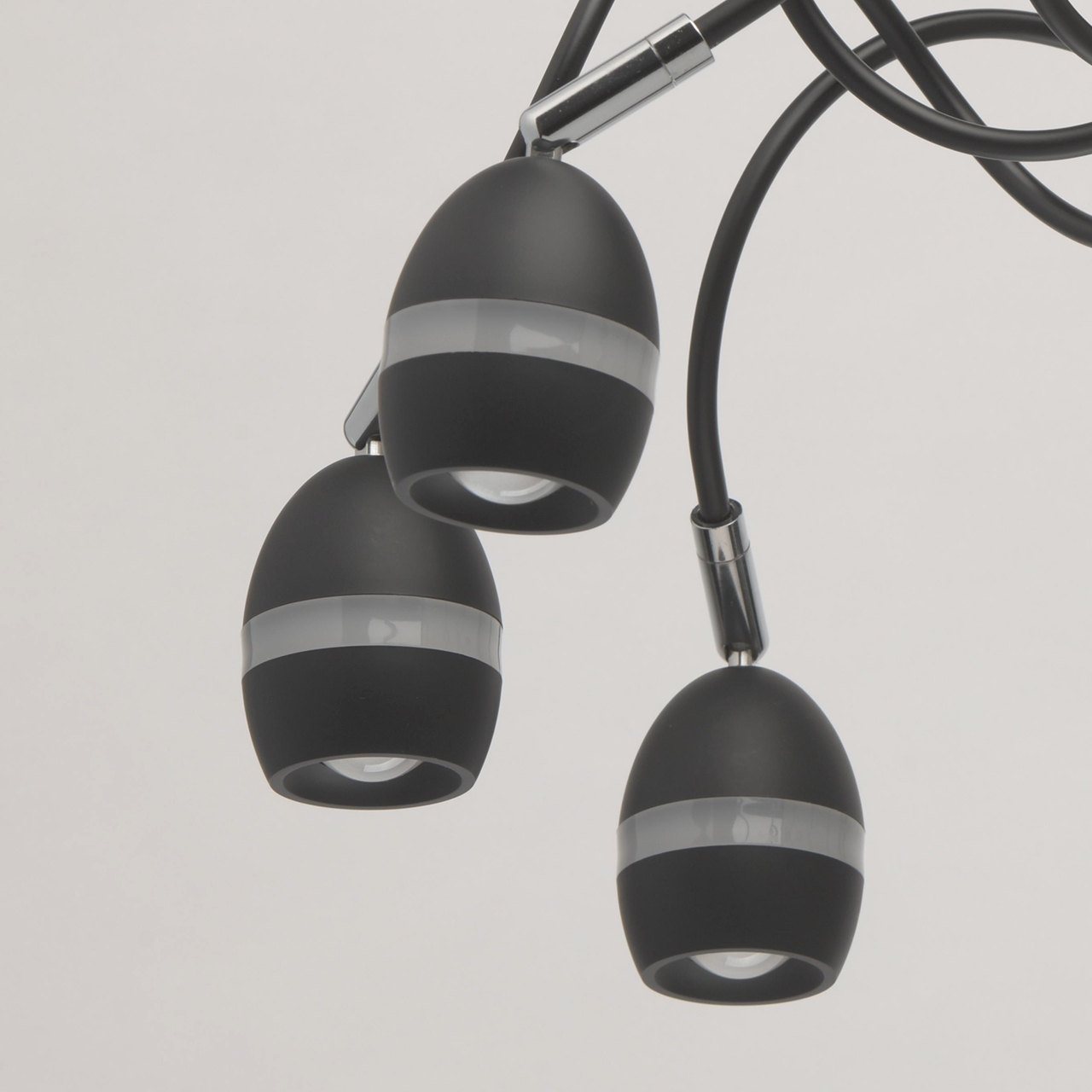 Стильный минималистичный светильник идеально подойдет для подсветки современного интерьера. Металлическое основание матового черного оттенка дополнено миниатюрными плафонами того же цвета. Их оригинальная форма подчеркнута декоративной акриловой вставкой. Помимо этого, плафоны оснащены спот-системой, а значит, можно менять направление светового потока, подстраивая его под свои нужды.Преимущества модели