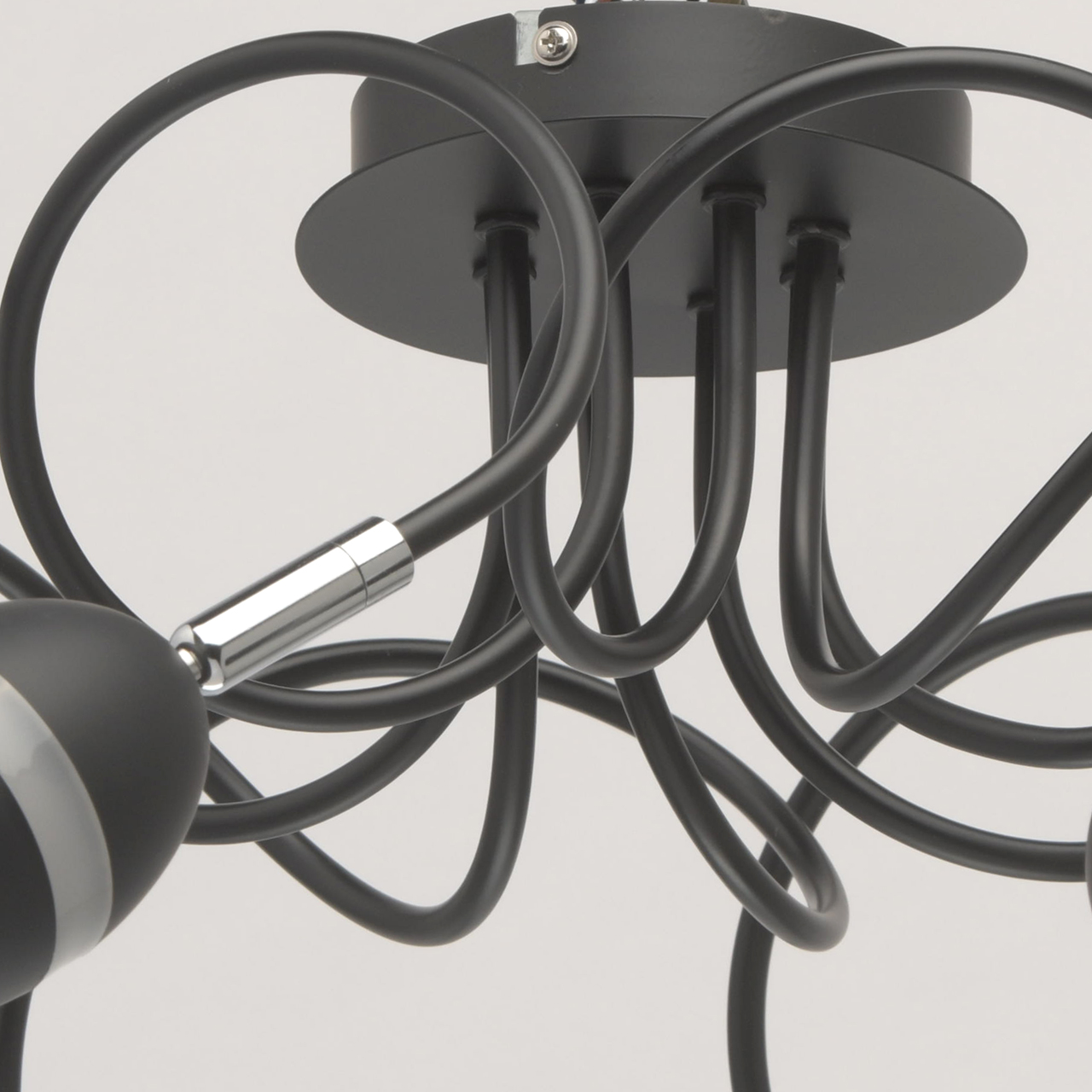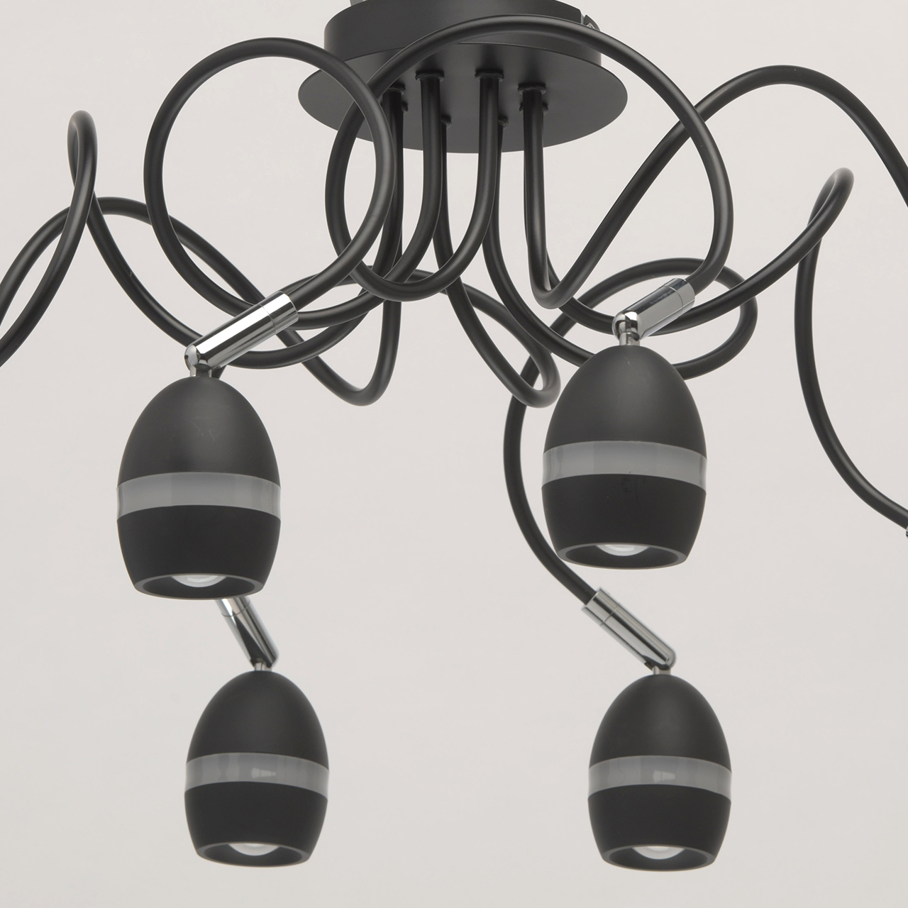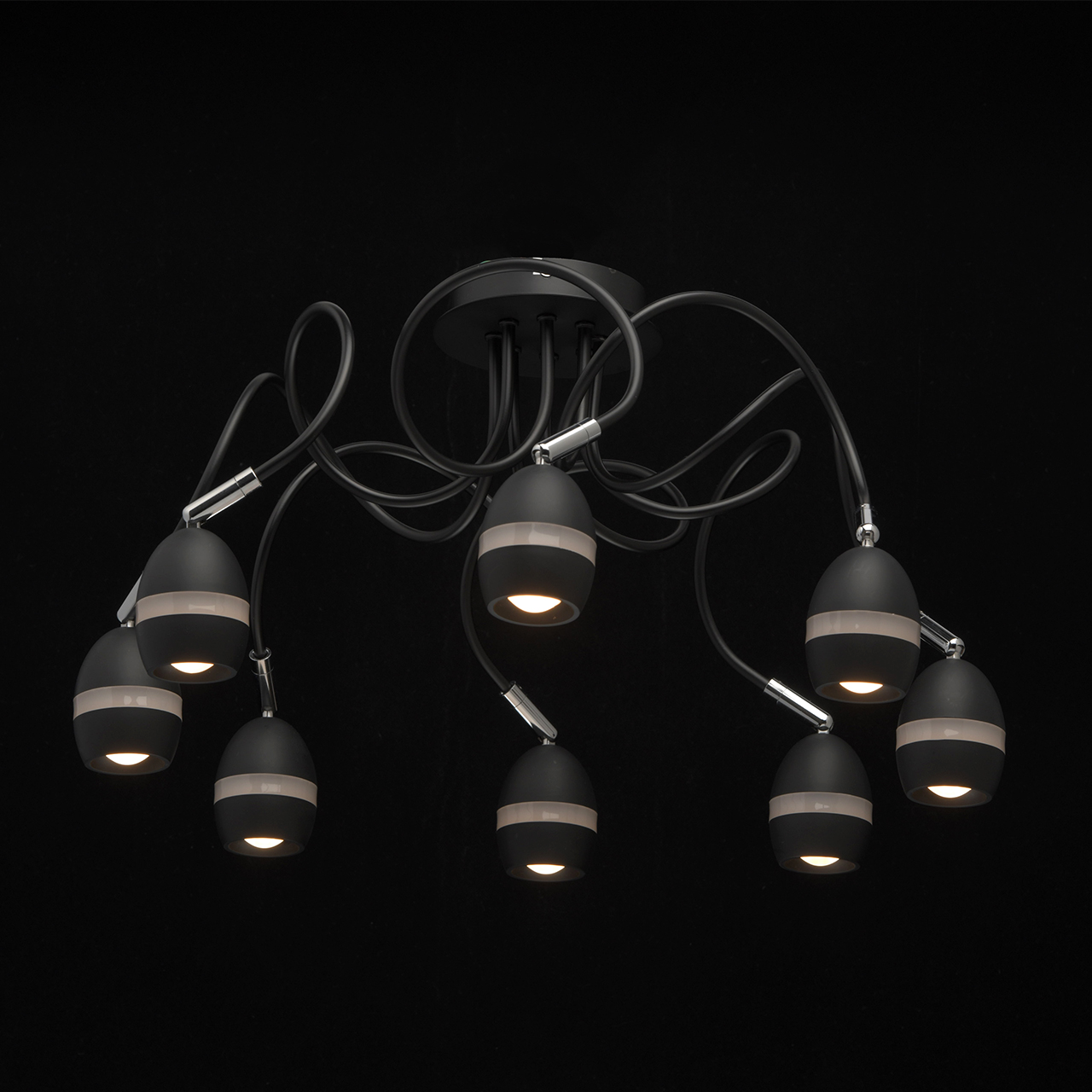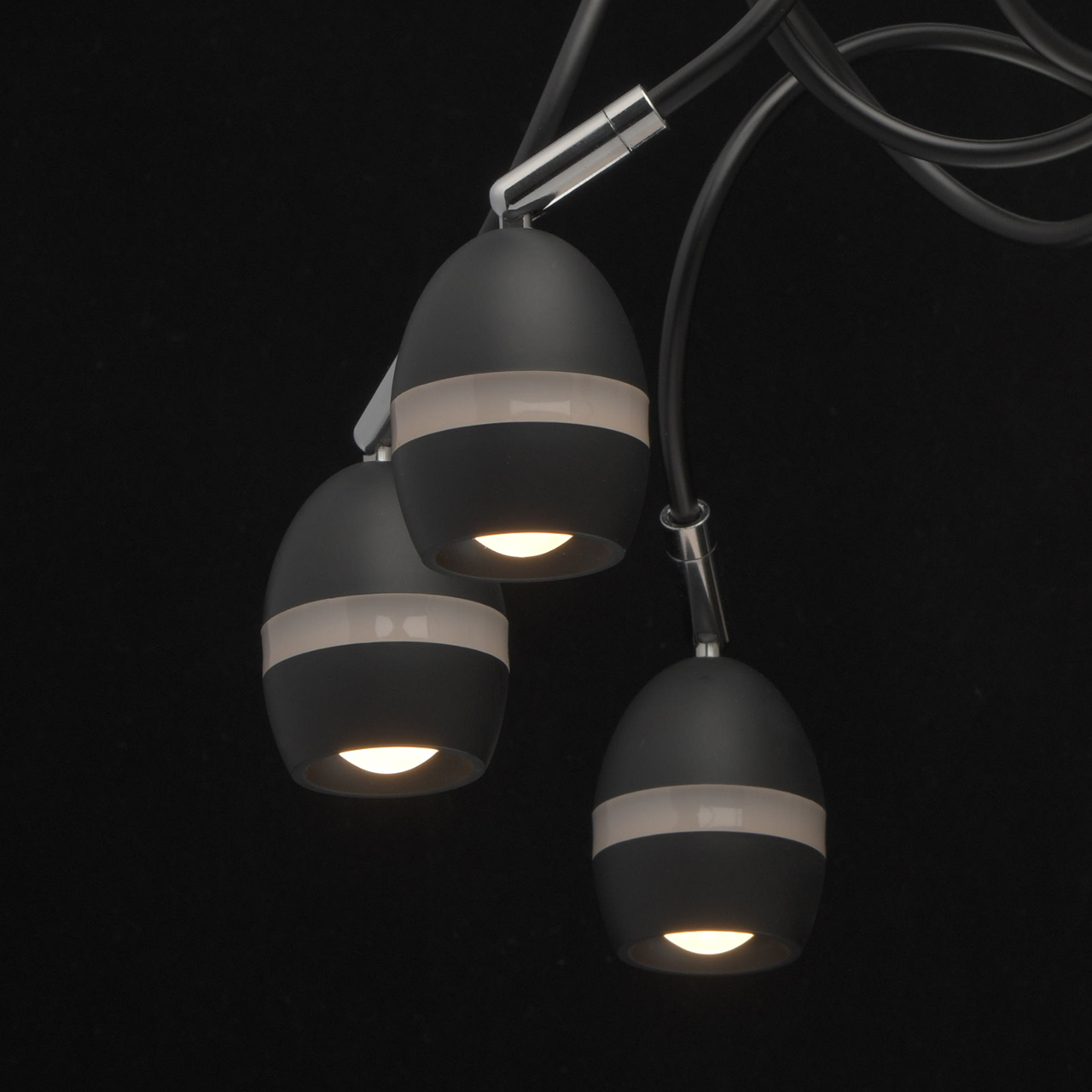 Основание и плафоны выполнены из комбинации сплавов металлов и окрашены в черный цвет. Основание и рожки изготовлены из металла. Рожки изогнуты по технологии проката на роликовом станке. Плафоны выполнены из сплава алюминия. Светодиодные источники света типа SMD-board закрыты рассеивателями из матового акрила.Тип помещения