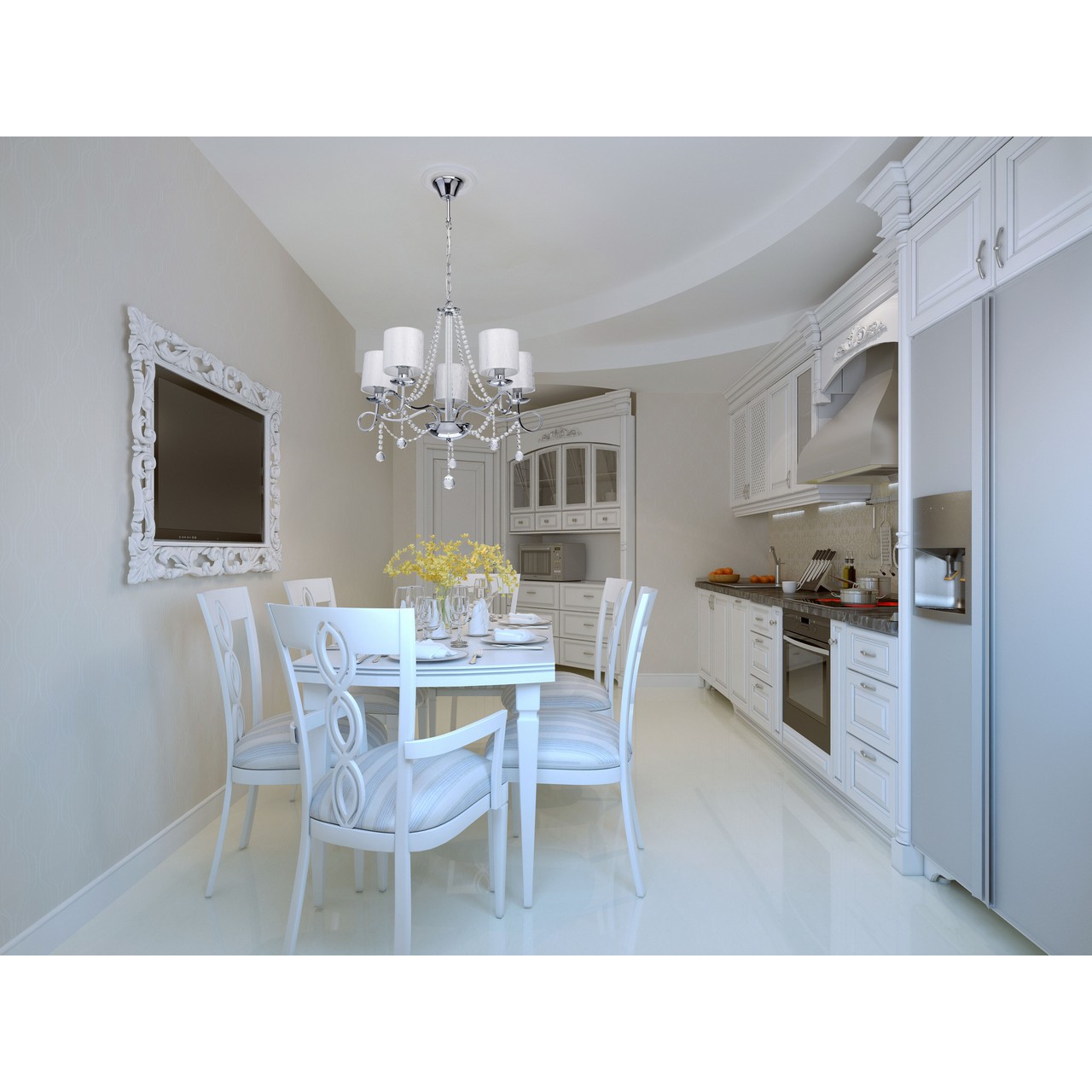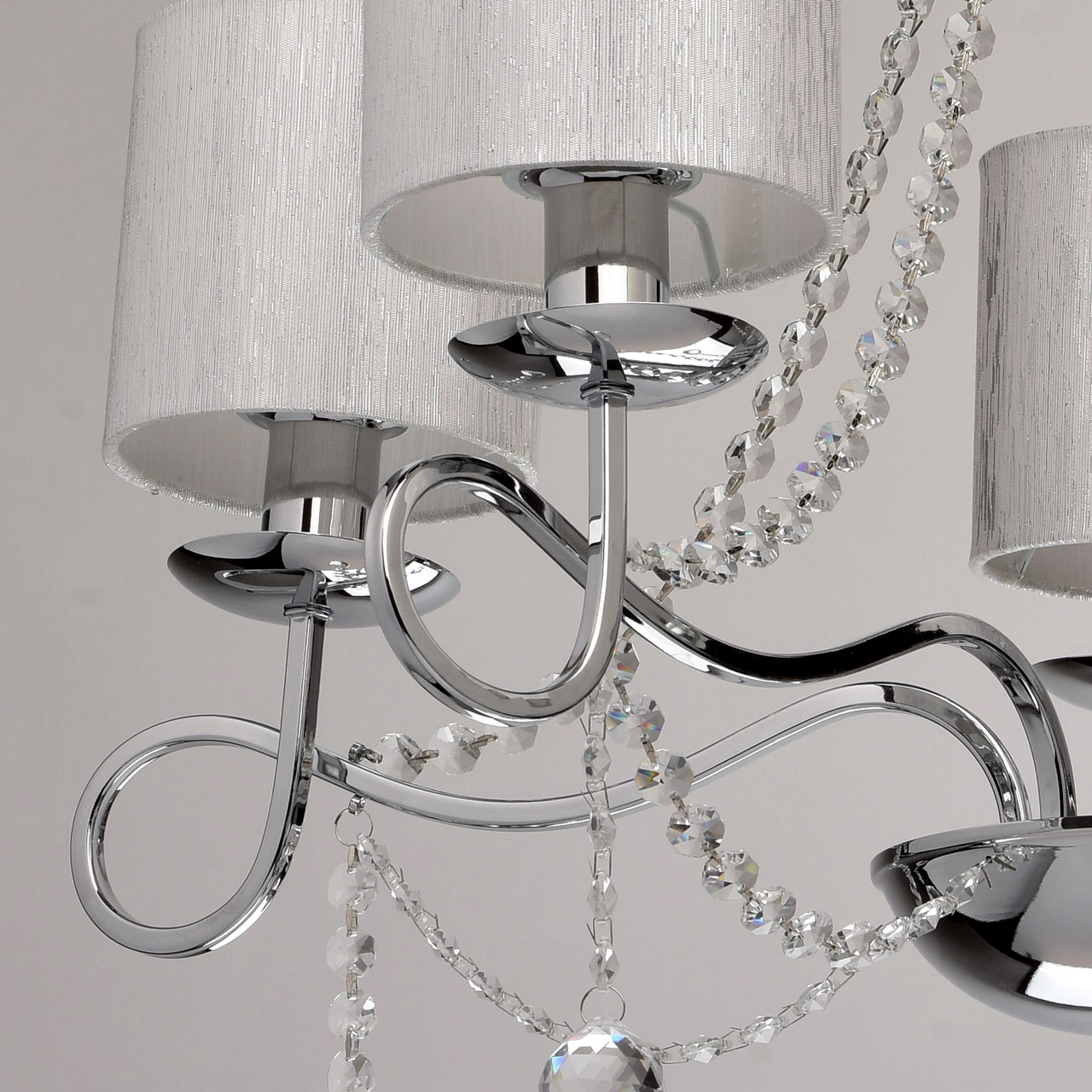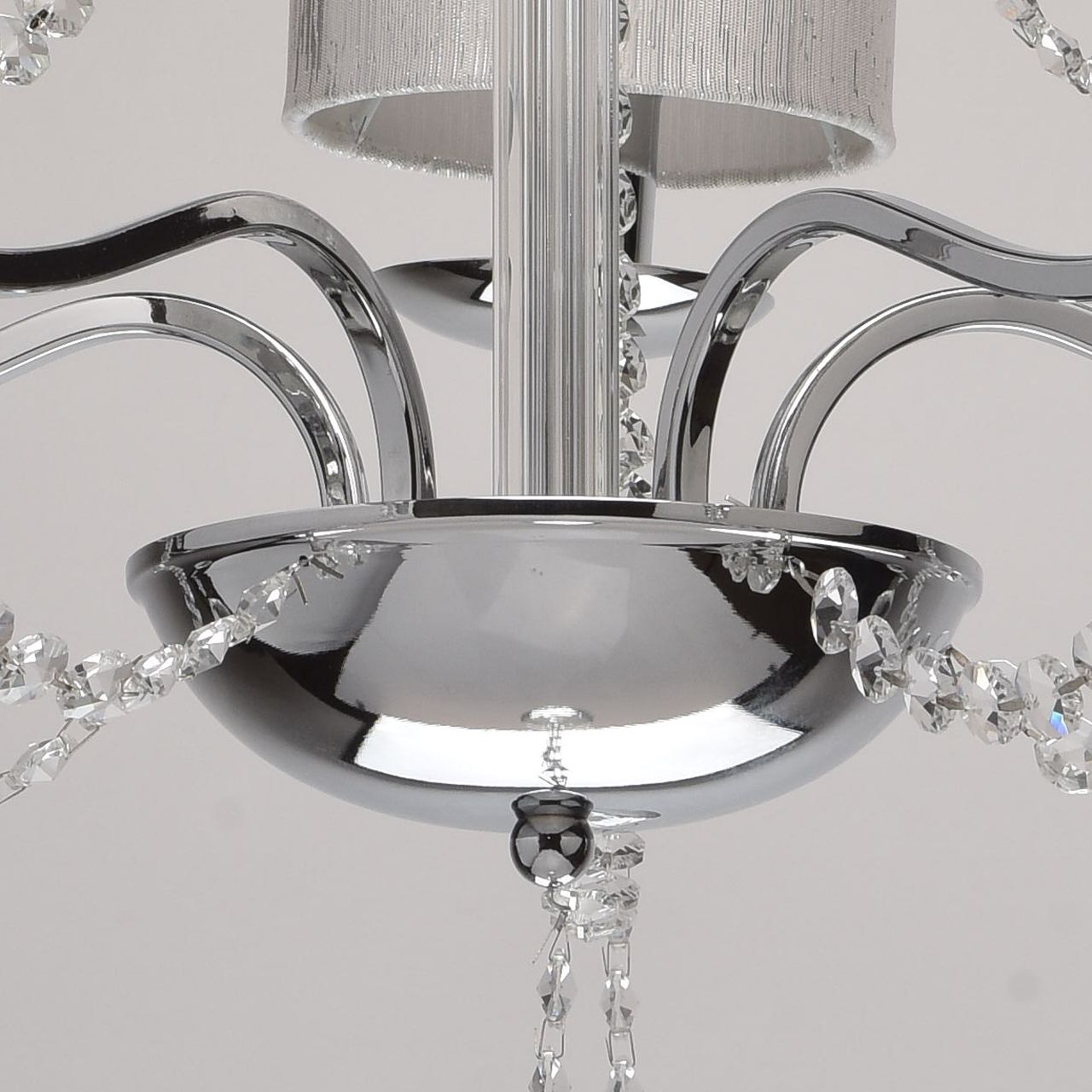 Арматура светильника выполнена из металла и гальванизирована в цвет хрома. Четырехгранные рожки сложно изогнуты по технологии проката на роликовом станке. Центральная часть декорирована прозрачным рельефным стеклом. Прошитые плафоны выполнены из белой парчи, с термостойким акрилом с внутренней стороны. Декор: хрустальные бусы и подвески из прозрачного хрусталя.Тип помещения