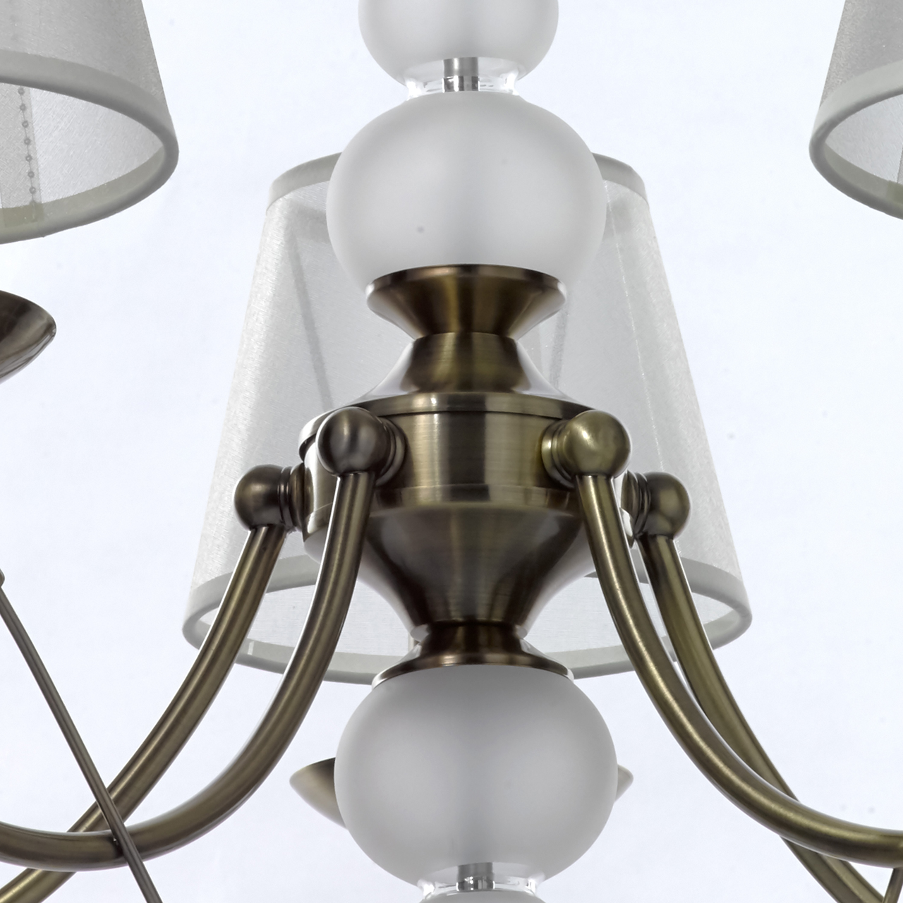 Основание светильника выполнено из металла и гальванизировано в цвет античной бронзы с лакированием. Центральная ось светильника декорирована стеклянными матированными сферами ручной выдувки. Светильник декорирован двусторонними текстильными абажурами с термостойким акрилом внутри и прозрачным хрусталем вытянутой формы. Абажуры отделаны кантами и прошиты.Тип помещения