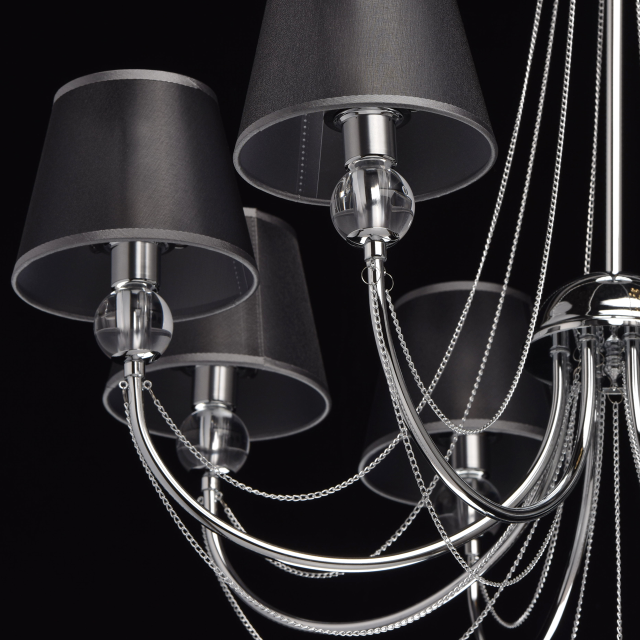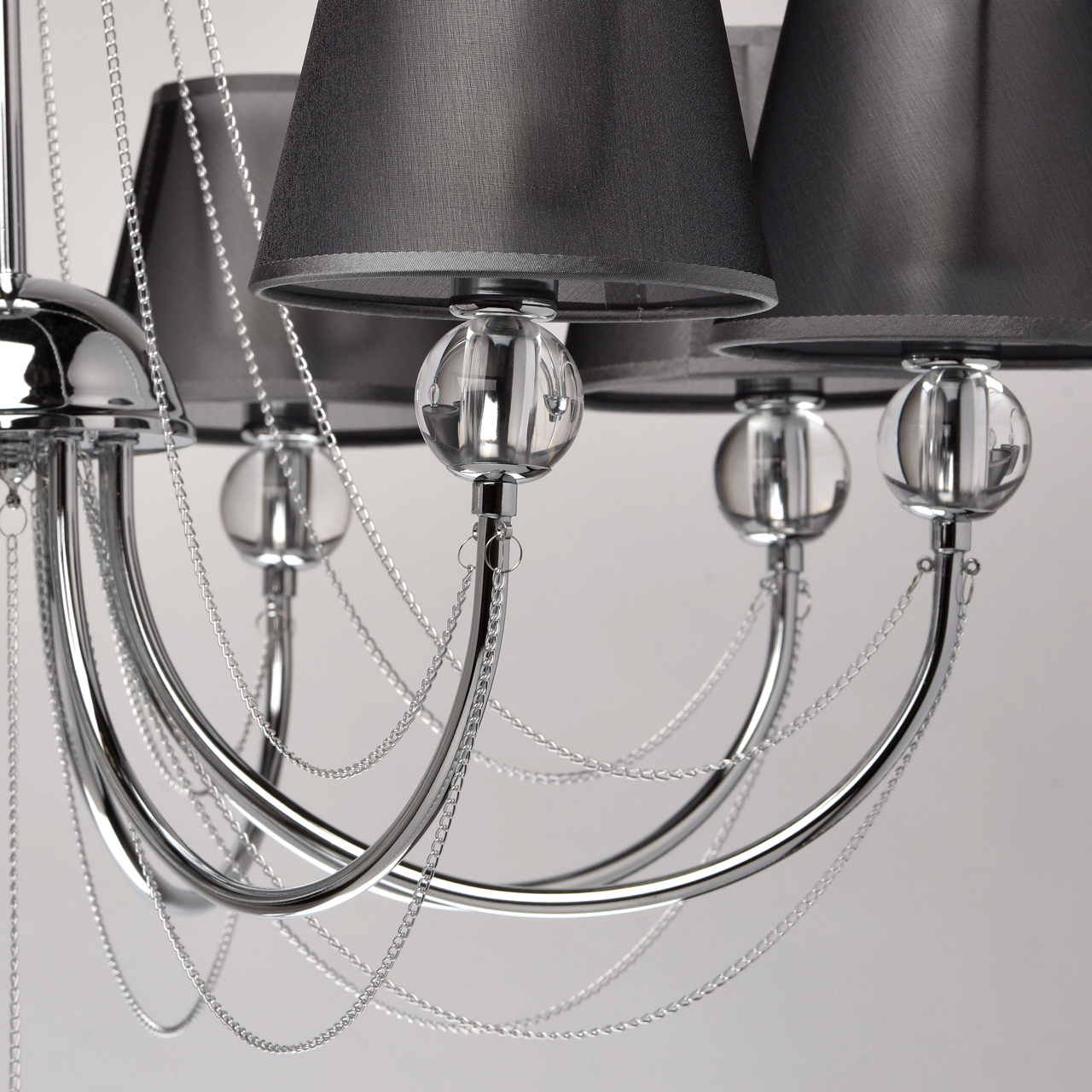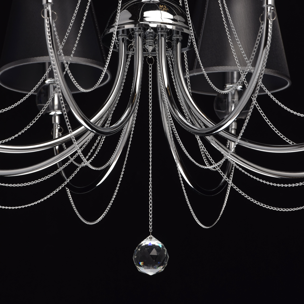 Арматура светильника выполнена из металла и гальванизирована в цвет хрома. Рожки выполнены по технологии проката на роликовом станке. Розетки выполнены из прозрачного акрила в виде шара. Двойные плафоны: выполнены из органзы графитового цвета, с атласным кантом серого цвета и с термостойким акрилом с внутренней стороны, прошиты. Декор: цепочки гальванизированы в цвет арматуры, центральная подвеска декорирована прозрачным хрустальным шаром.Тип помещения