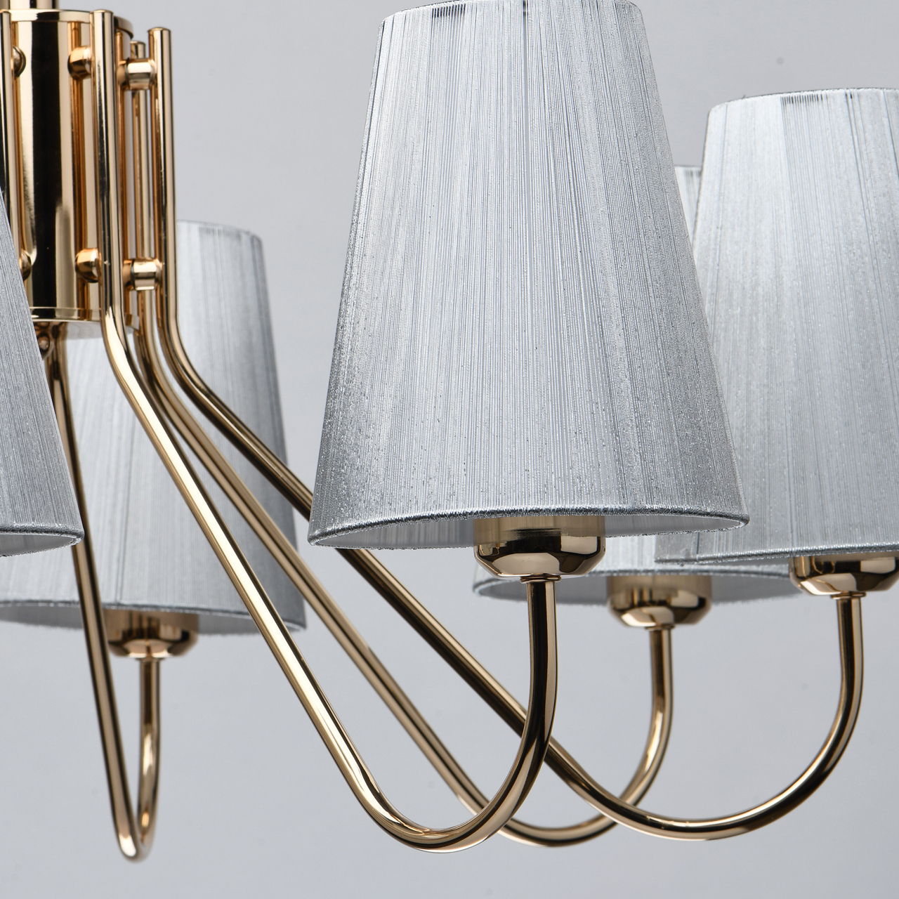 Металлическое основание светильника гальванизировано в цвет золота. Светильник декорирован двойными текстильными абажурами из нитей стального цвета и с термостойким акрилом внутри.Тип помещения