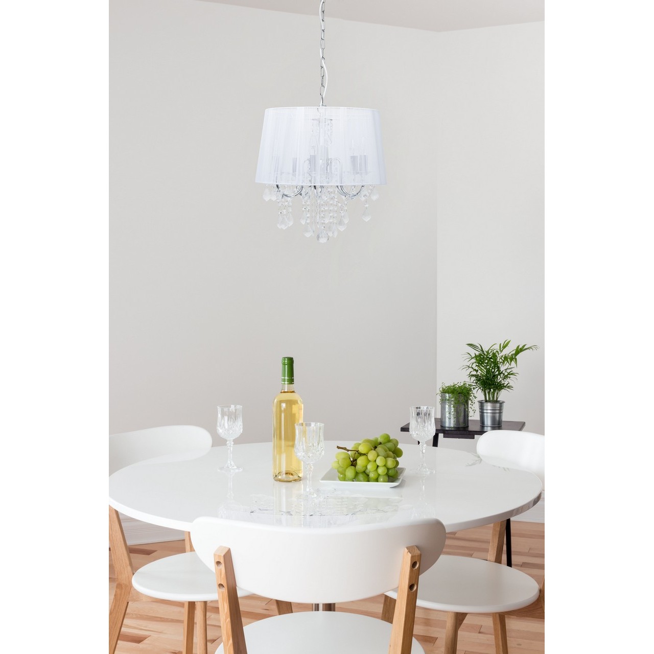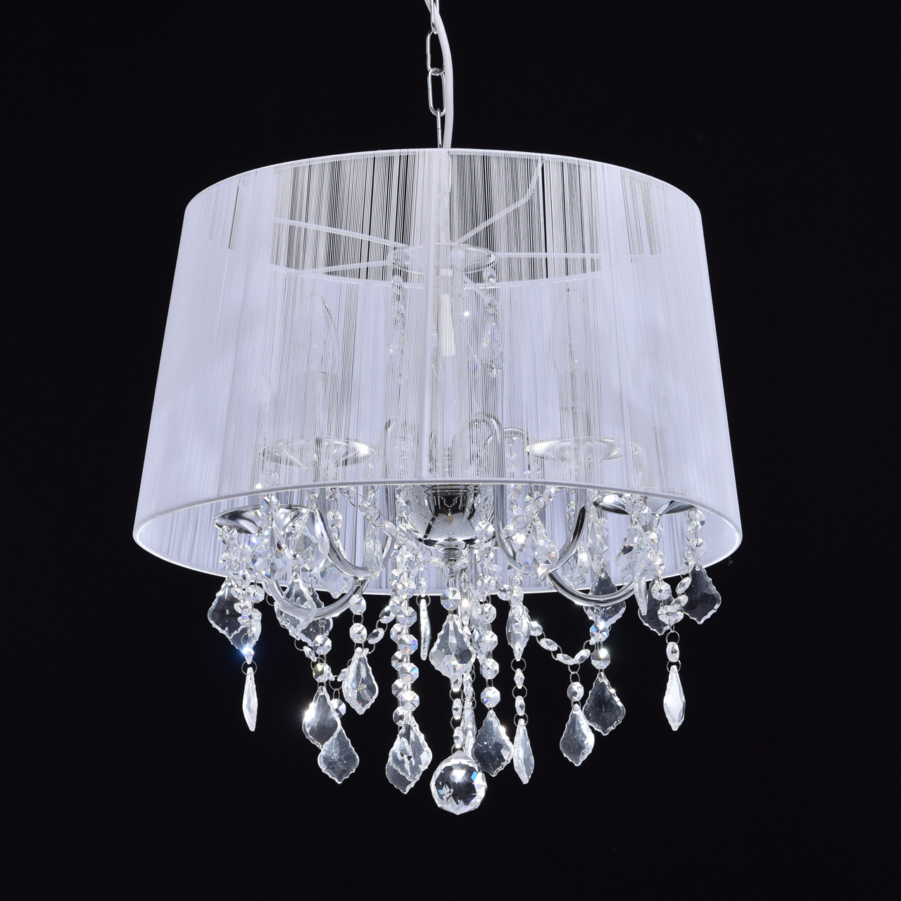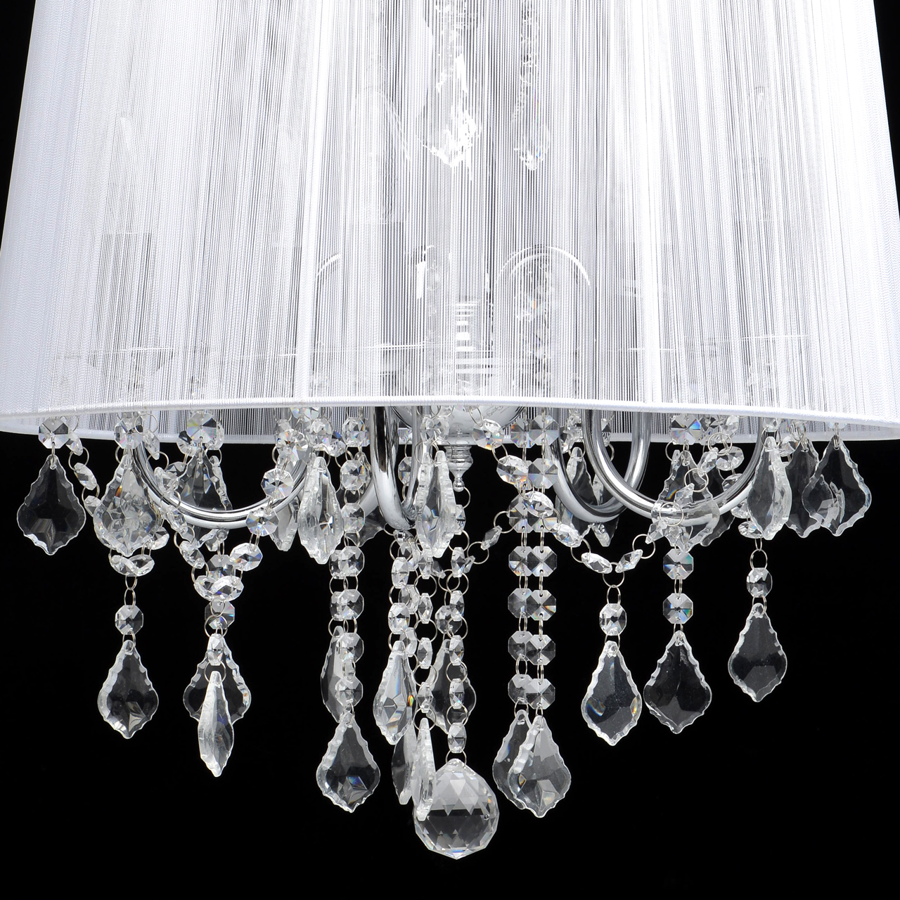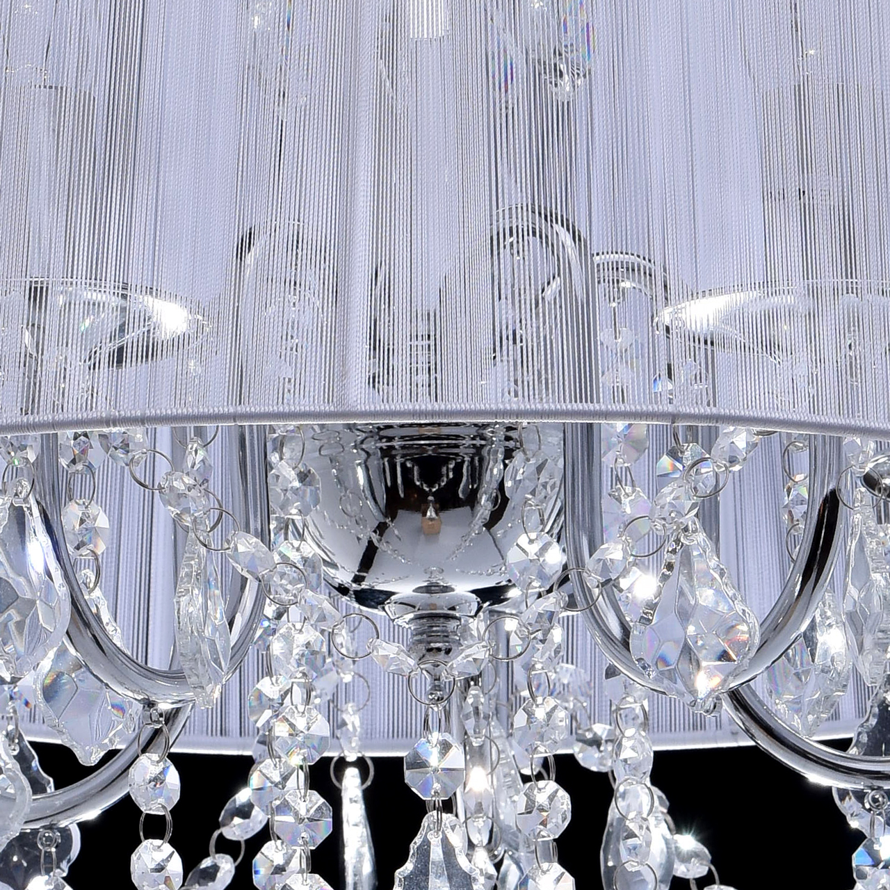 Арматура светильника выполнена из сплава железа и гальванизирована в цвет хрома. Абажур белого цвета выполнен из капроновой нити на металлическом каркасе. Светильник декорирован подвесами из прозрачного хрусталяТип помещения
