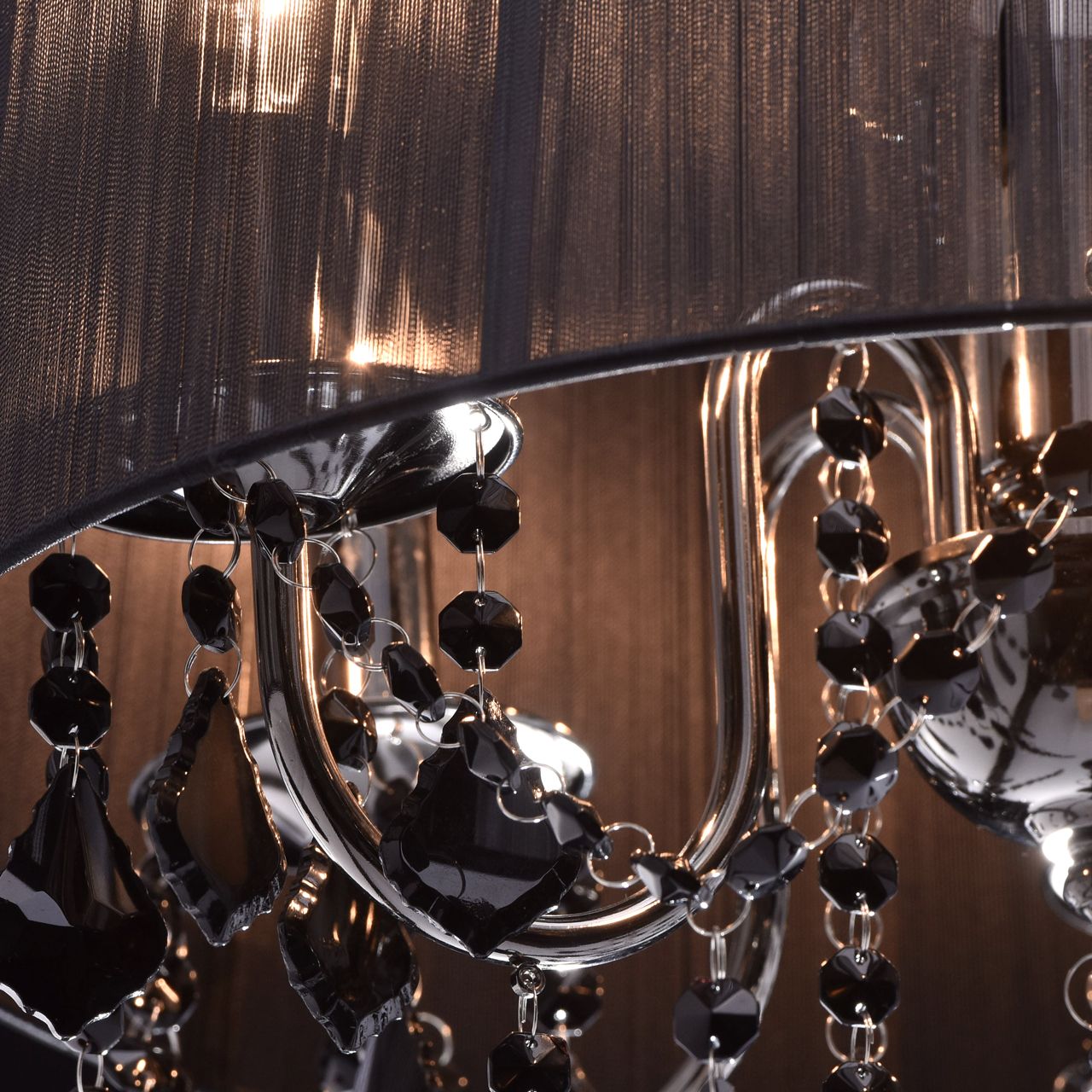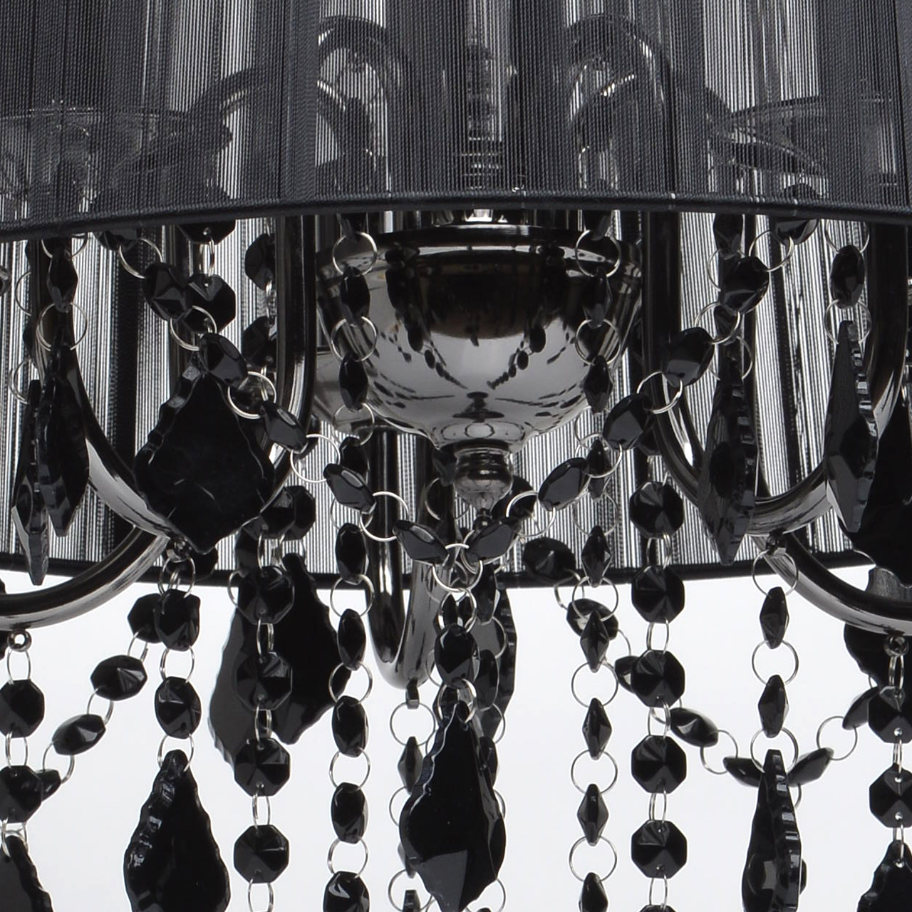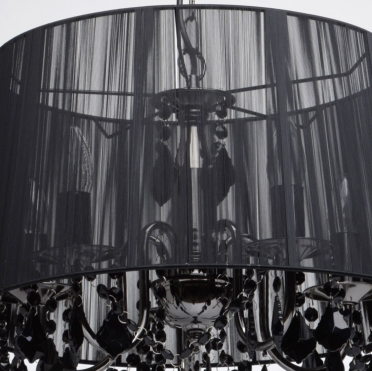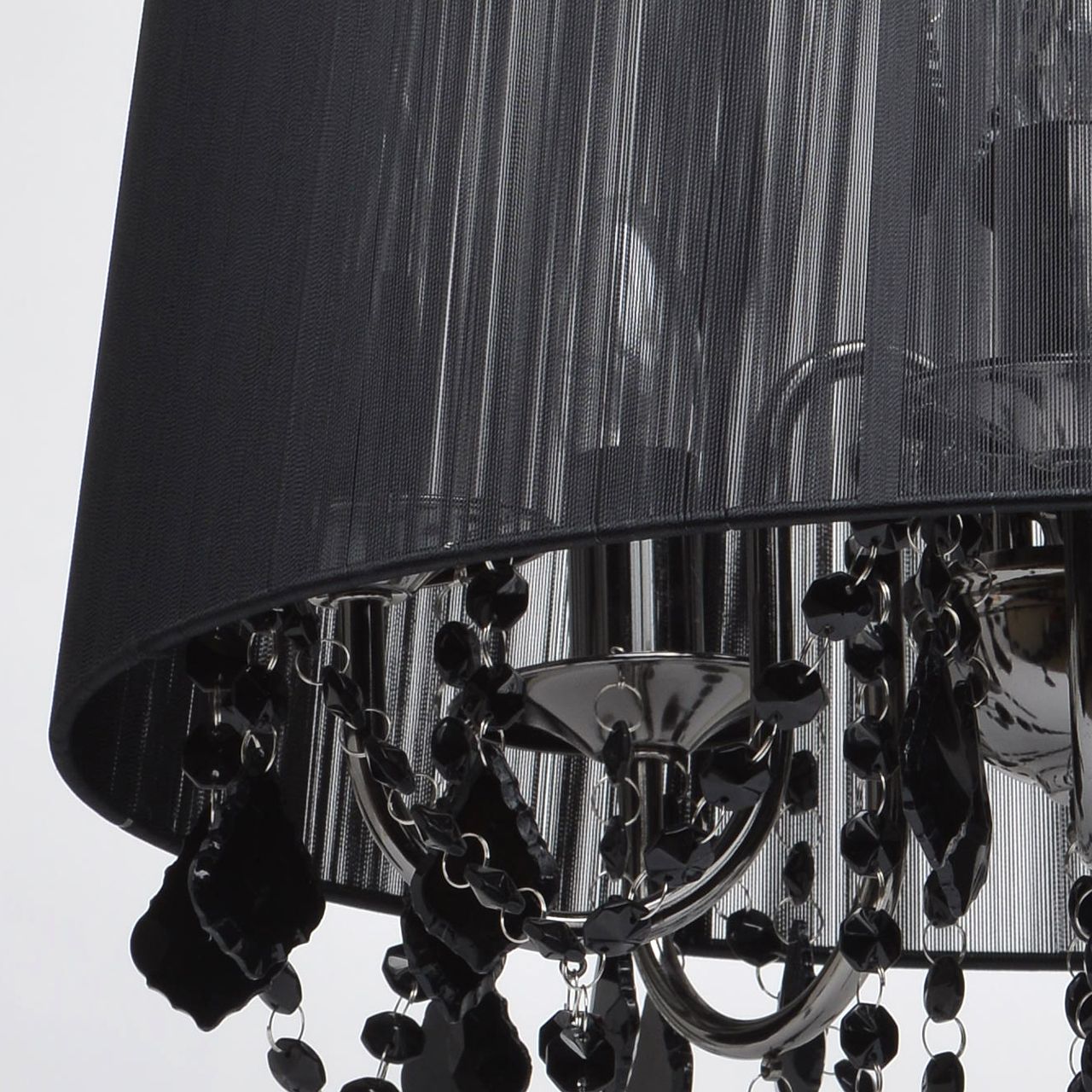 Арматура выполнена из сплава железа и гальванизирована в цвет никеля. Абажур черного цвета из капроновой нити на металлическом каркасе. Светильник декорирован подвесами из хрусталя, окрашенного в массе в черный цвет.Тип помещения