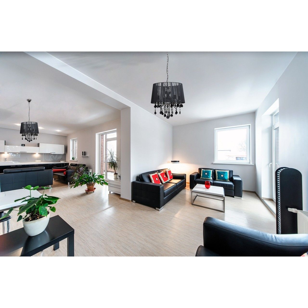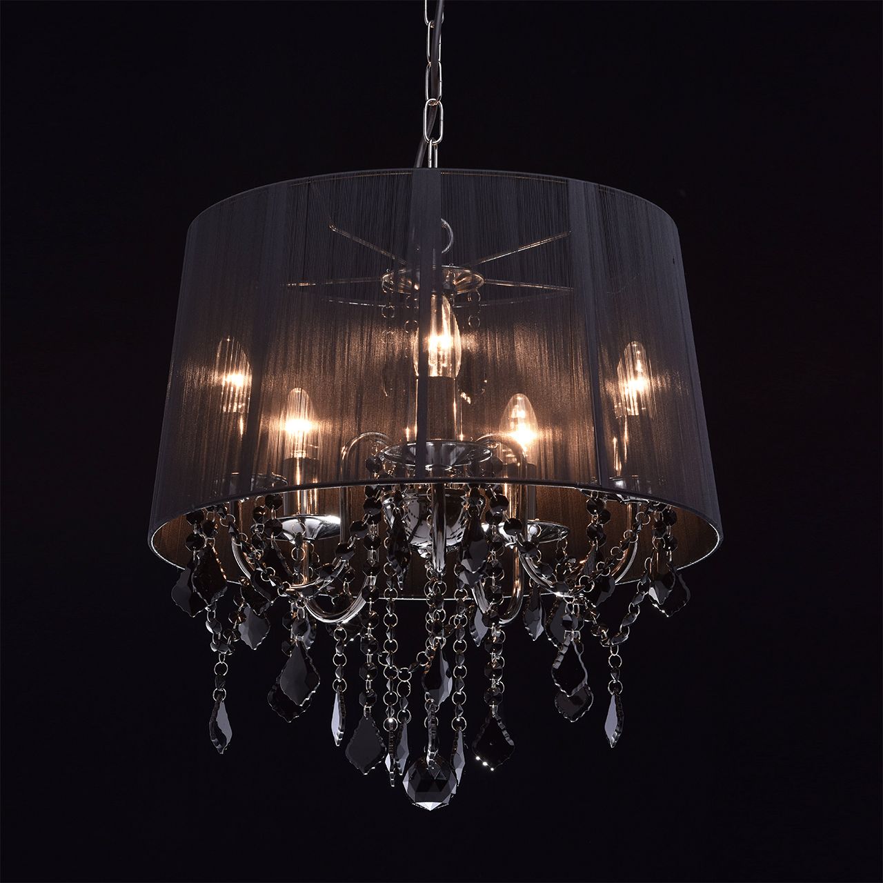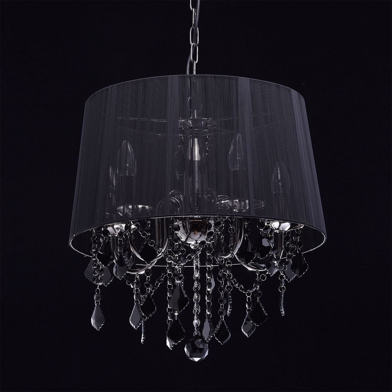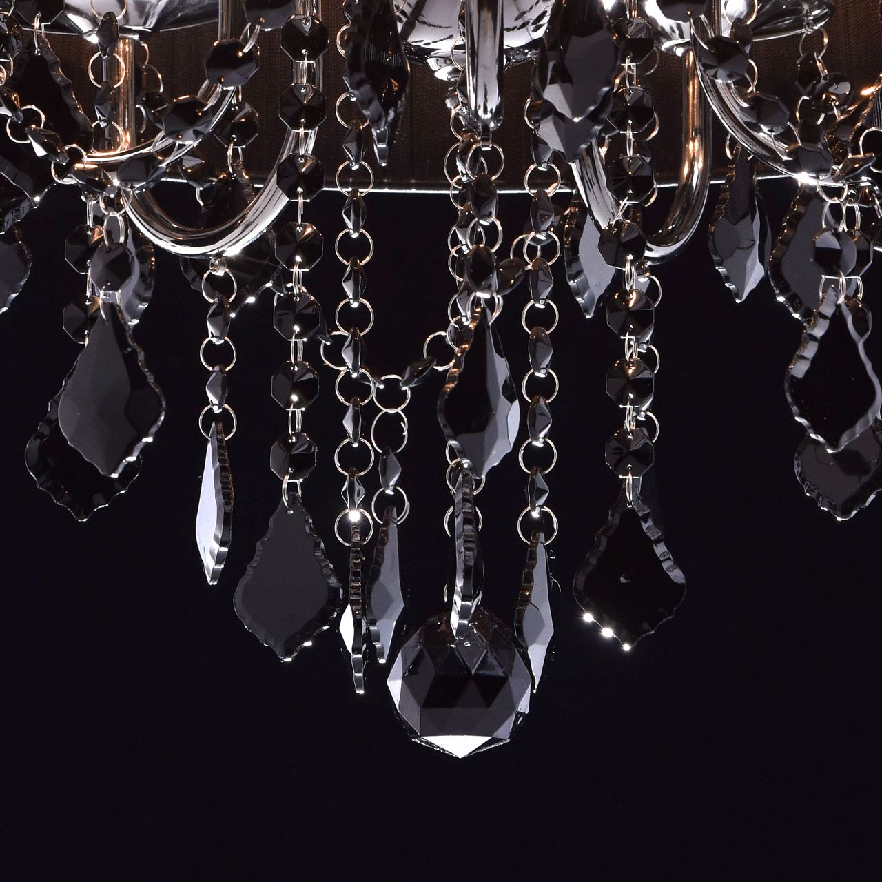 Арматура выполнена из сплава железа и гальванизирована в цвет никеля. Абажур черного цвета из капроновой нити на металлическом каркасе. Светильник декорирован подвесами из хрусталя, окрашенного в массе в черный цвет.Тип помещения