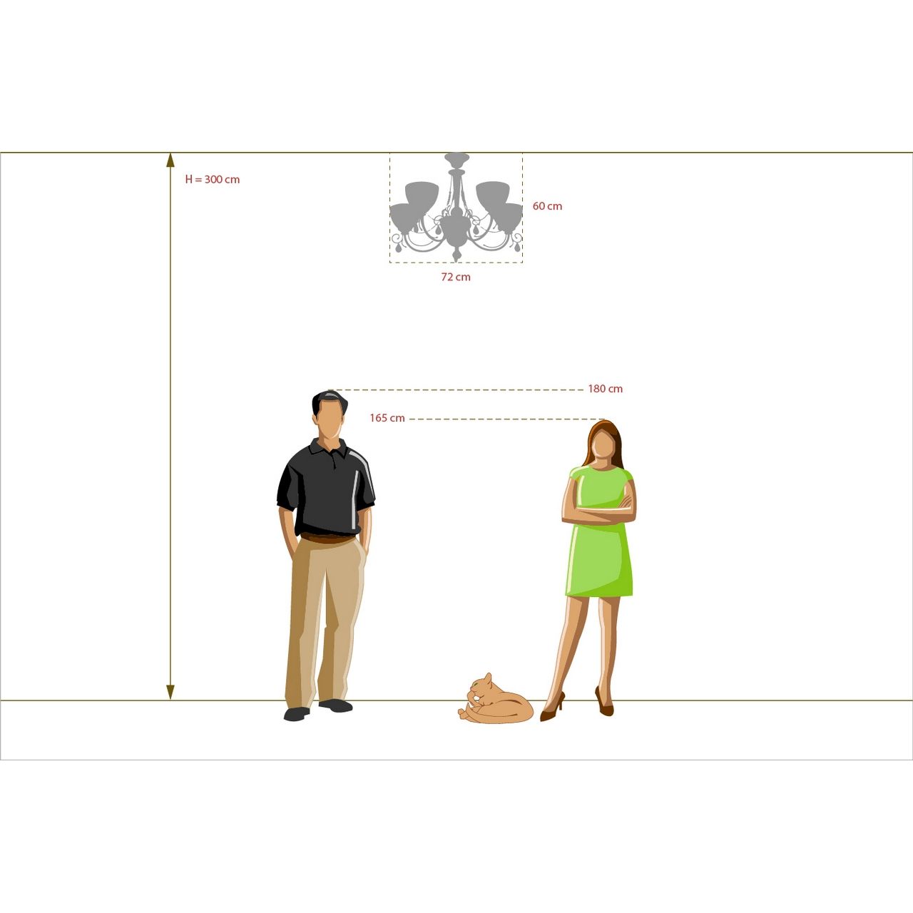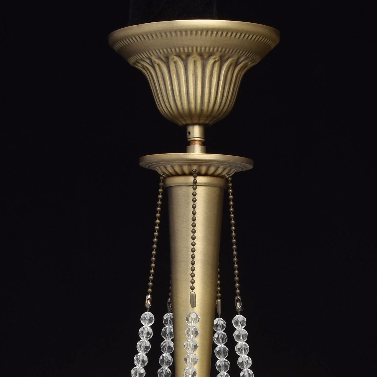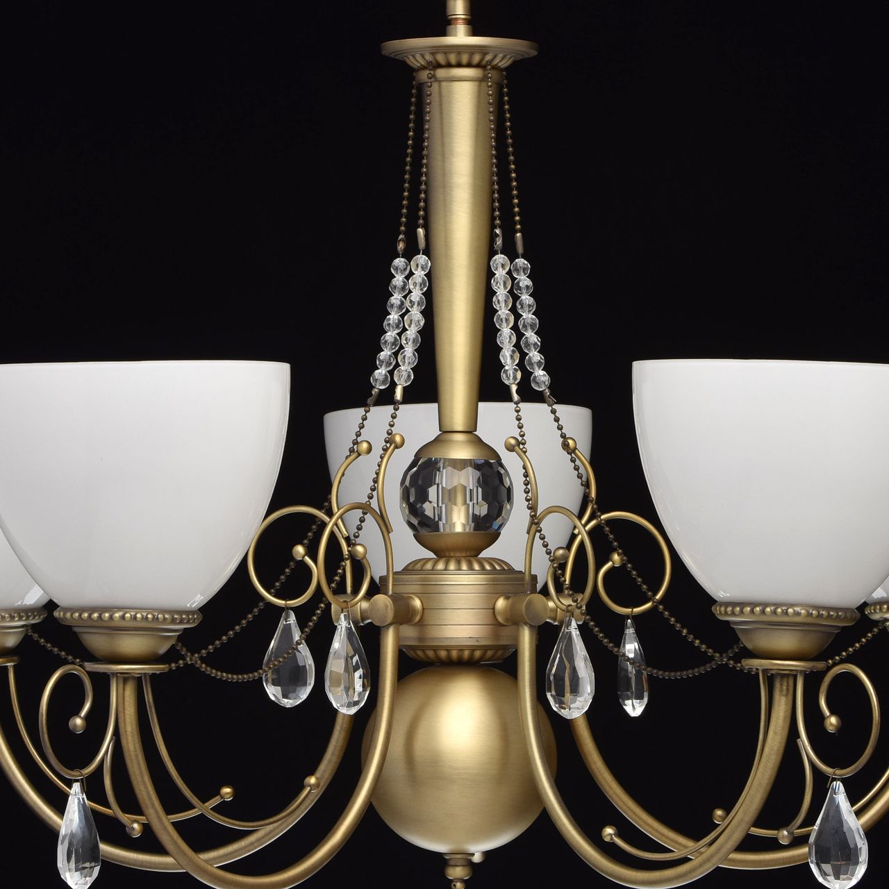 Арматура светильника выполнена из сплава железа и гальванизирована в цвет бронзы. Декоративная сфера на центральной оси выполнена по технологии токарной обработки. Основание и декоративные розетки выполнены по технологии прессования. Светильник декорирован плафонами из стекла, окрашенного в массе, массивом хрусталя, цепочками с хрустальными бусами и подвесками из хрусталя сложной огранки.Тип помещения