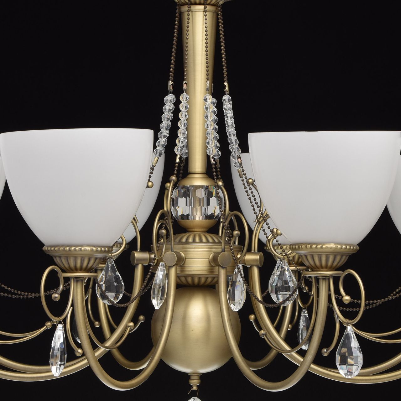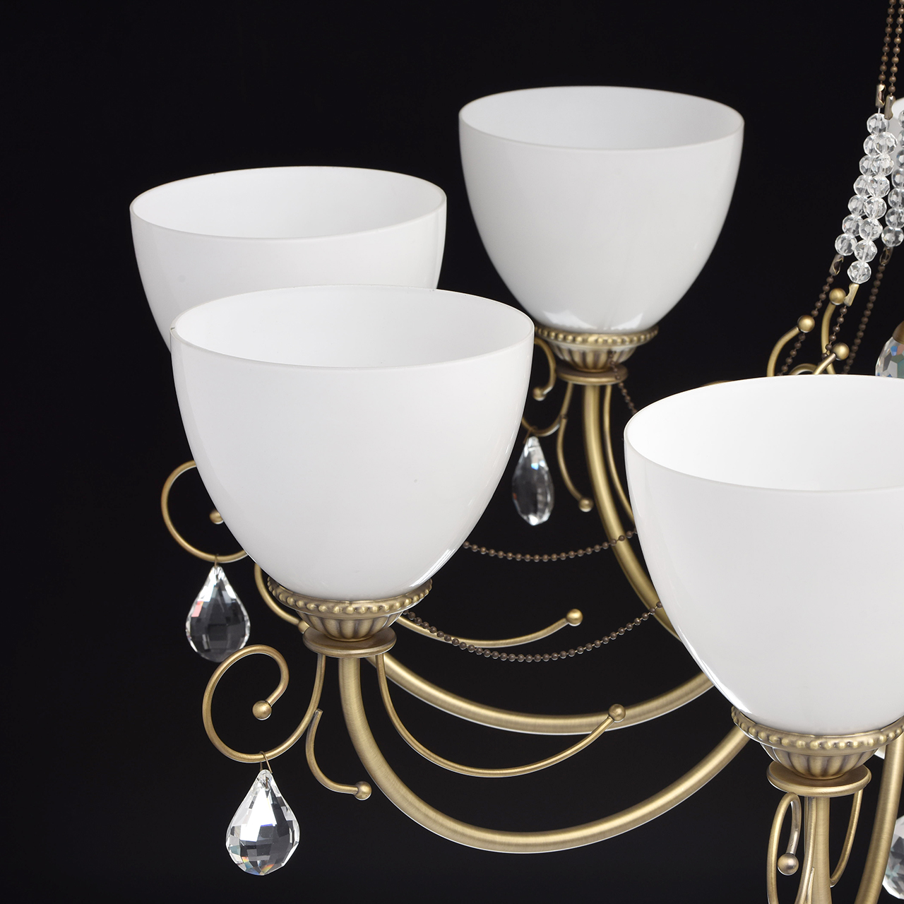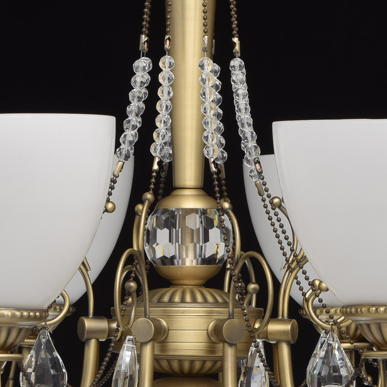 Элегантная и нарядная люстра Фелиция стиля "Классик" станет отличным выбором для жилого пространства с элементами классики. Металлическое основание цвета античной бронзы имеет строгую классическую форму, праздничность всему облику придают подвески из крупного прозрачного хрусталя. Стеклянные плафоны направляют лучи света вверх, которые рассеиваются и равномерно распределяются по периметру помещения. Светильник по стилистике подходит для классических интерьеров, и достойно украсит гостиную, жилые комнаты, кабинет или просторный холл площадью до 24 кв.м.Преимущества модели
